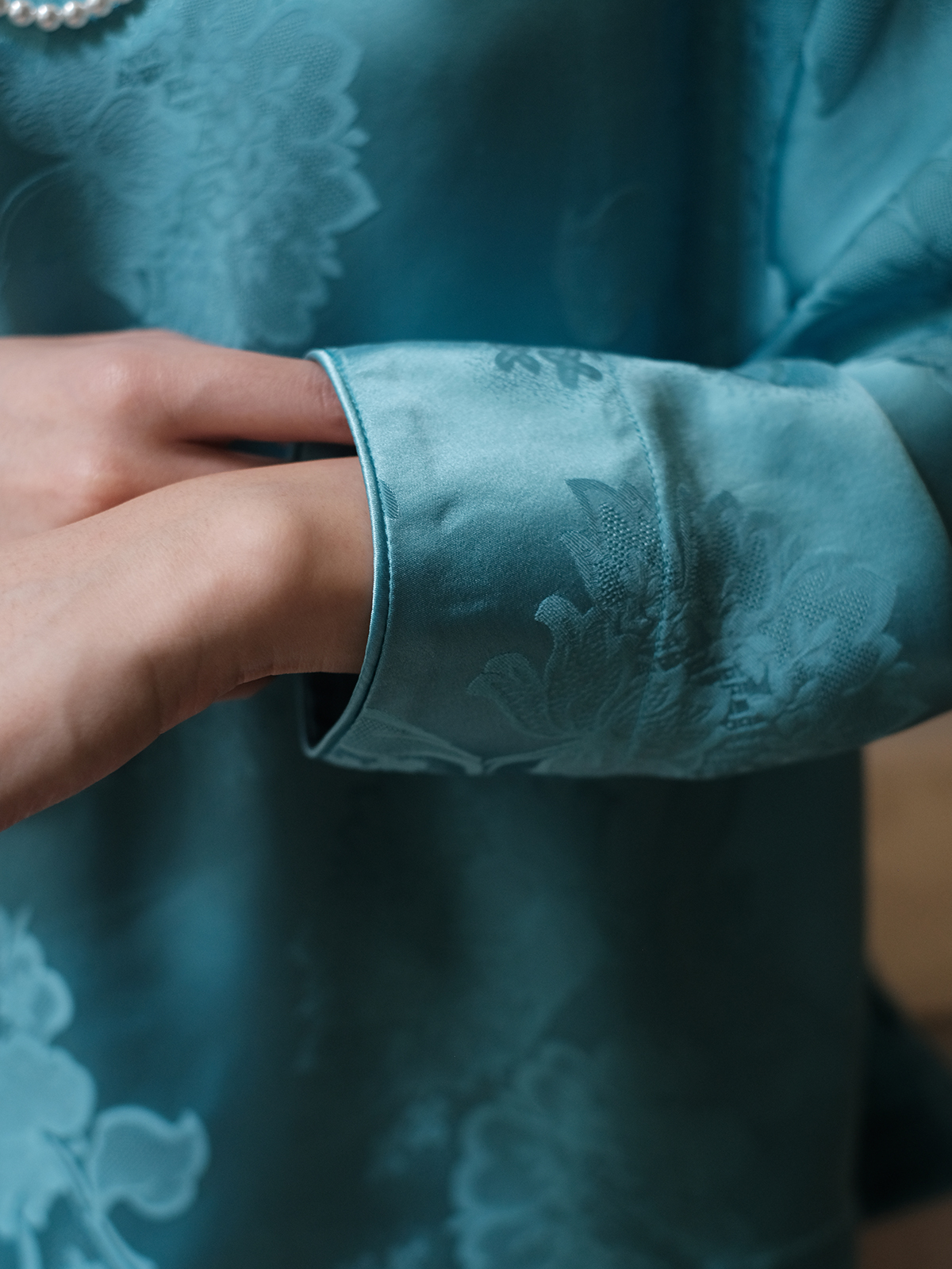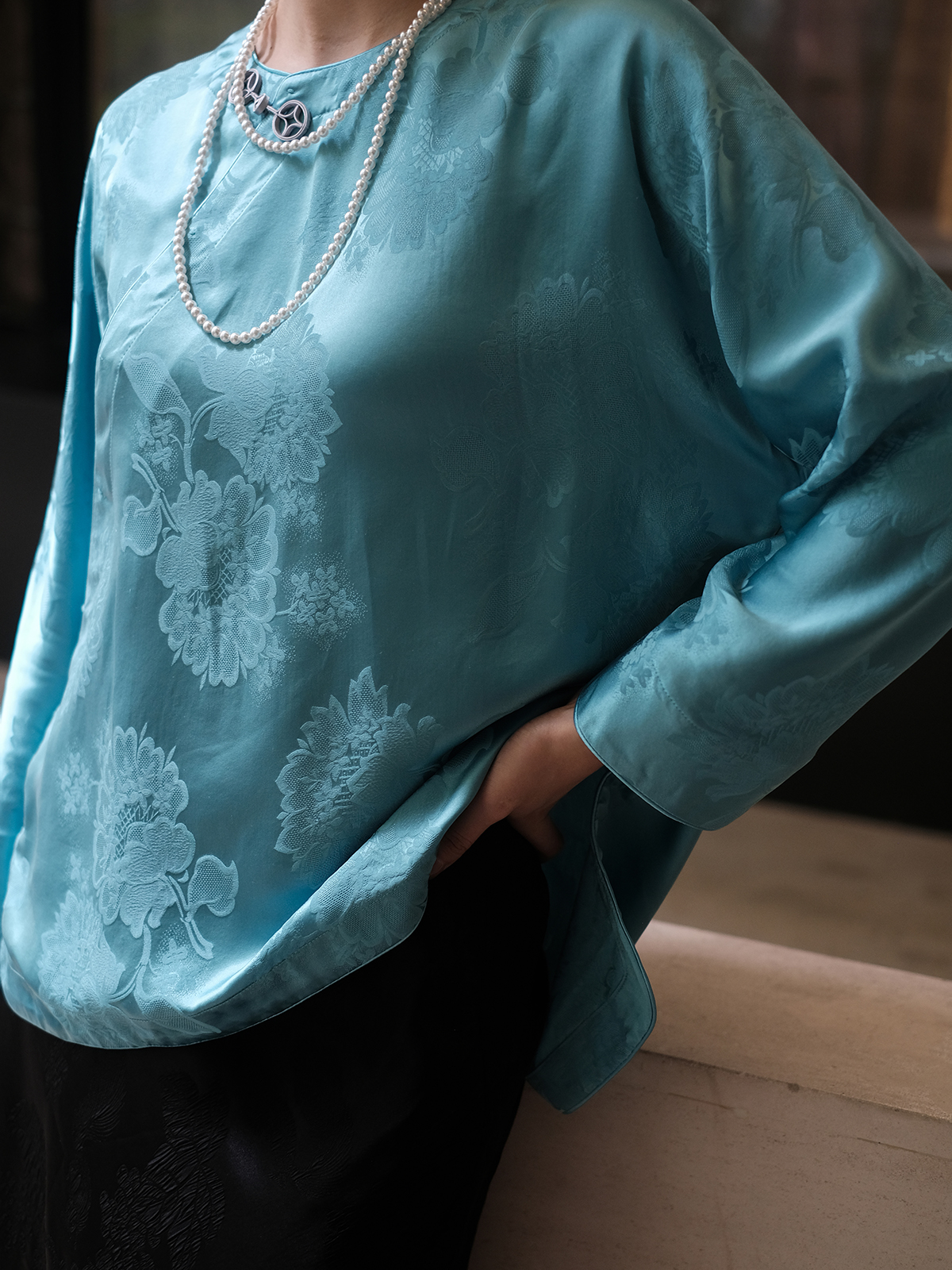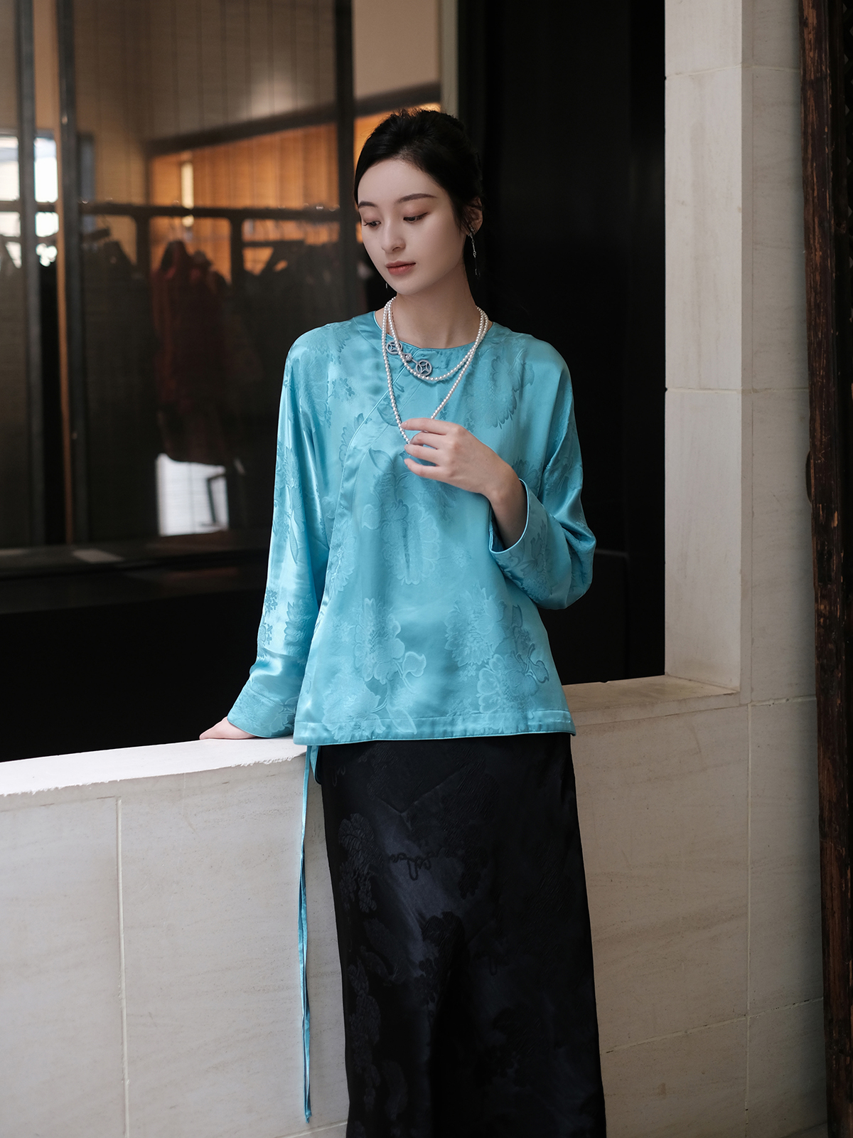 盛唐牡丹 |海青蓝石榴花纹样偏襟上衣