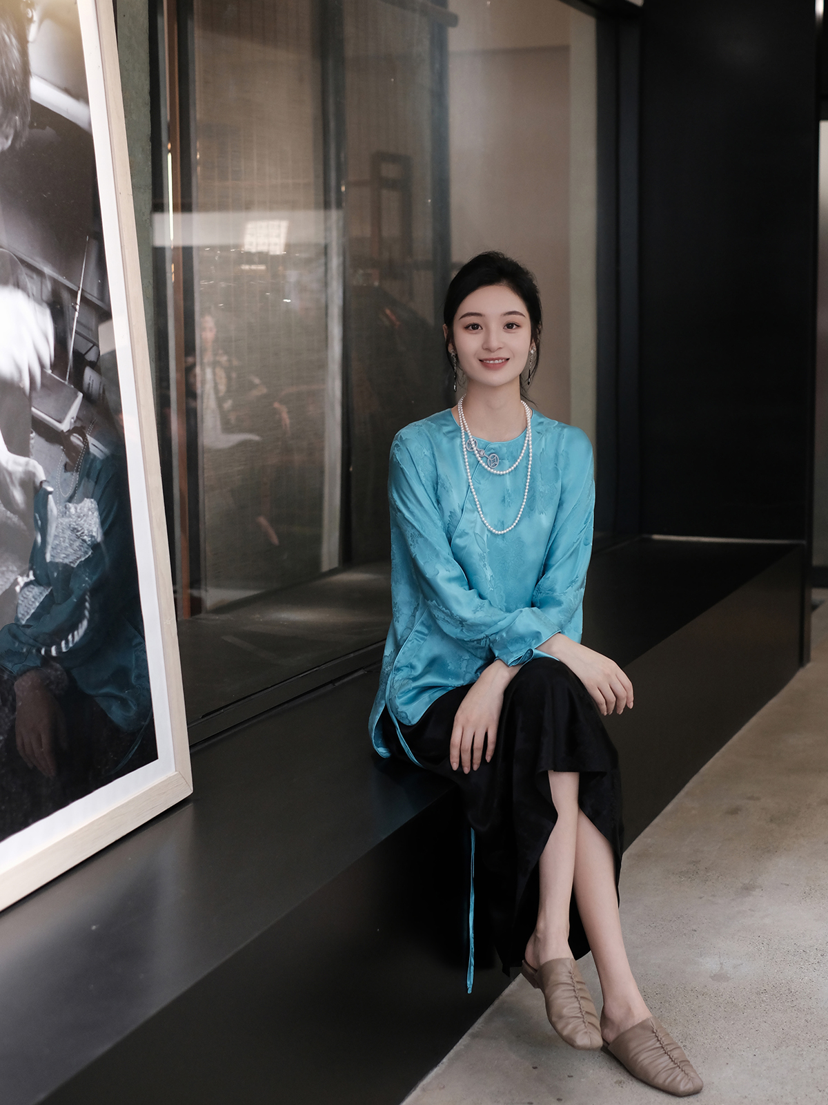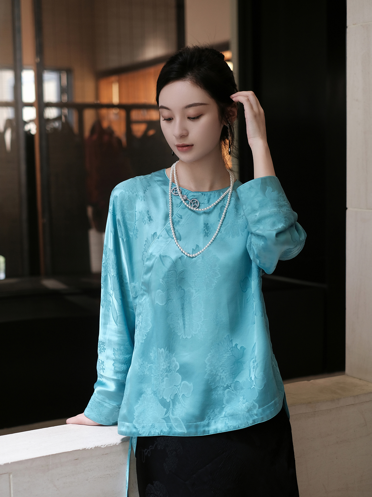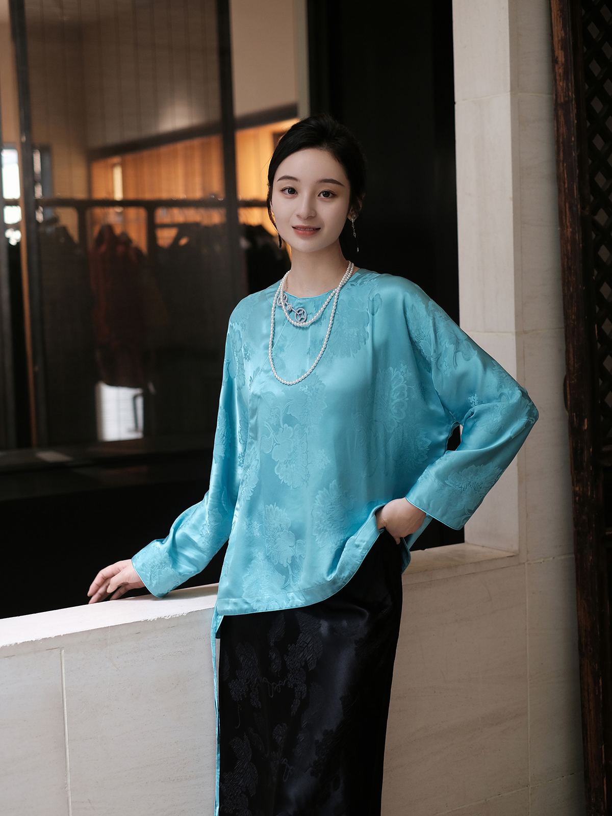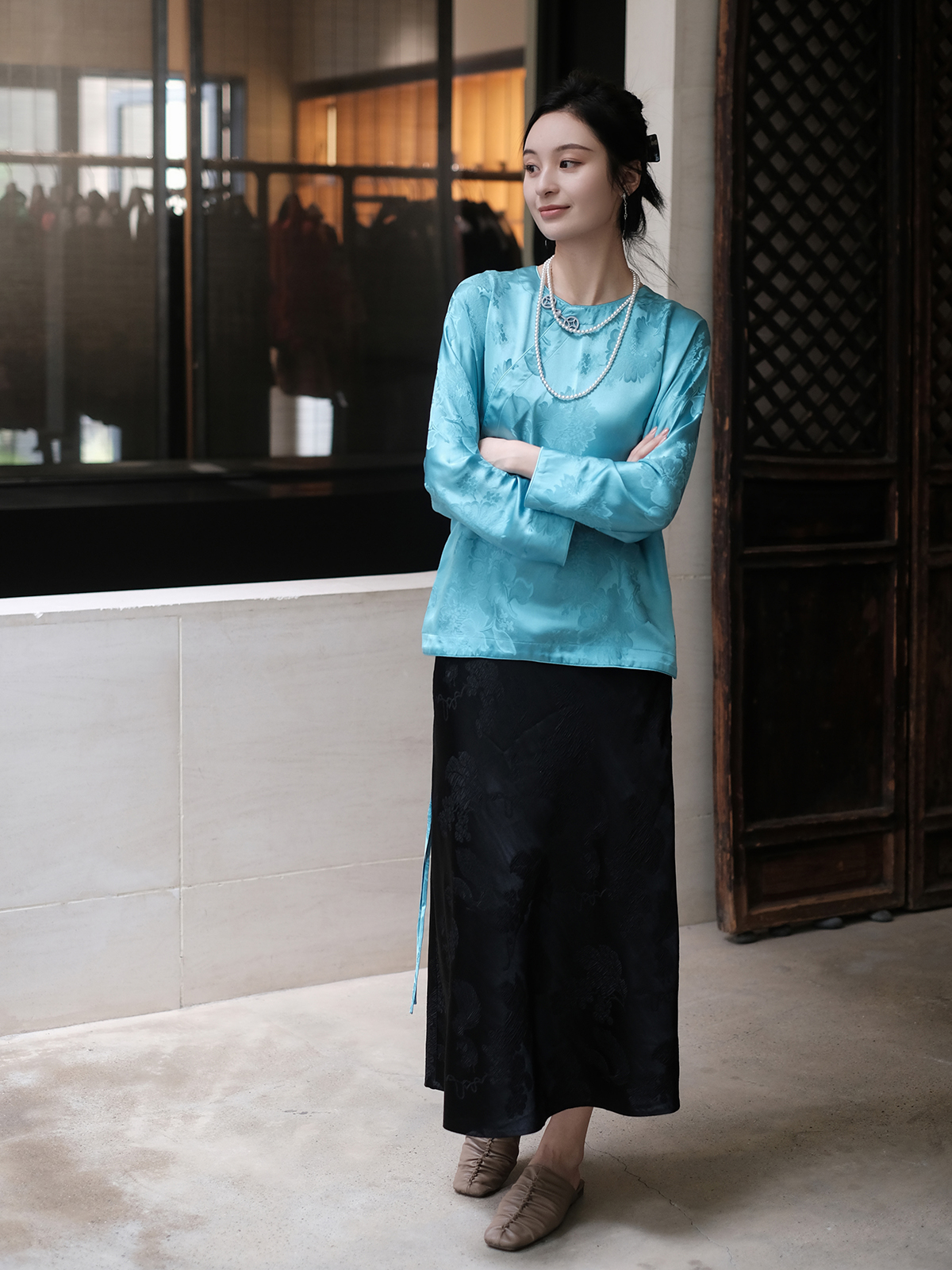 盛唐牡丹 |海青蓝石榴花纹样偏襟上衣