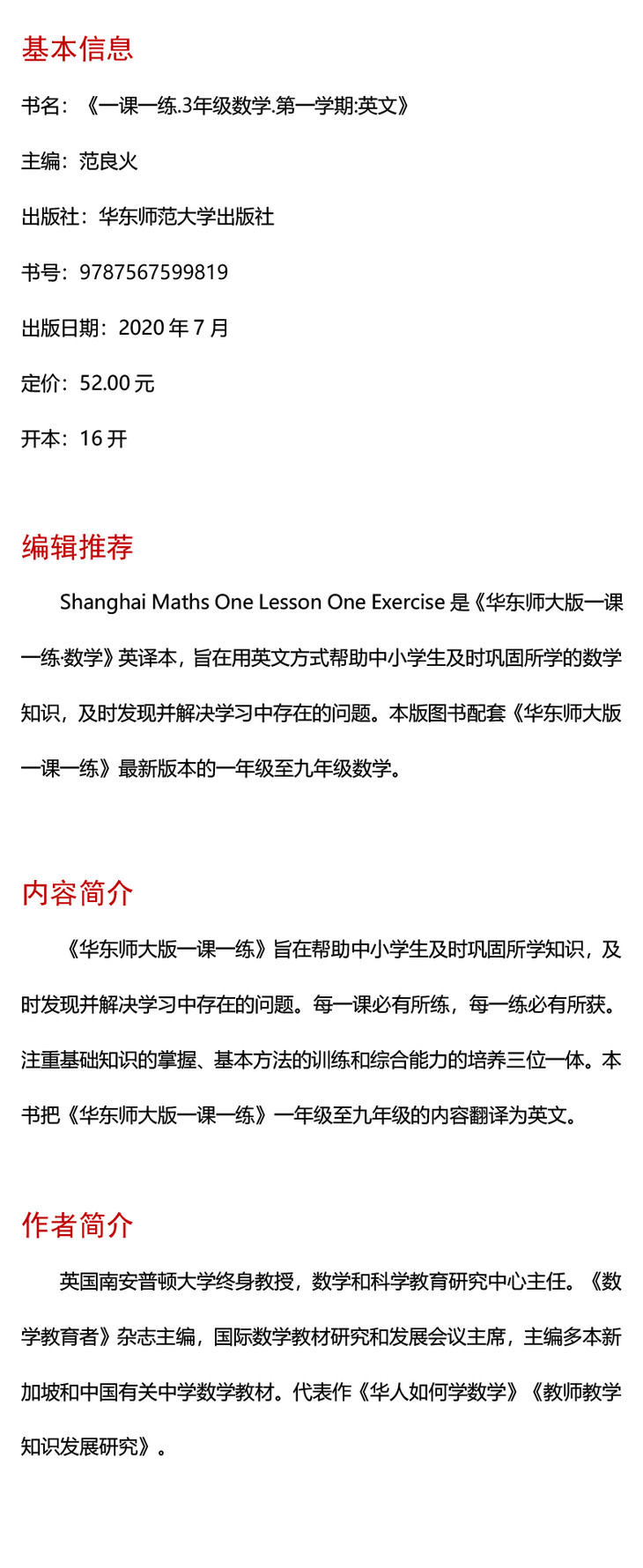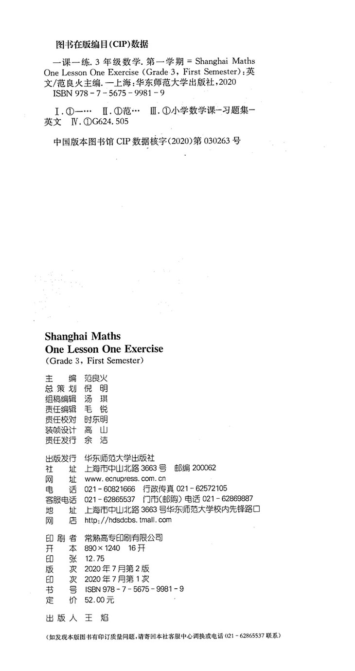 一课一练数学英文版 三年级第一学期 Shanghai Maths One Lesson One Exercise Grade1(First Semester) 3年级上 英译正版教辅