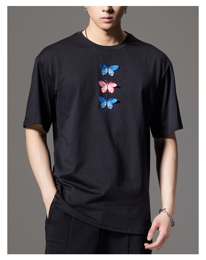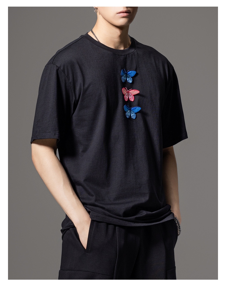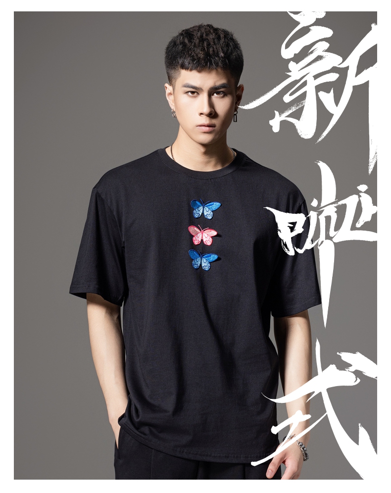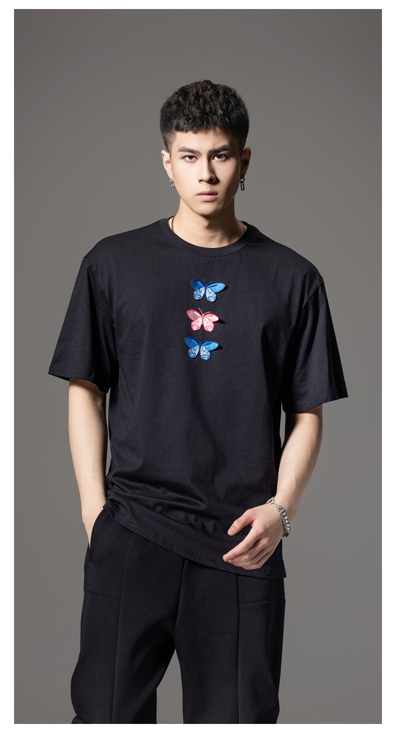PINLI品立新中式夏季新款男士立体蝴蝶短袖T恤贴布绣休闲上衣BG242111053