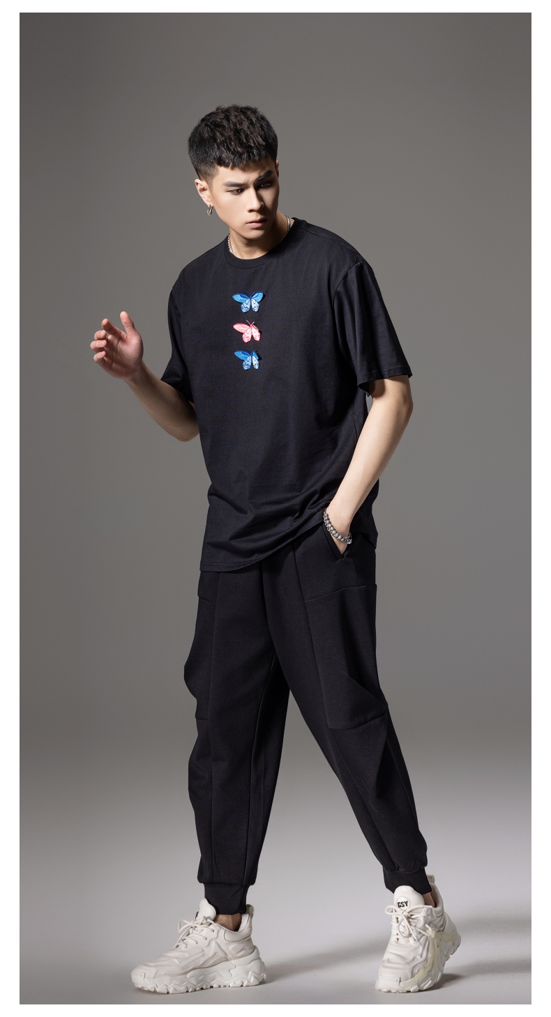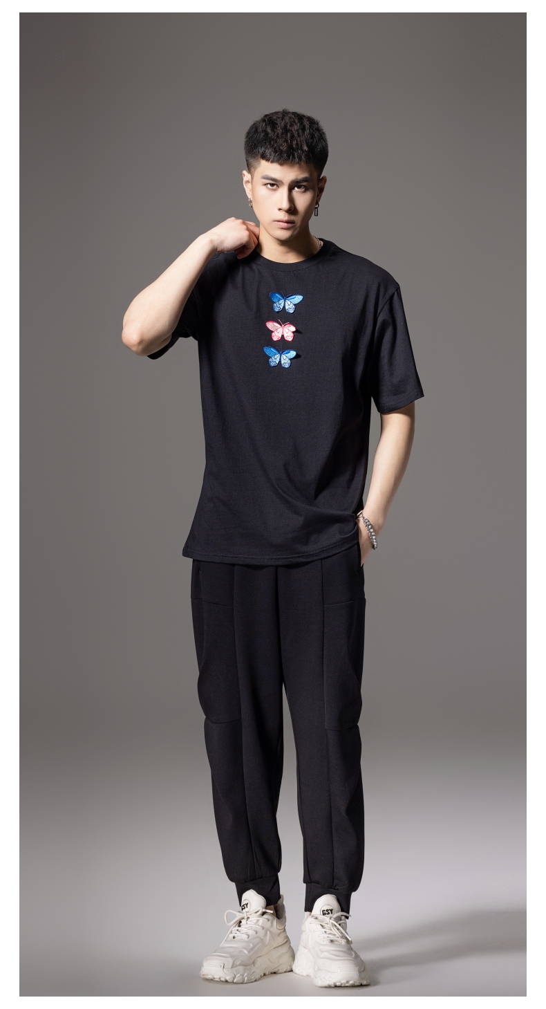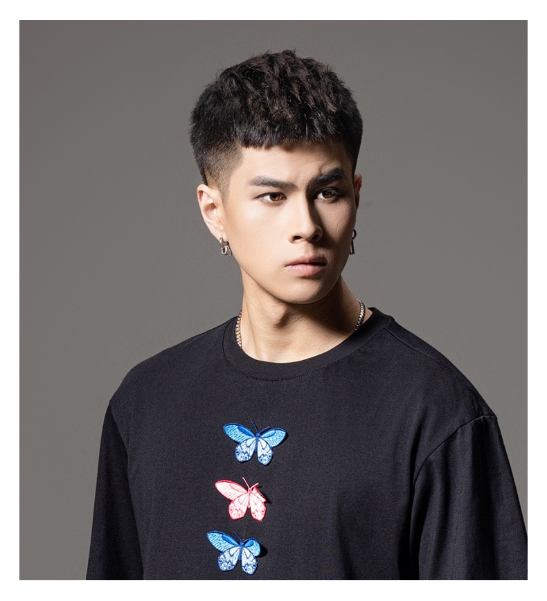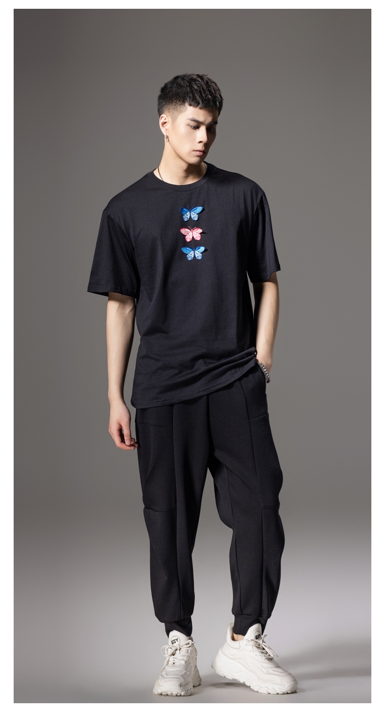 PINLI品立新中式夏季新款男士立体蝴蝶短袖T恤贴布绣休闲上衣BG242111053