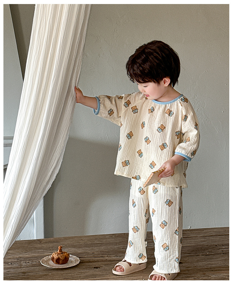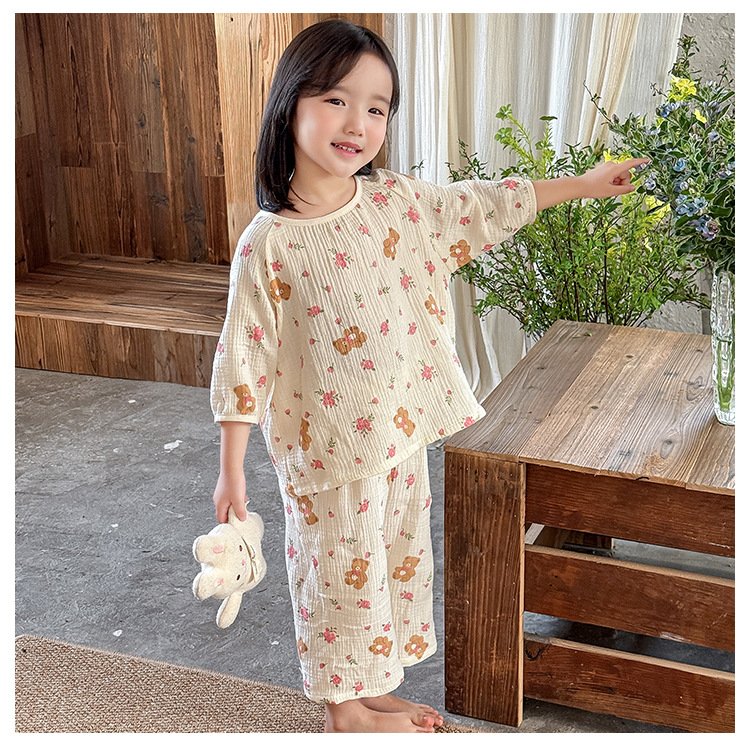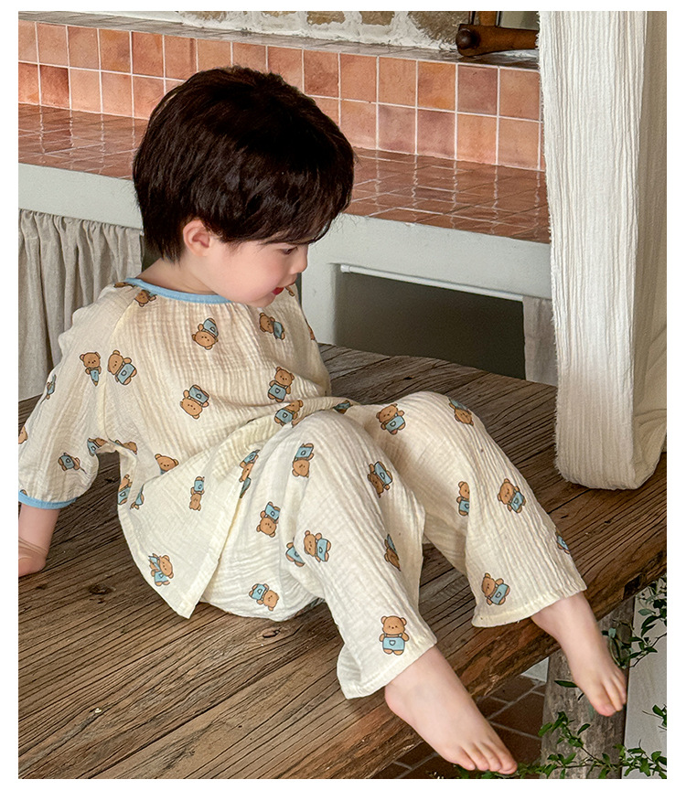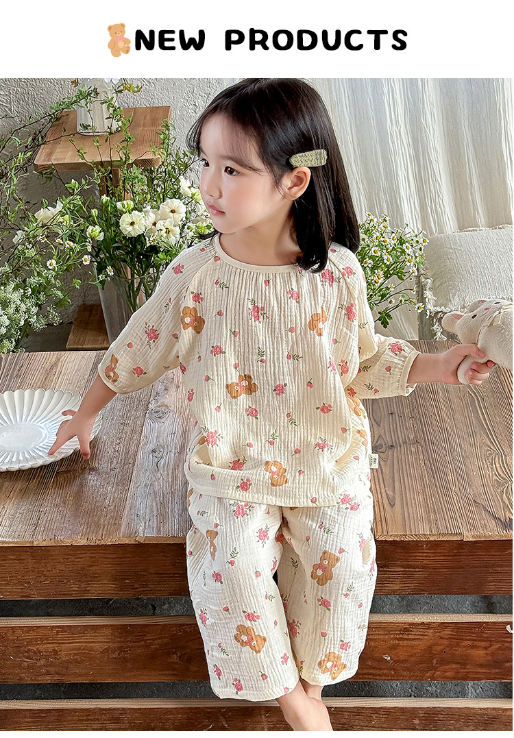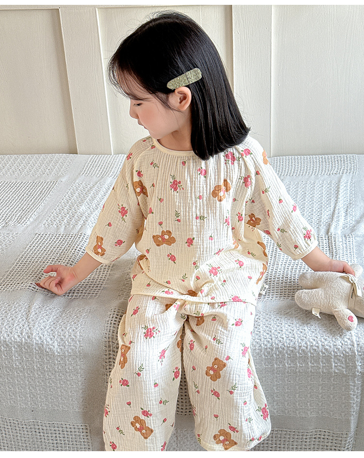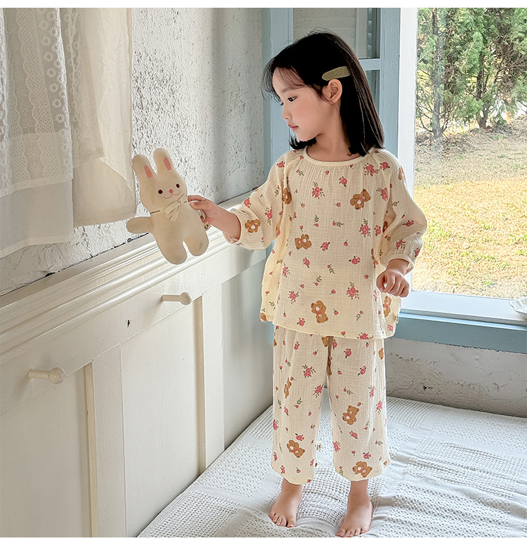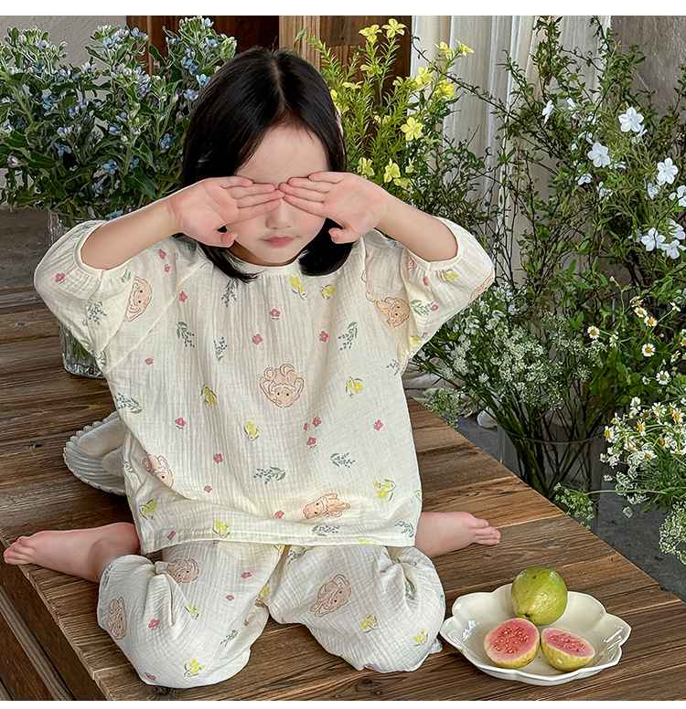 【A类儿童纱布睡衣套装】儿童睡衣a类夏天纯棉纱布家居服套装,吸汗透气舒适柔软,可爱薄款女童男孩宝宝空调服睡衣家居服QQ