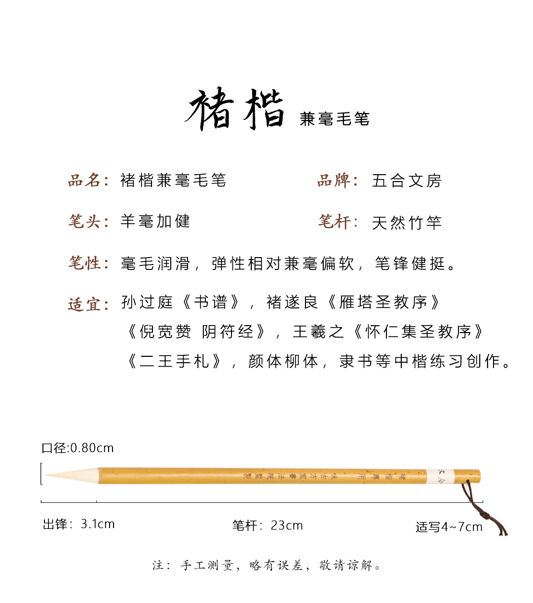 褚楷丨羊毫加健毛笔 出锋3.1cm 初学楷书行草使用适合收笔圆润可写倪宽赞雁塔圣教序