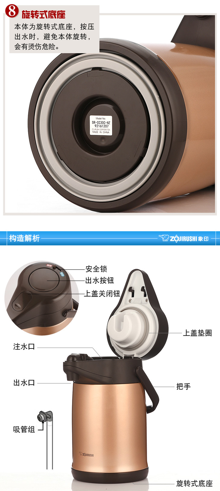 【中国组装】日本 象印 真空不锈钢气压式保温壶 3L 防烫伤