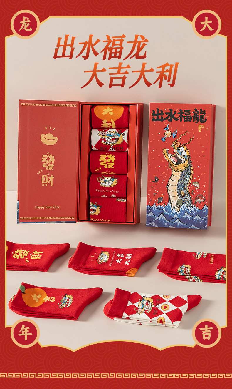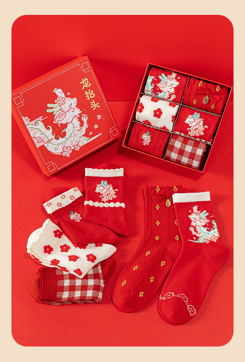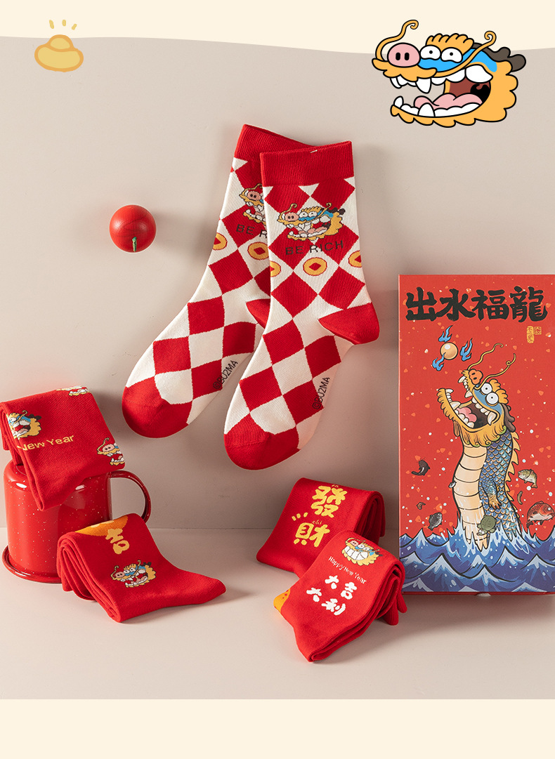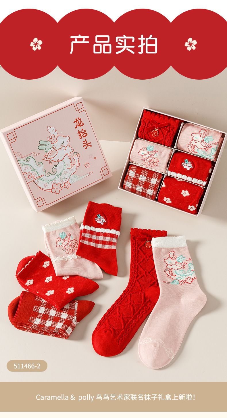 Caramella龙年女袜男袜礼盒装 鱼跃龙门龙年红色男女情侣中筒棉袜新年礼品袜