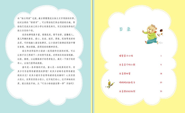 “叮当小铃铛童话第一季”是一套励志童话书,也是一套儿童由看图画过渡到读文字的桥梁书。书中以小朋友们喜爱的动物呼噜猫、萝卜兔、米喜熊、小福象为主人公,写了涉及儿童成长各个方面的故事,将善良、爱心、友谊、诚实、勇敢、机智、分享等美好品质巧妙地融合进童话故事里,让小读者们能够在阅读中增长智慧,增强信心、敢于自我肯定、勇于战胜困难。 书中插图色彩明亮,形象可爱,再加上注音,是专为学龄前儿童和小学一、二年级学生设计的。每个故事后设有“悄悄话板块”,起到画龙点睛的作用,引导小读者对本篇故事的主题进行思考和领悟,也特别适合父母和孩子亲子阅读时引发讨论话题,起到抛砖引玉的作用。