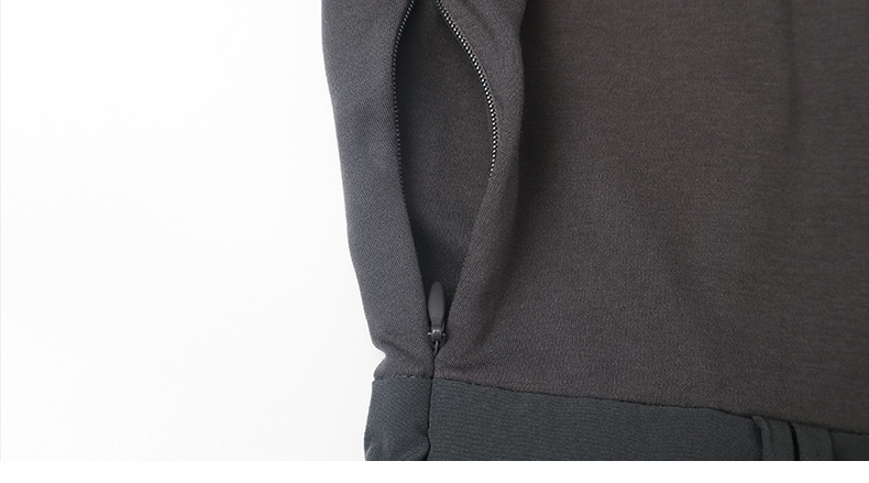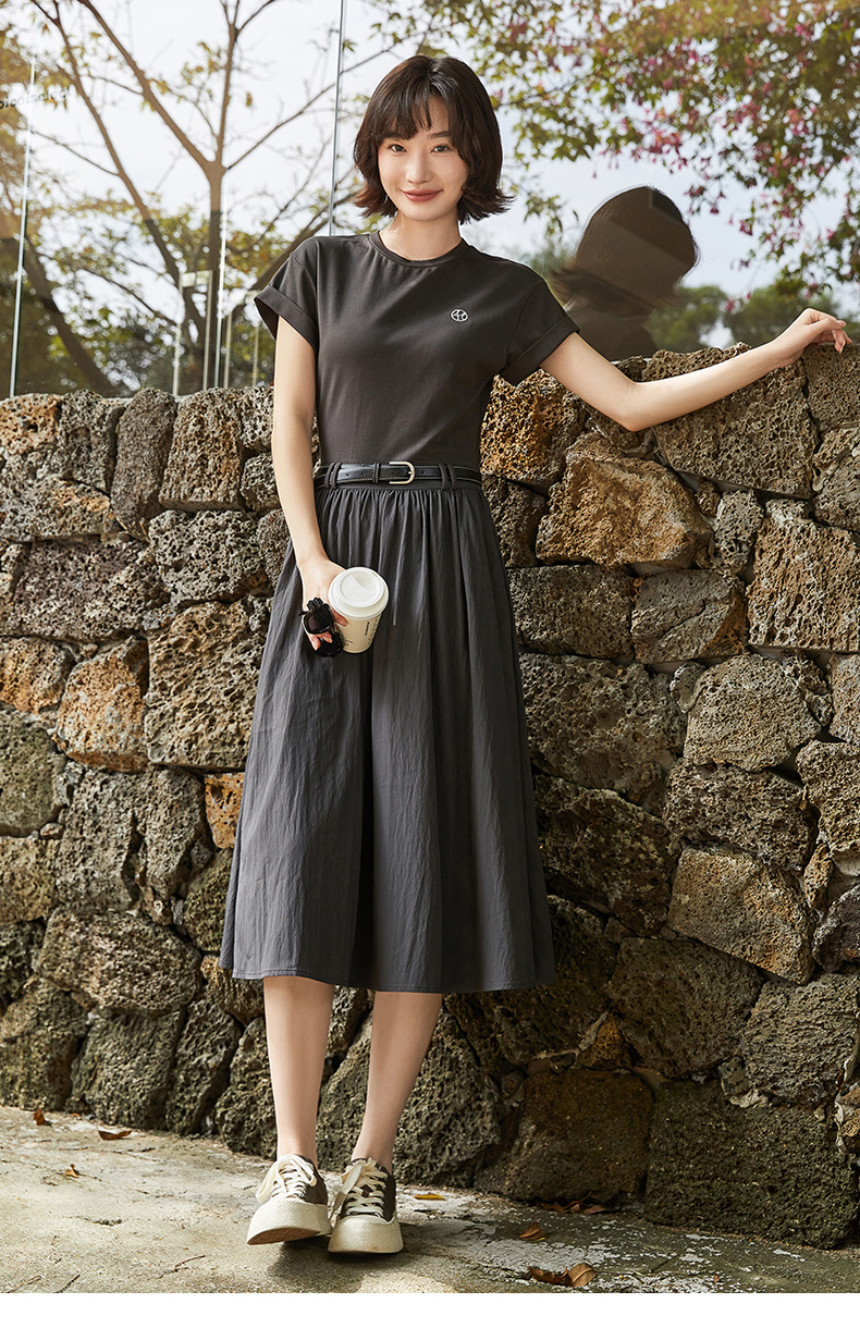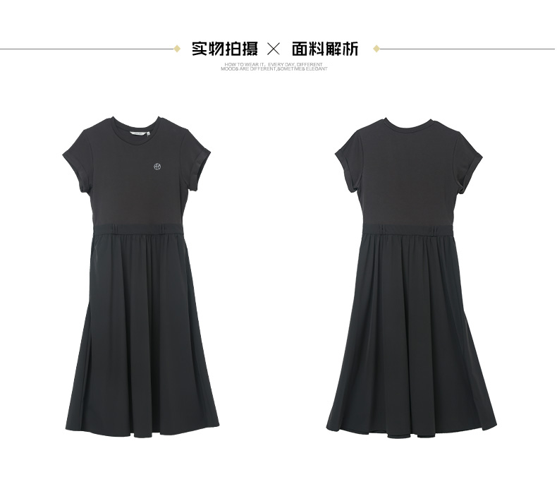 简约百搭黑色假两件连衣裙 收腰显瘦设计感圆领刺绣标休闲中长裙