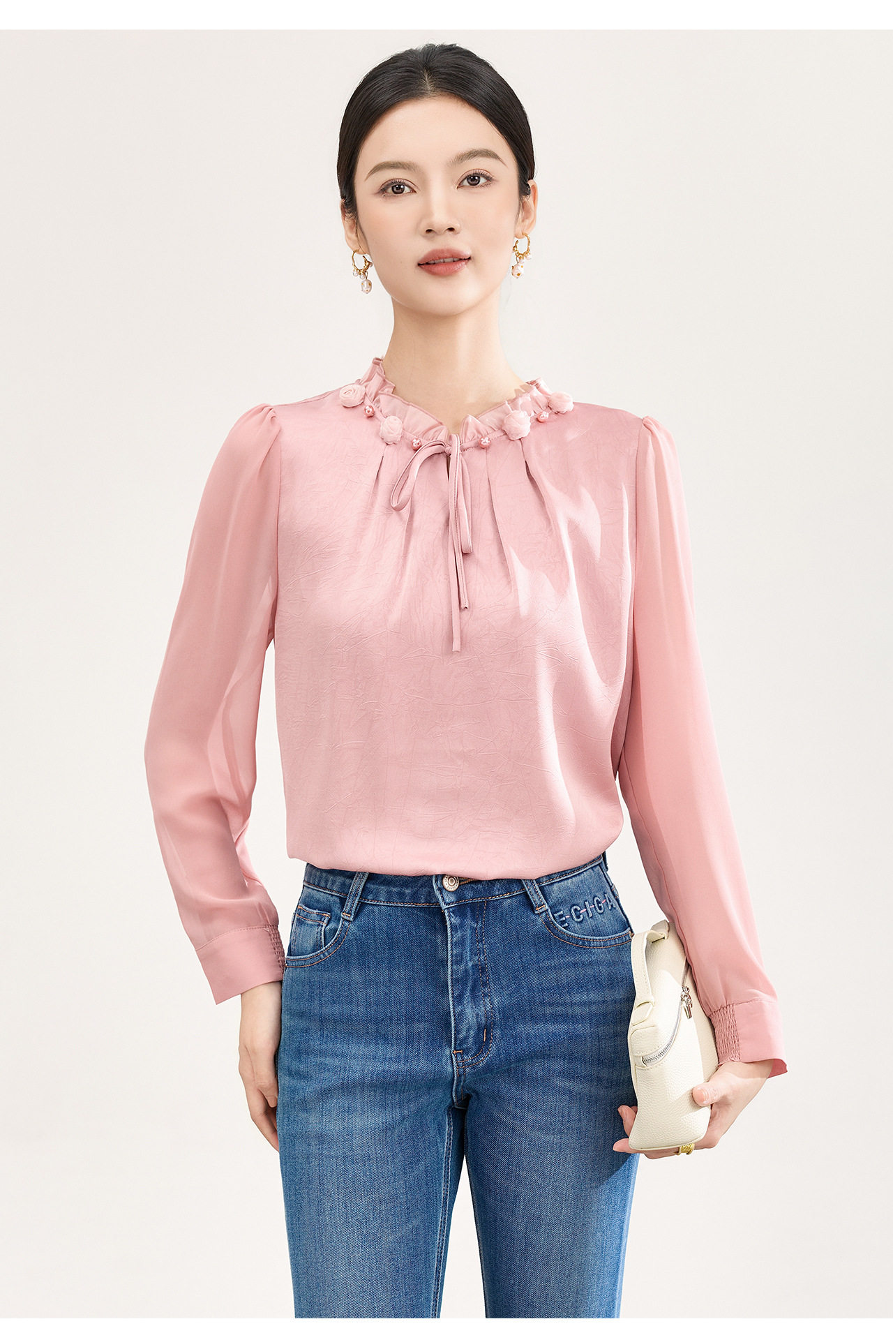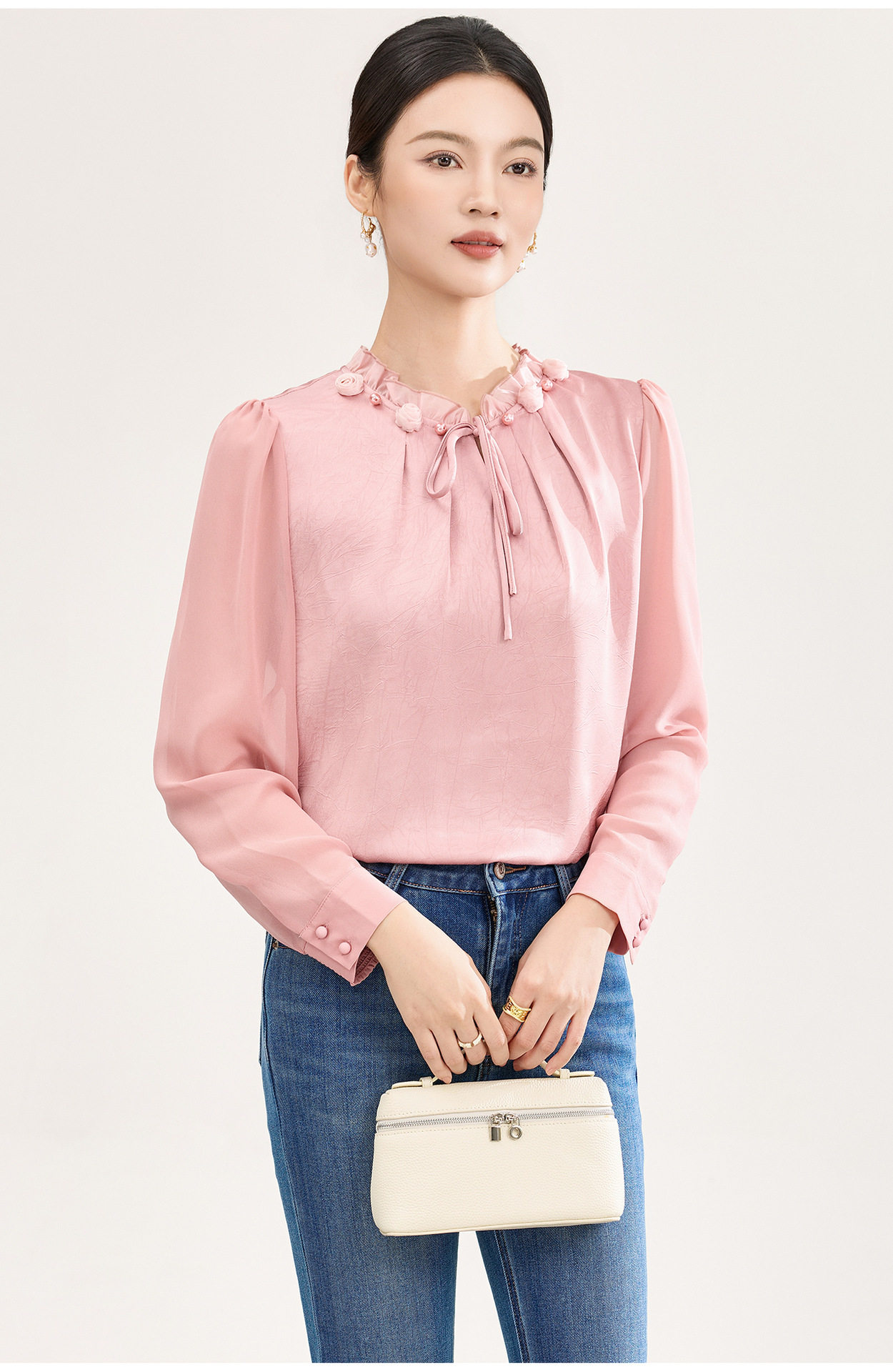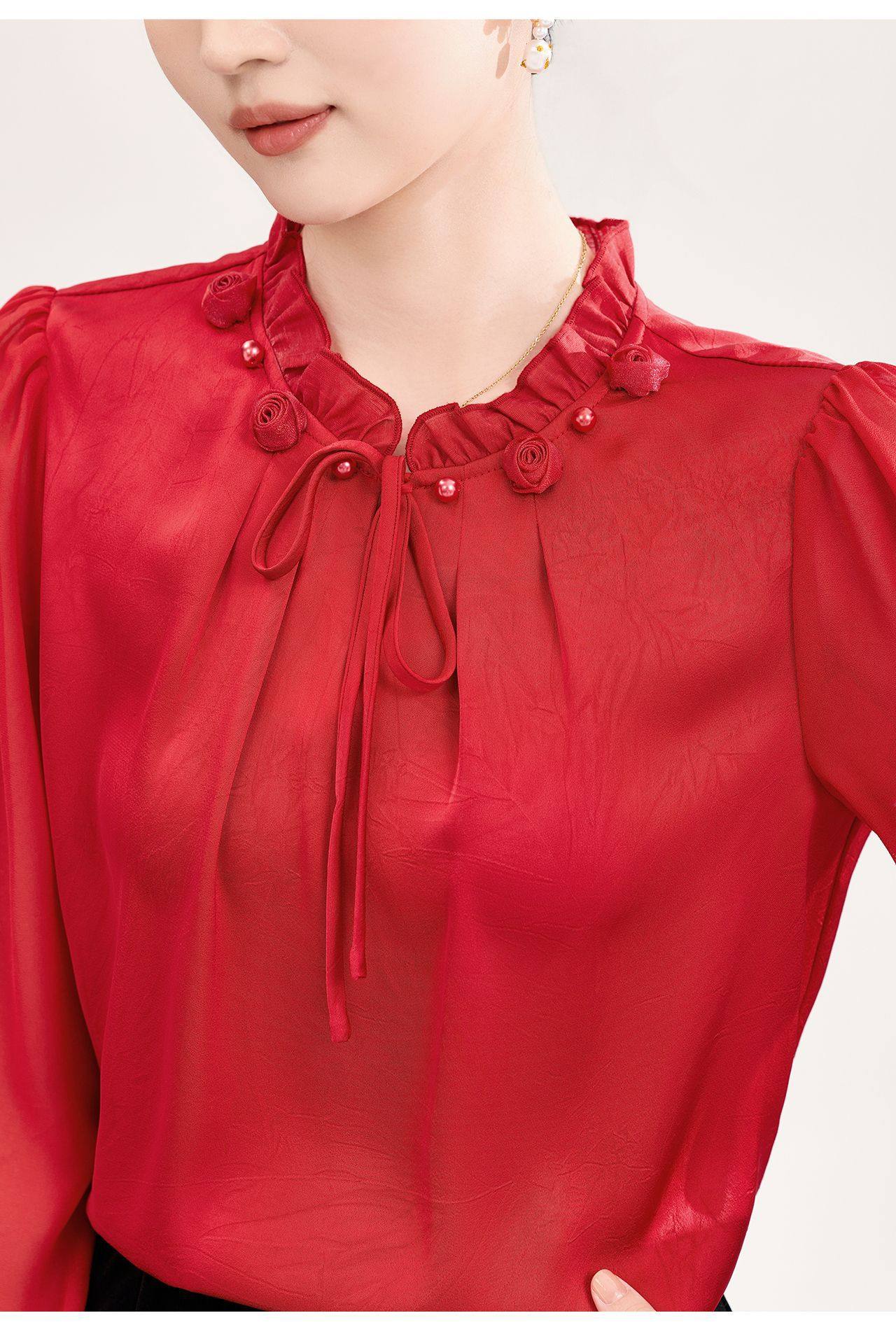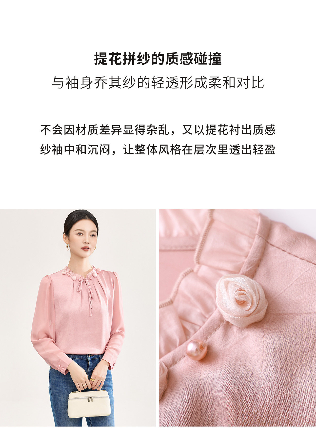 「高货wl」全新升级【铂金会员238/天猫319/差价81】(04229)洛诗琳2026春季新款法式提花肌理感绉缎拼乔其纱长袖衬衫