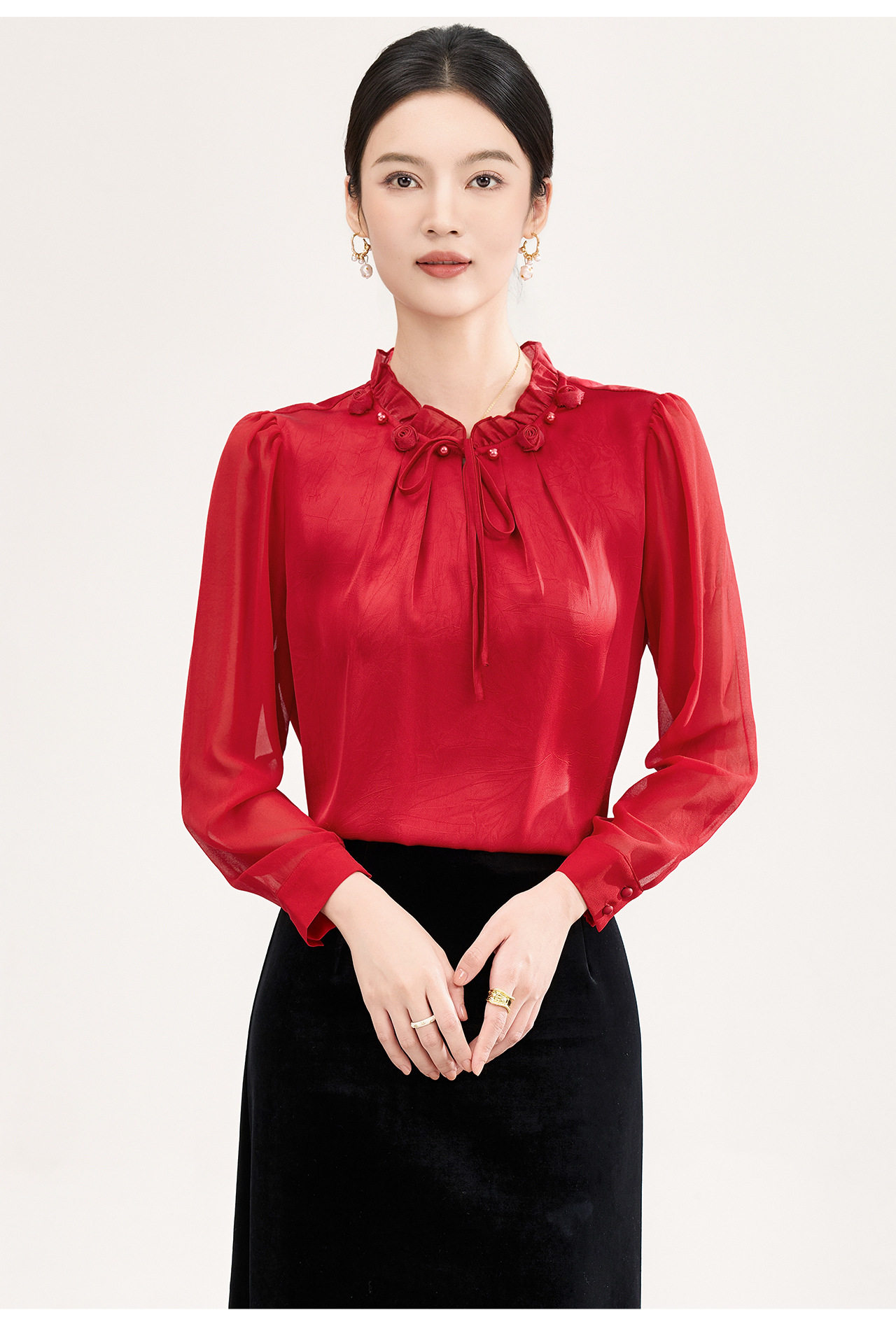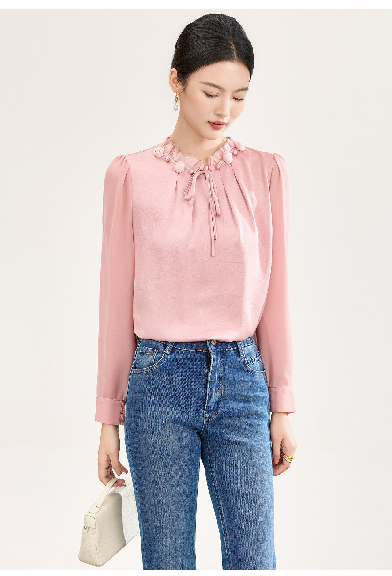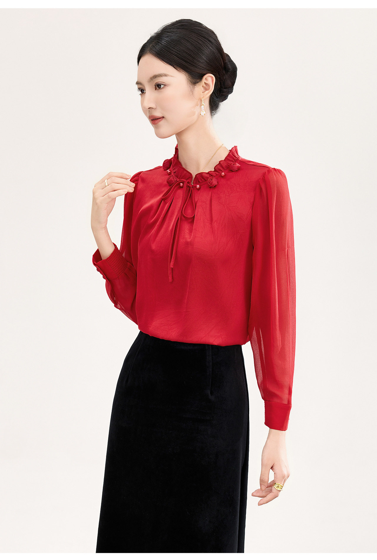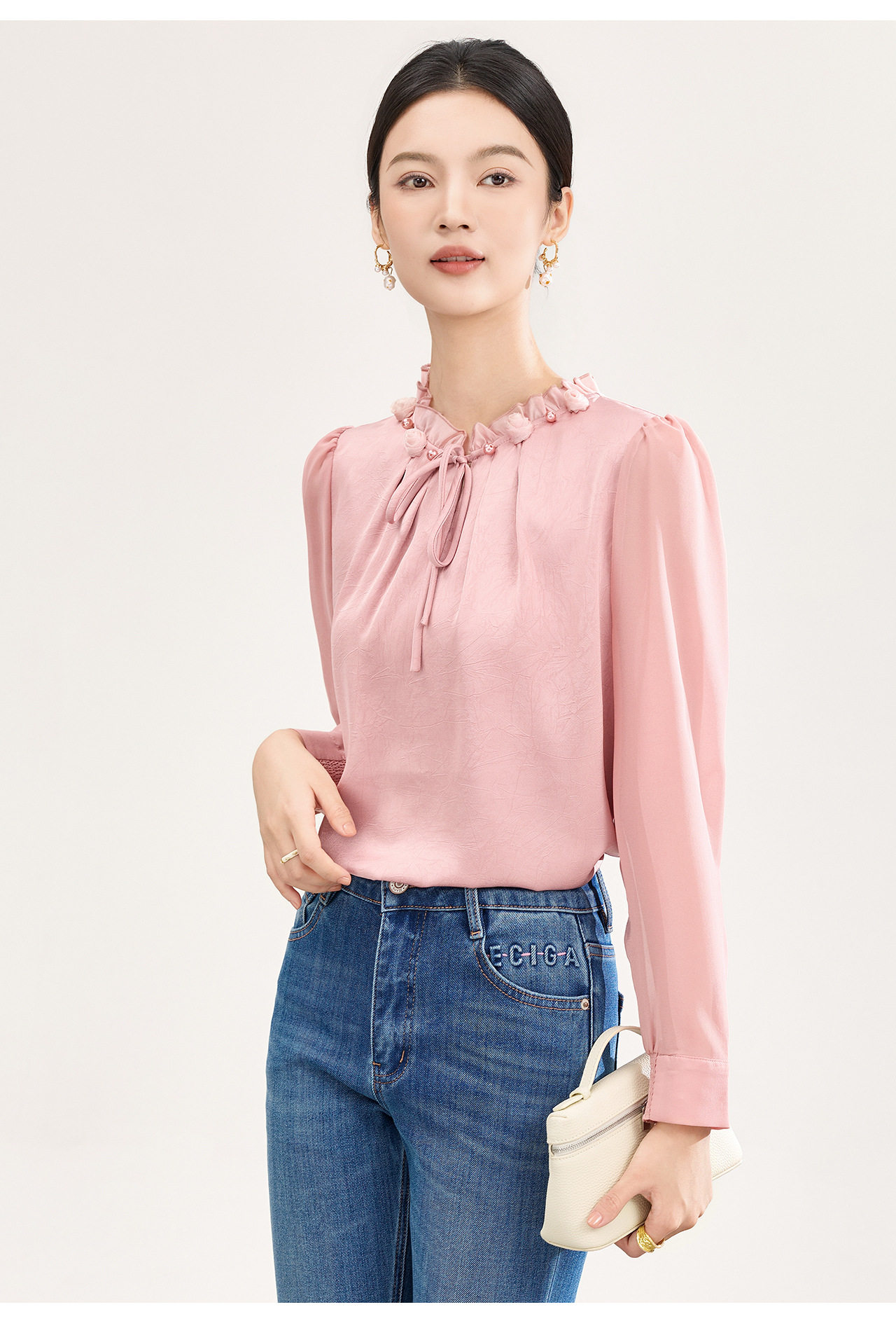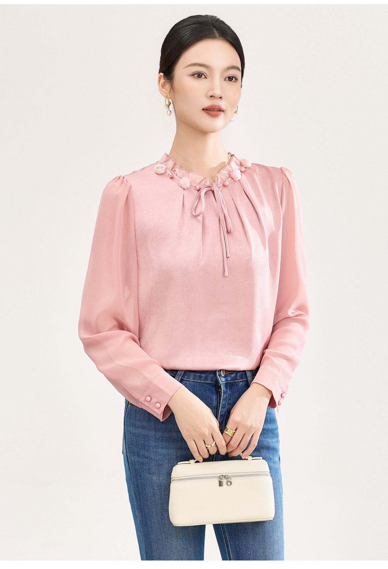 「高货wl」全新升级【铂金会员238/天猫319/差价81】(04229)洛诗琳2026春季新款法式提花肌理感绉缎拼乔其纱长袖衬衫