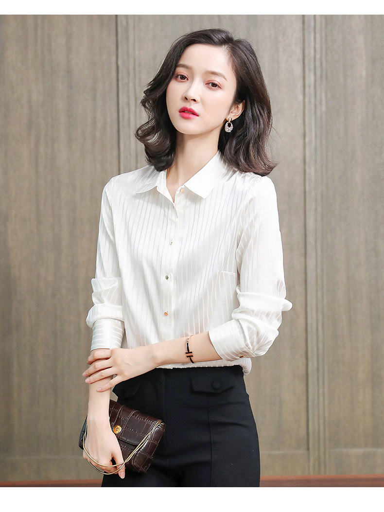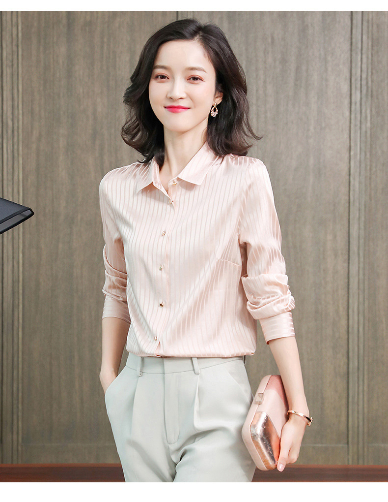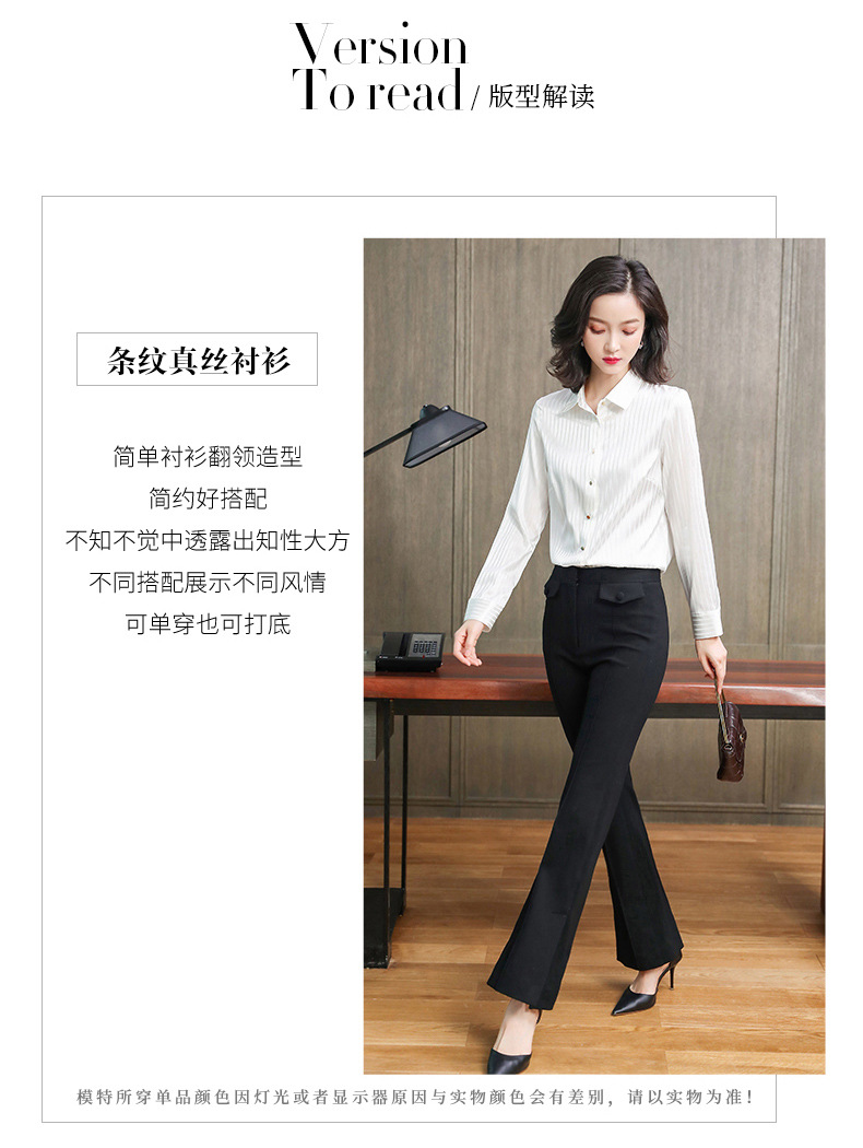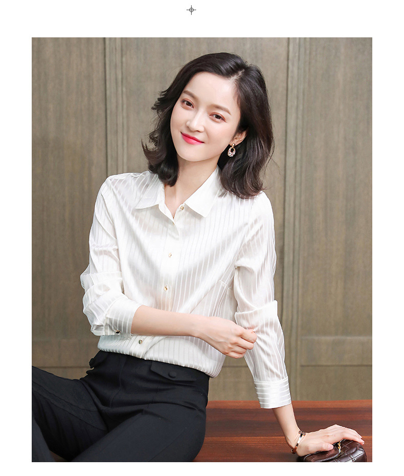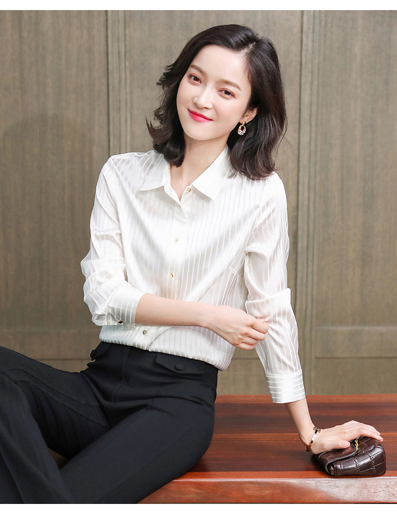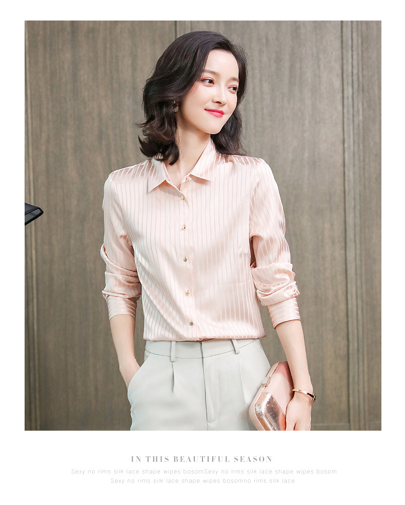 ASE-L6631竖条纹真丝缎面衬衫女士长袖2021秋装新款宽松立领重磅桑蚕丝上衣
