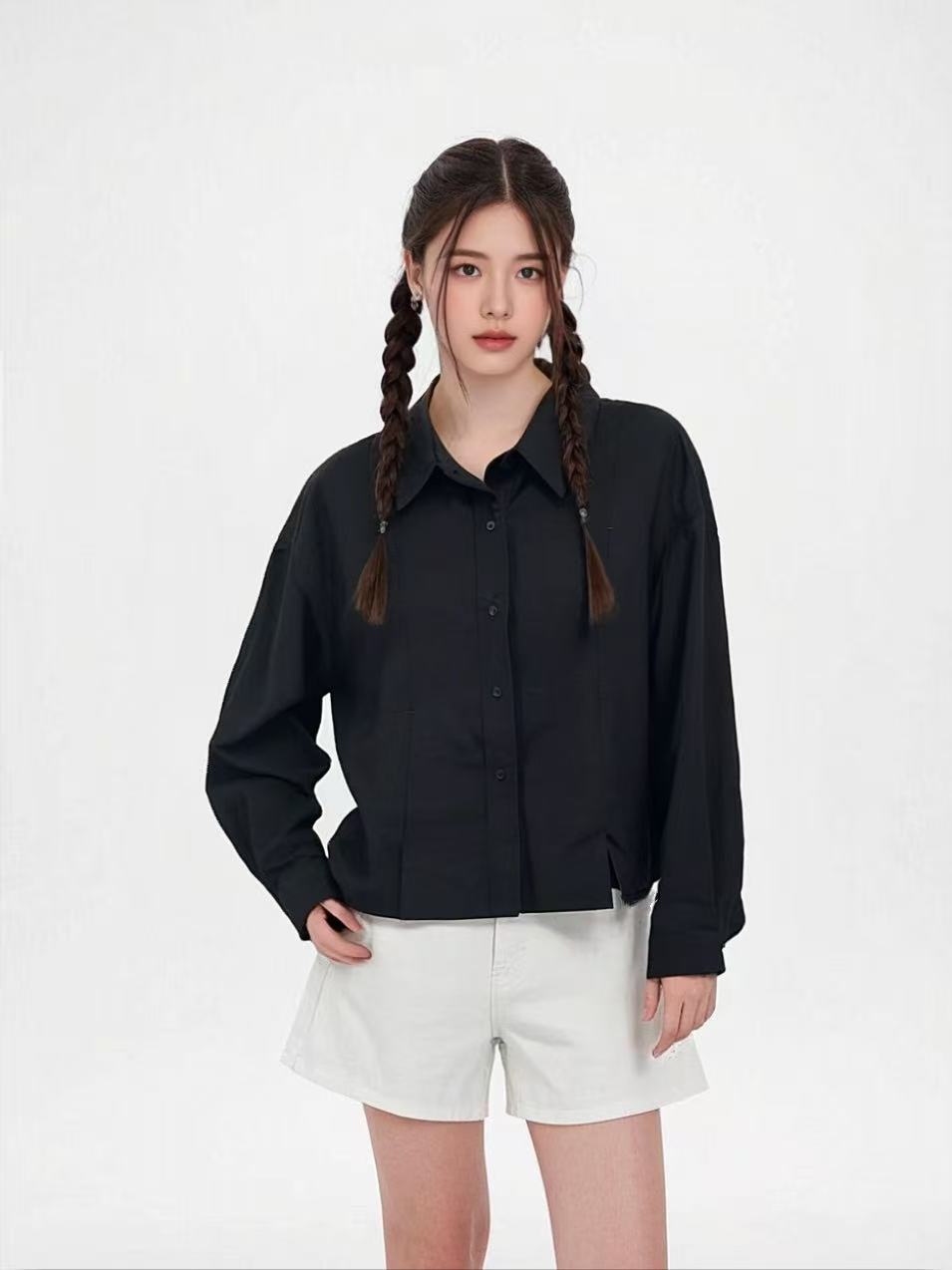 冰点价!仅限11.11!退货勿拍【秋新品】古泥7779 短款小开叉黑色衬衫-喜出