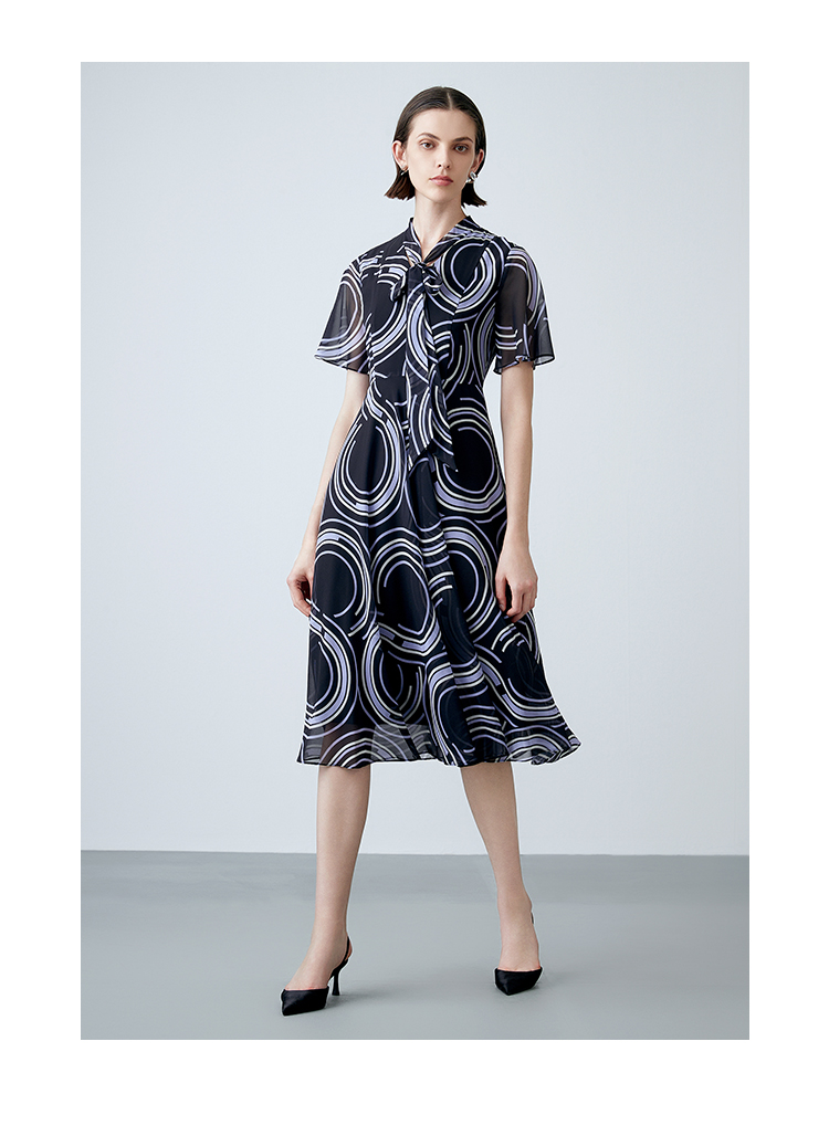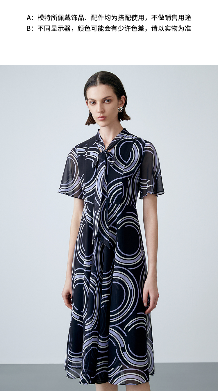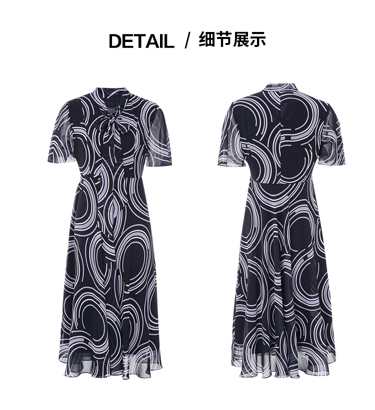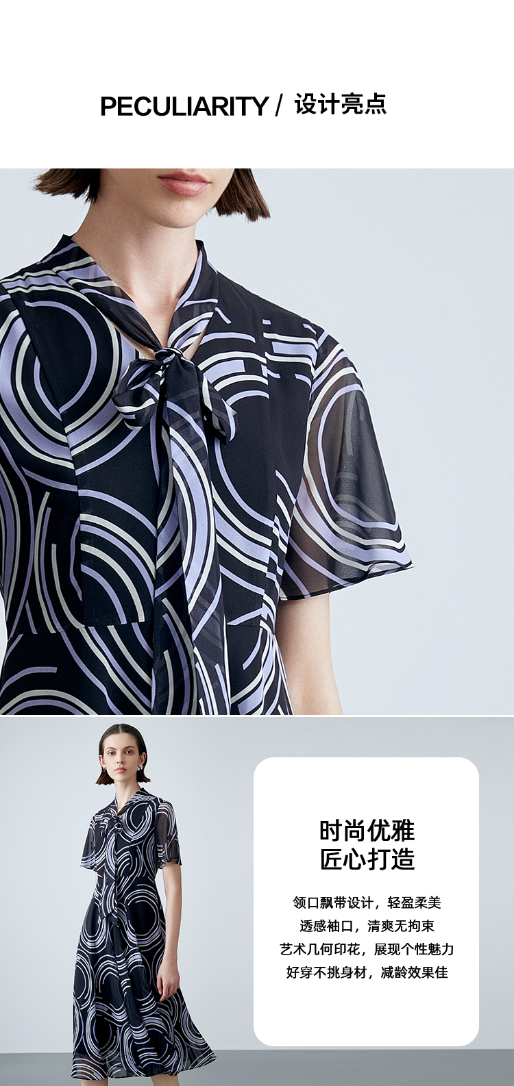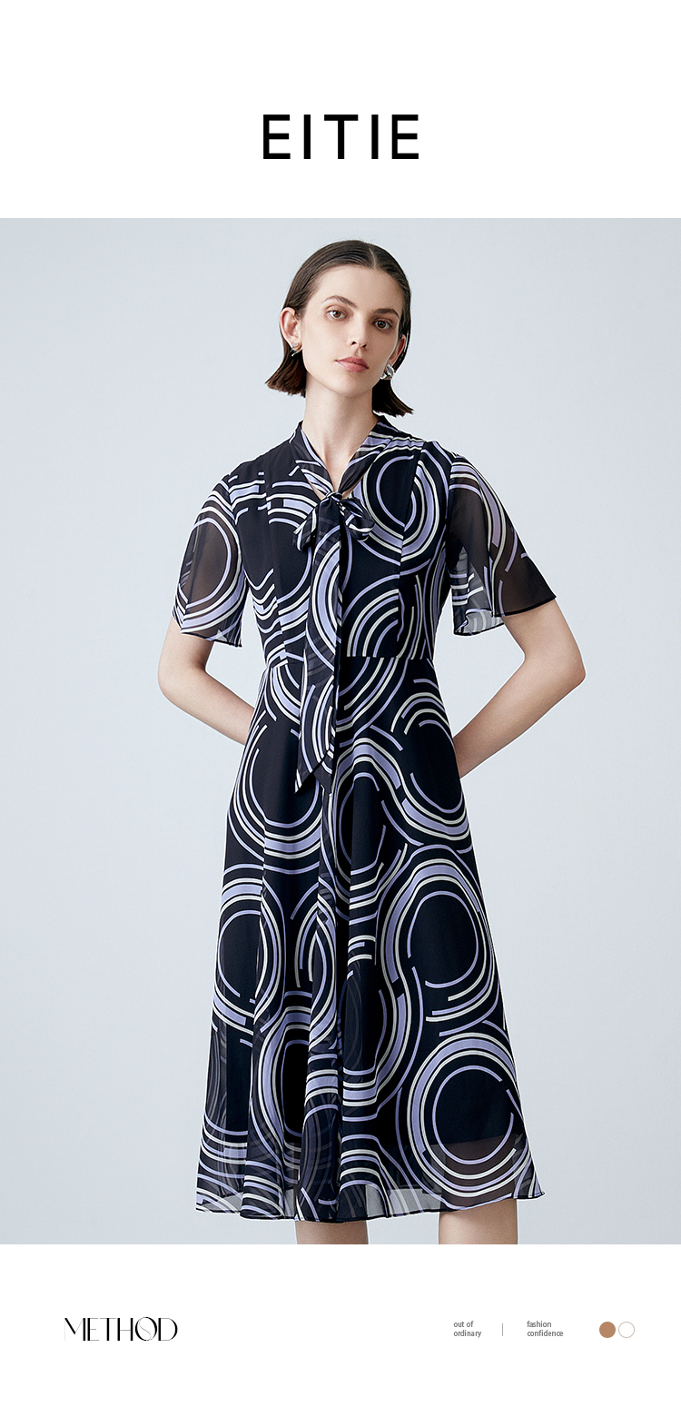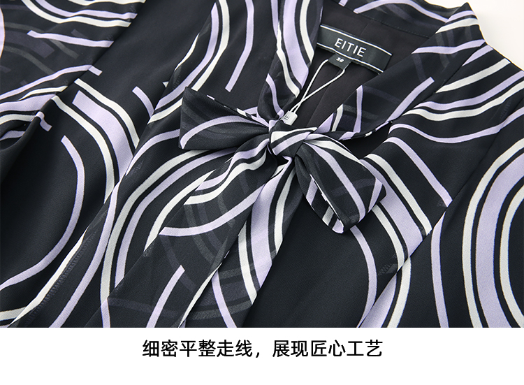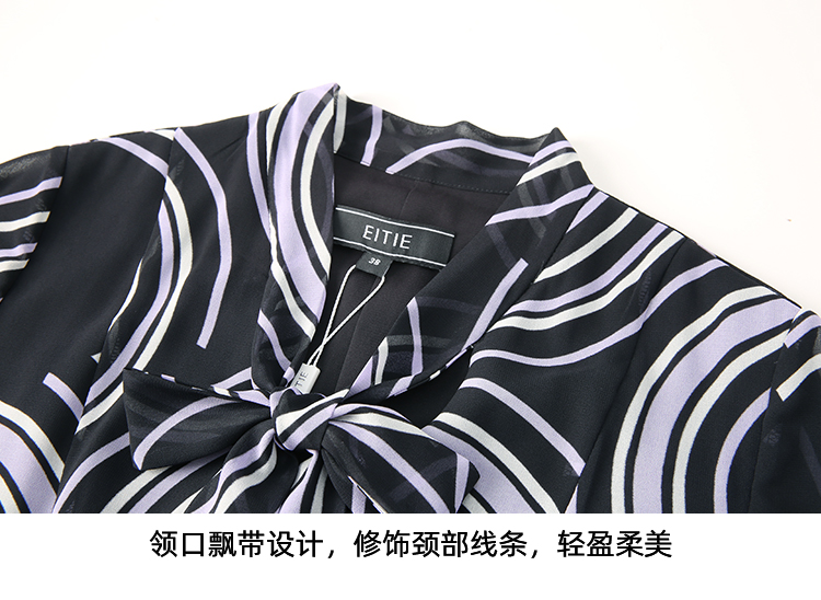 EITIE爱特爱夏季新款飘带V领收腰法式通勤显瘦印花连衣裙7807526