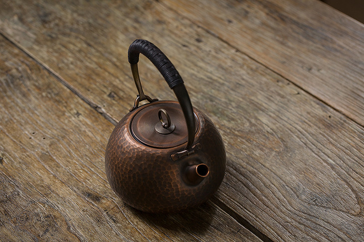 由传统打铜工艺打造,是一把简约实用的茶壶,