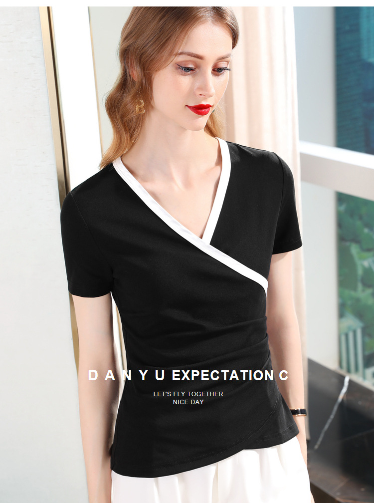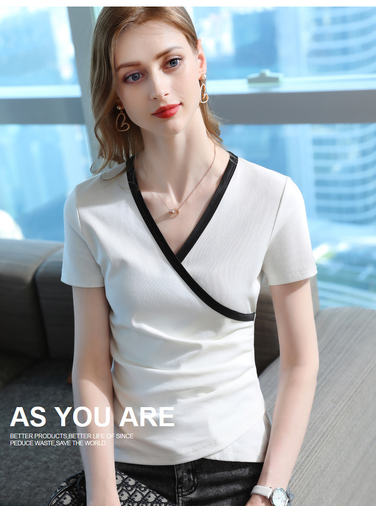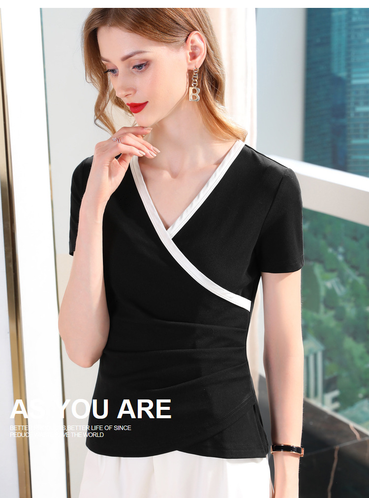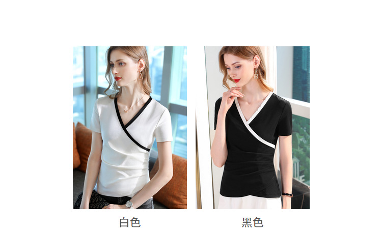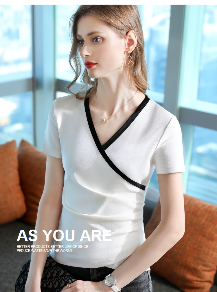 短袖t恤新款女装时髦撞色棉体恤气质交叉v领收腰上衣SG-T2X0079