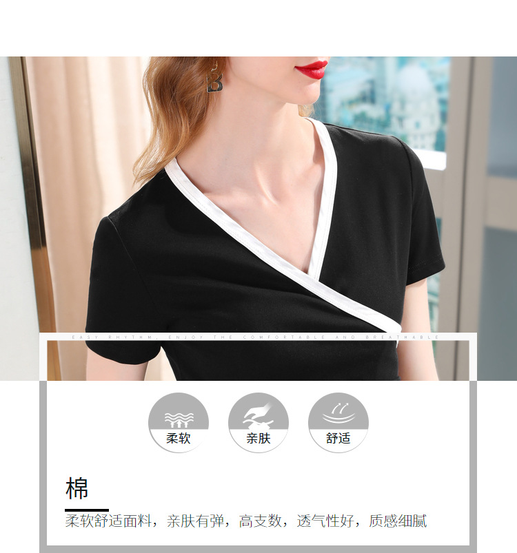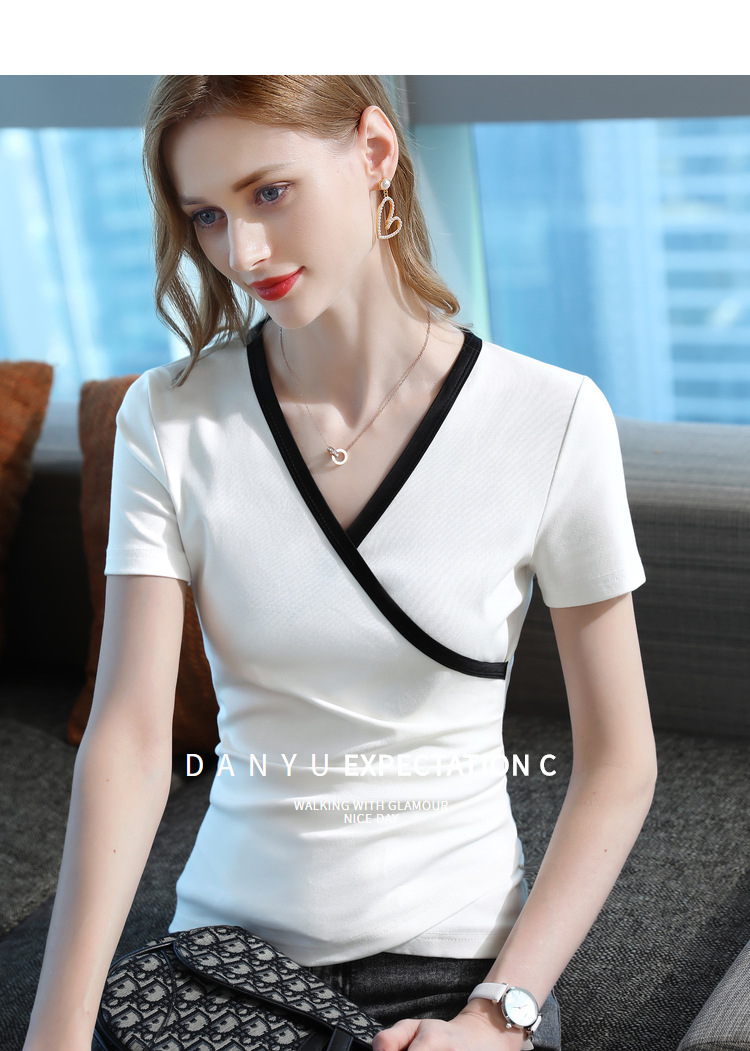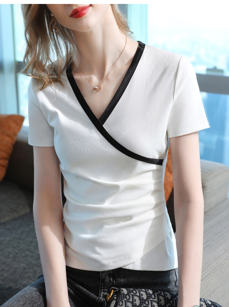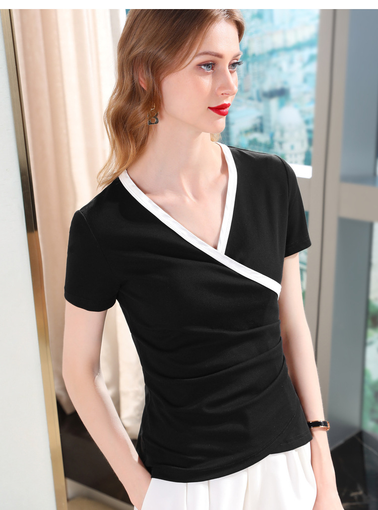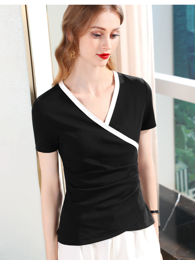 短袖t恤新款女装时髦撞色棉体恤气质交叉v领收腰上衣SG-T2X0079