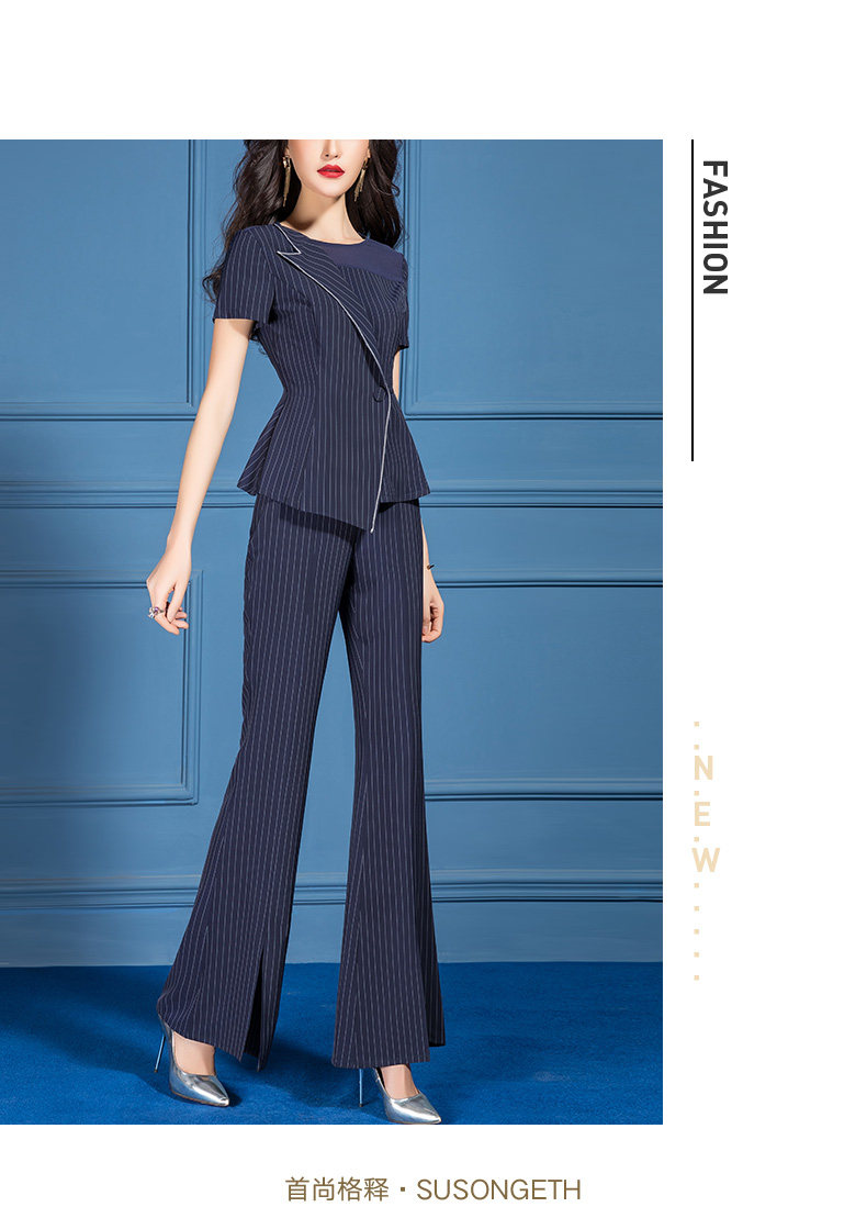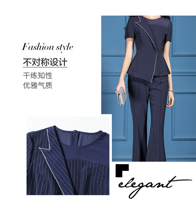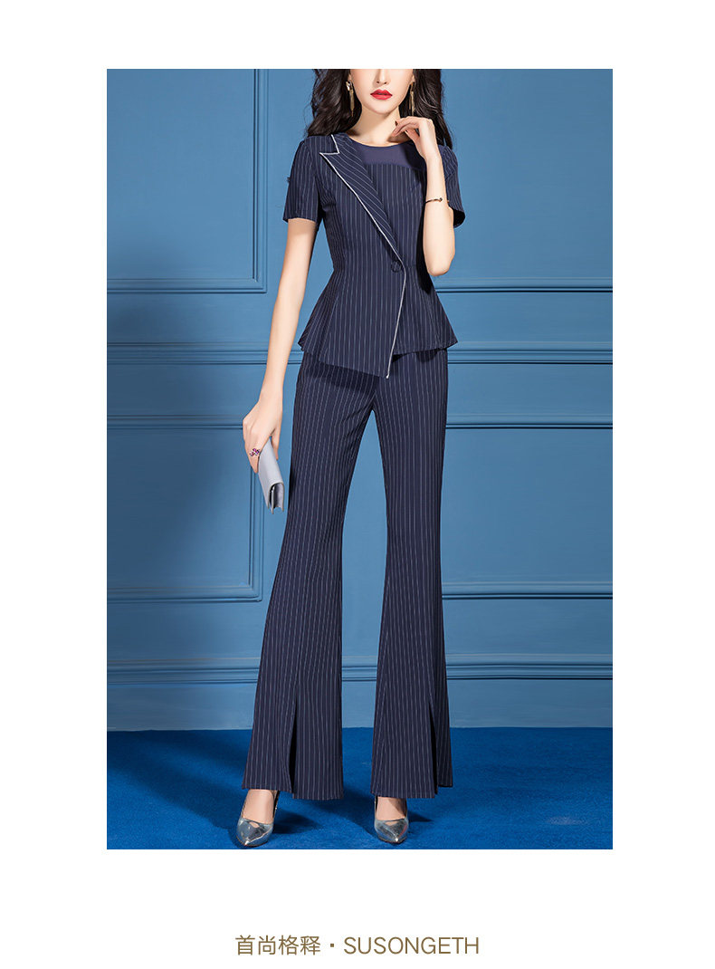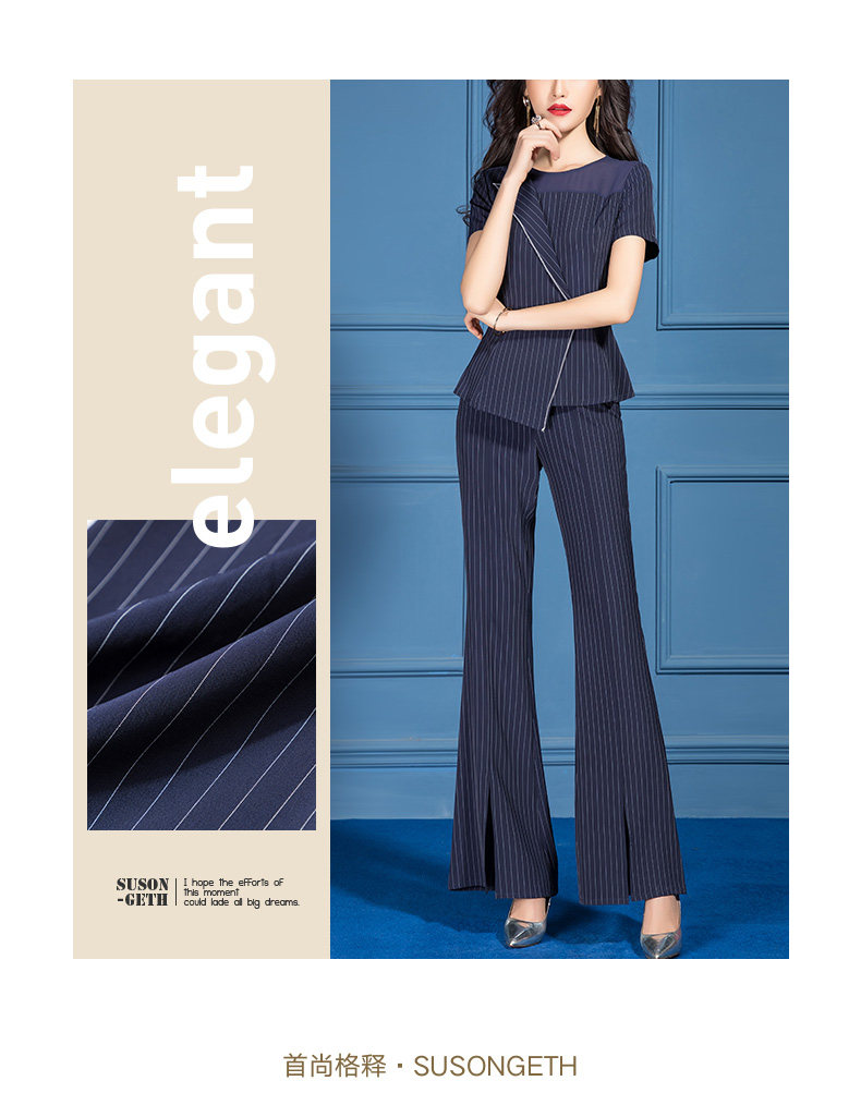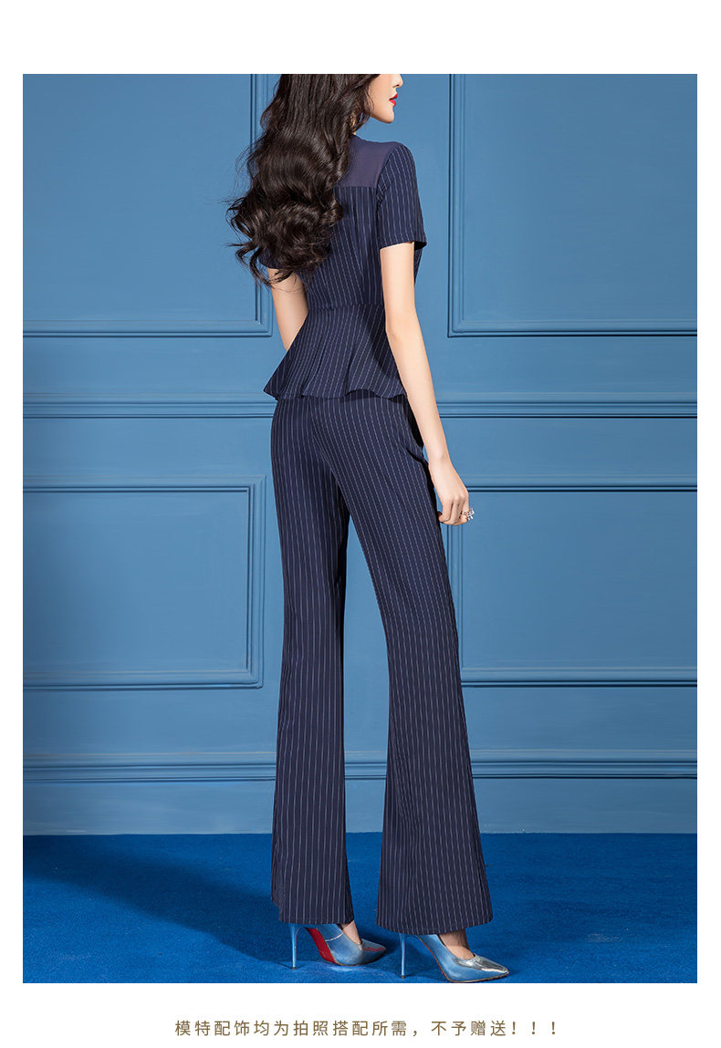SSGS-M067夏季新款时尚职业装气质蓝色条纹上衣喇叭裤两件套