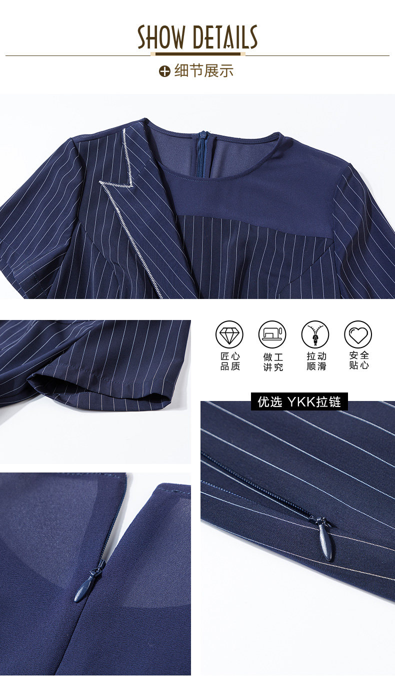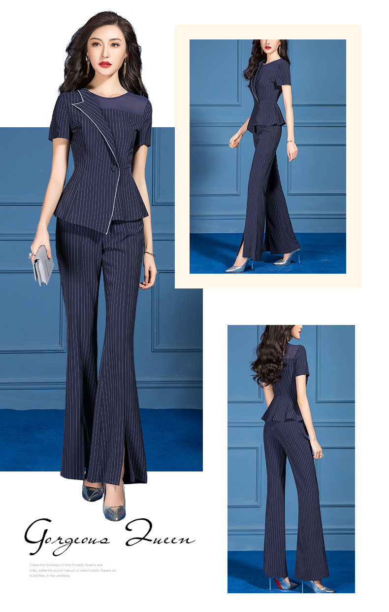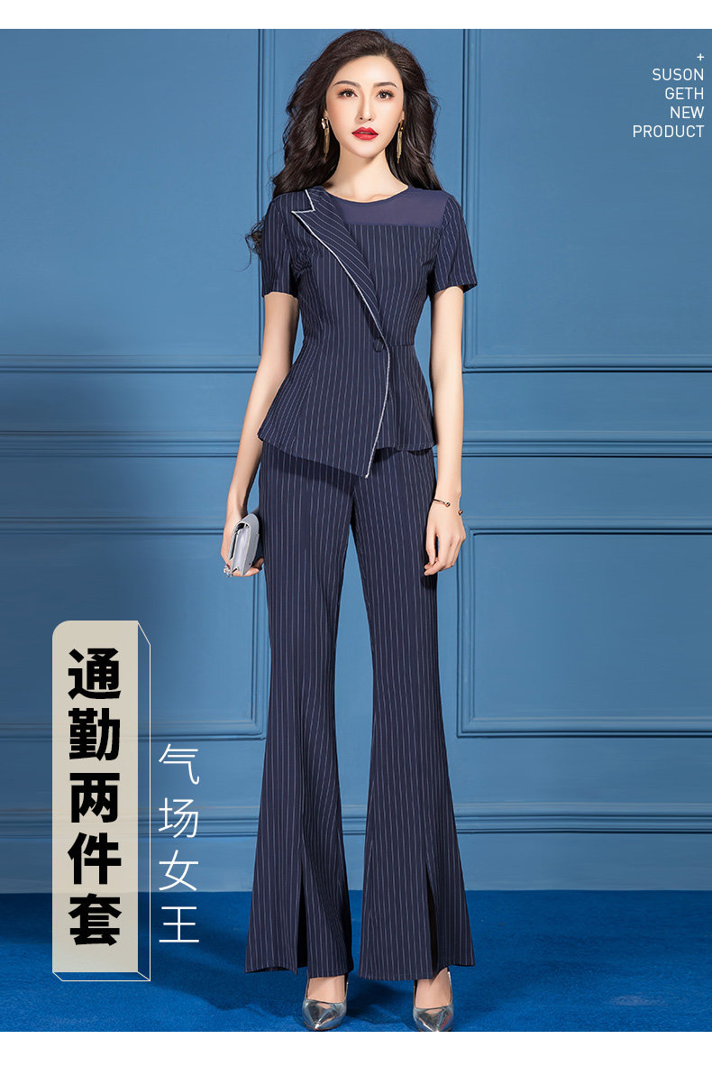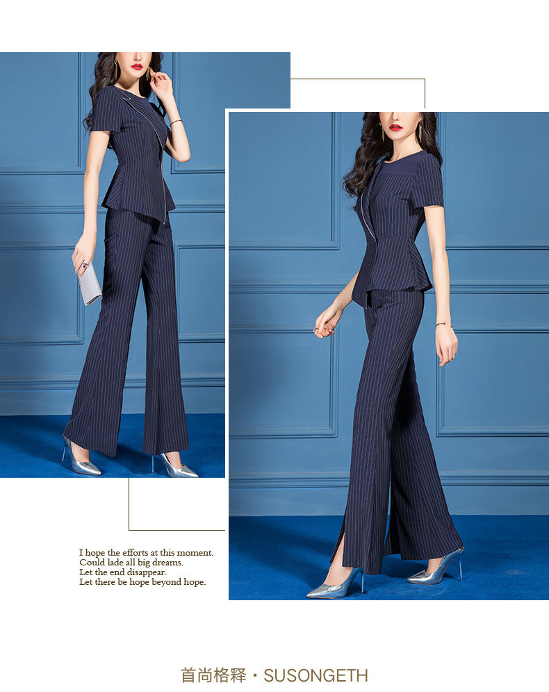 SSGS-M067夏季新款时尚职业装气质蓝色条纹上衣喇叭裤两件套