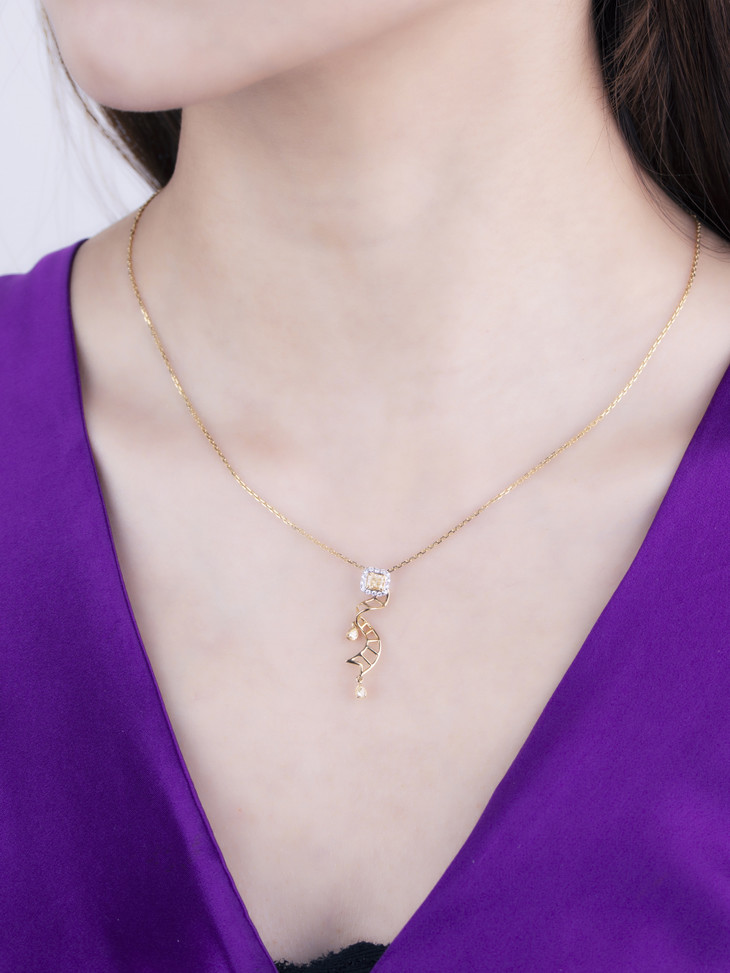 黄钻主体之下,18K金造型成蜿蜒曲折的胶片,上缀两粒水滴钻石,如岁月留下的美好印记。