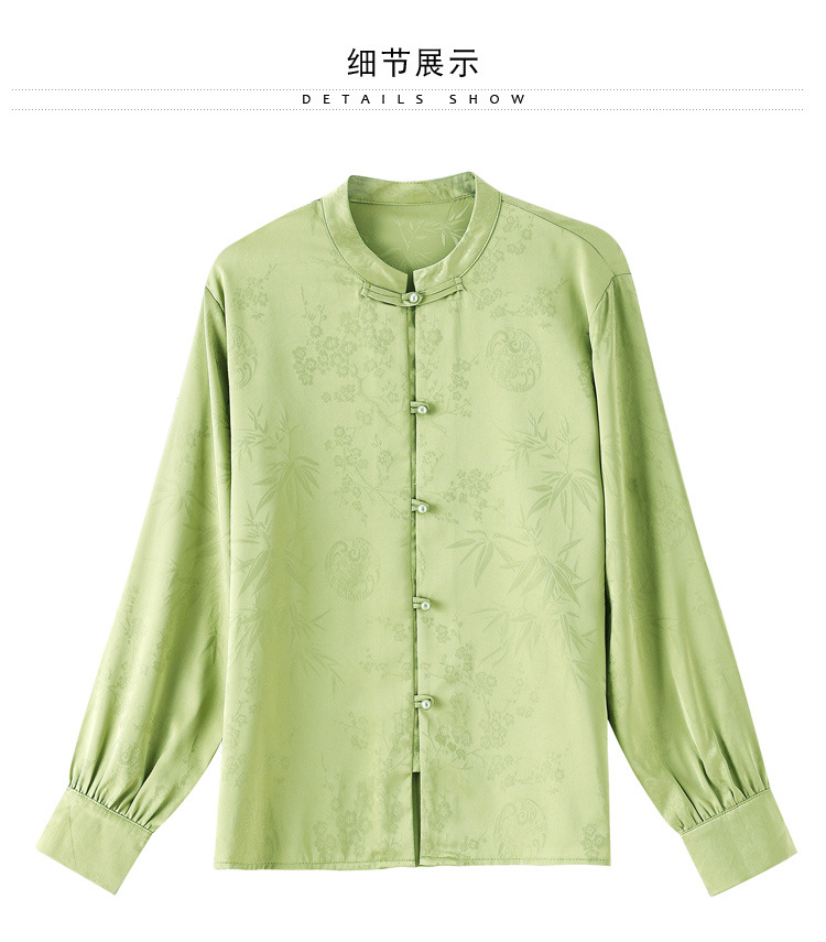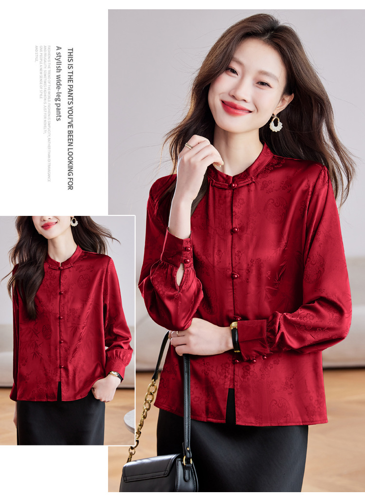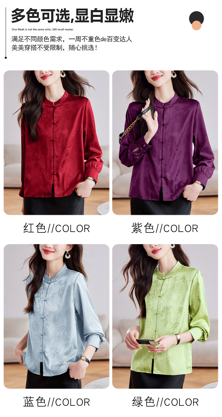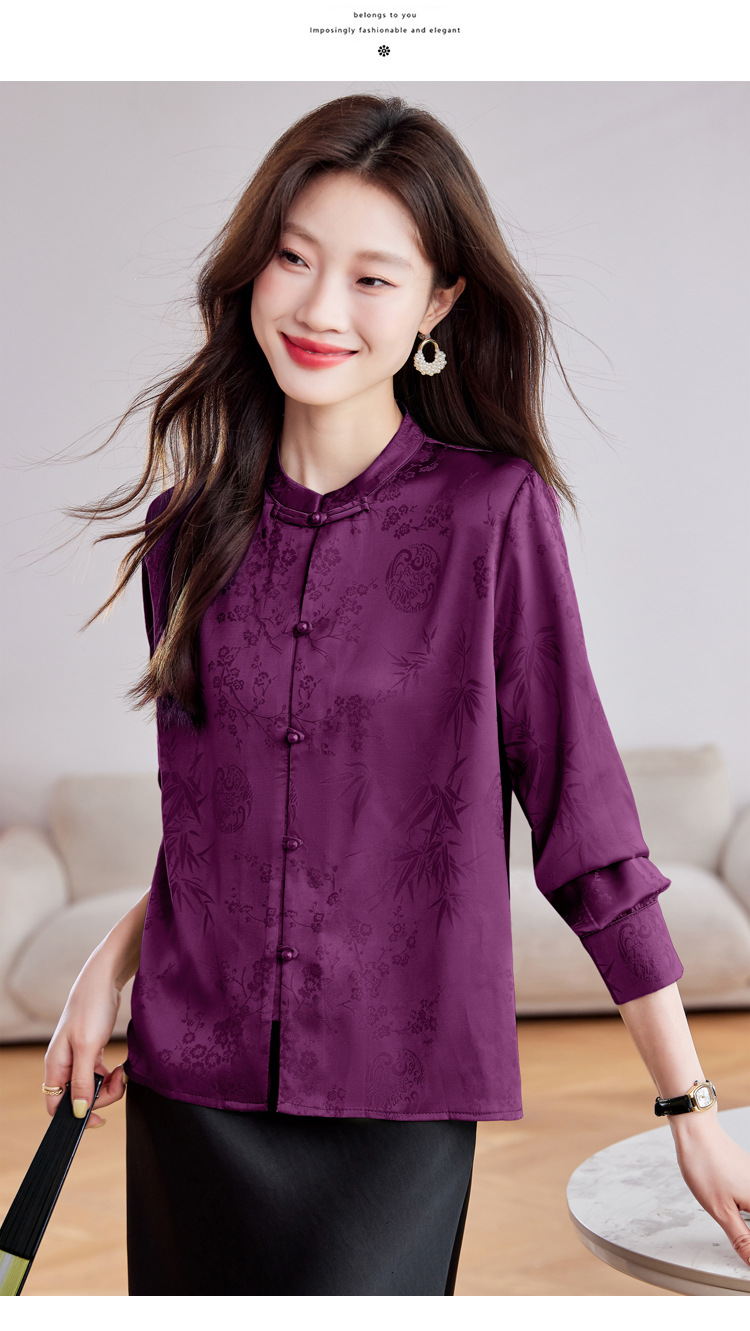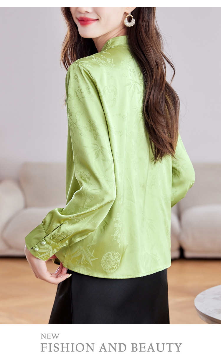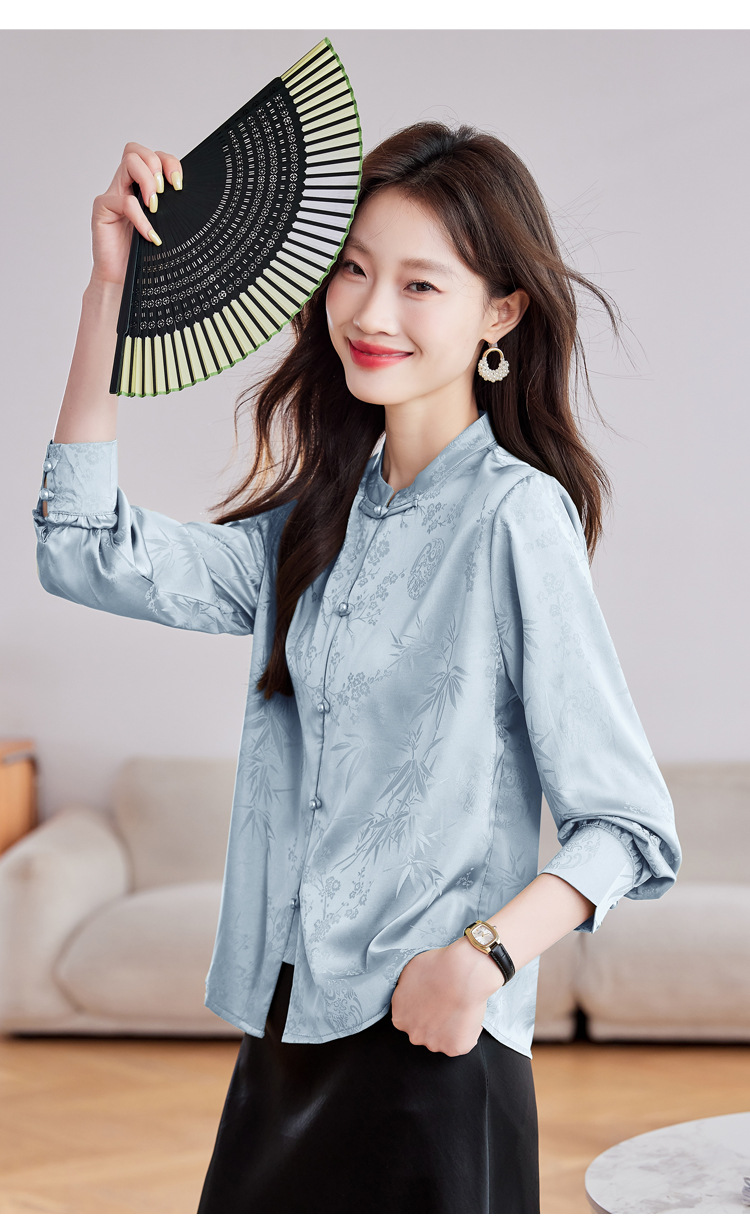 KQL369H9803中式缎面提花衬衫女2025秋季新款国风盘扣衬衫女立领上衣
