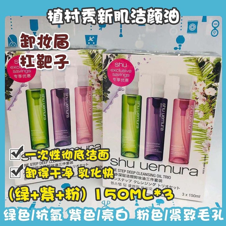 植村秀新肌洁颜油(绿+紫+粉) 150ML*3👍号称全球每30秒就售出一瓶🔥,植村秀家的的卸妆油可以说是卸妆届的扛靶子了👏,大多数人对它的评价都是👉卸得干净,乳化快,不紧绷等等~但它的特色不仅于此哦😍,提供清爽的洁肤效果和感觉🍃,一次性彻底洁面,无需重复清洁!#💚绿色绿茶卸妆油,抗氧化去黄/#💜紫色亮白卸妆油,抑制黑色素/#💖粉色樱花卸妆油,紧致毛孔,去角质去黑头。三合一的套装,性比价妥妥的🤗