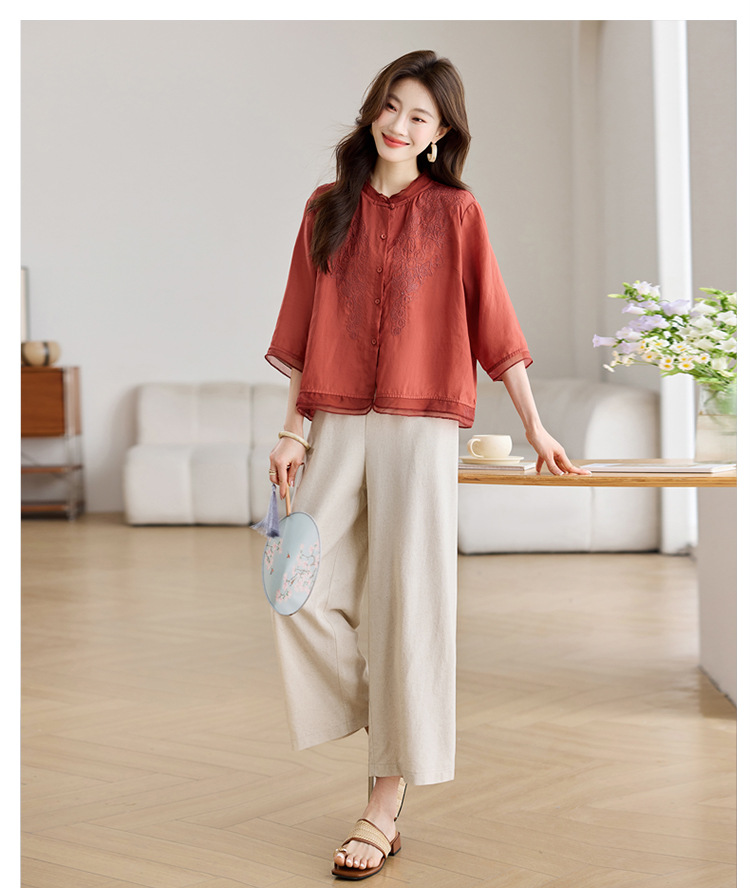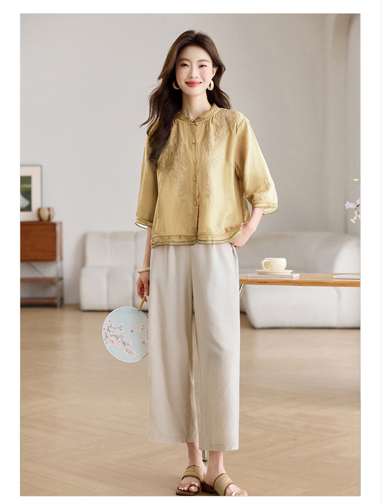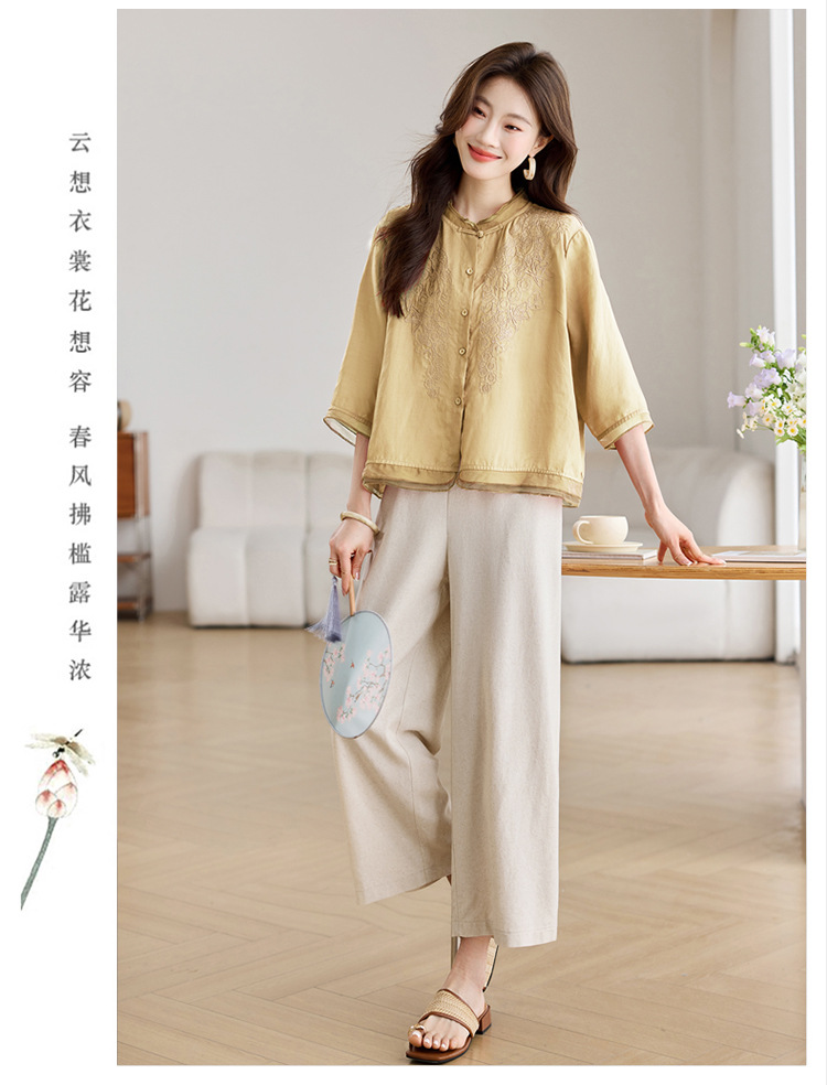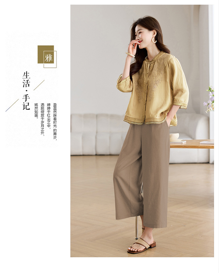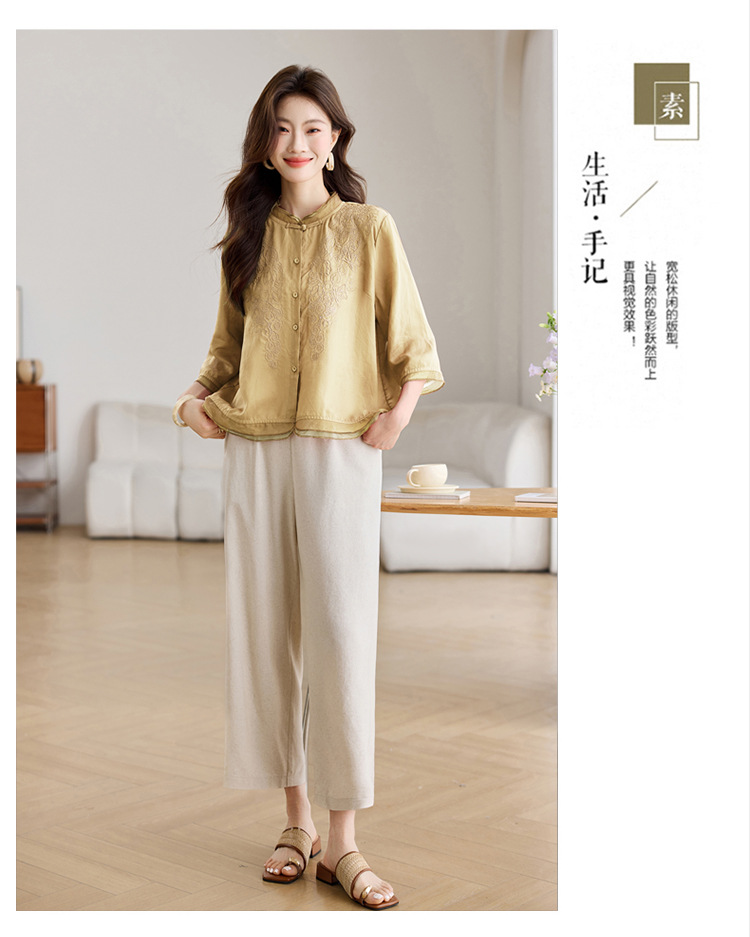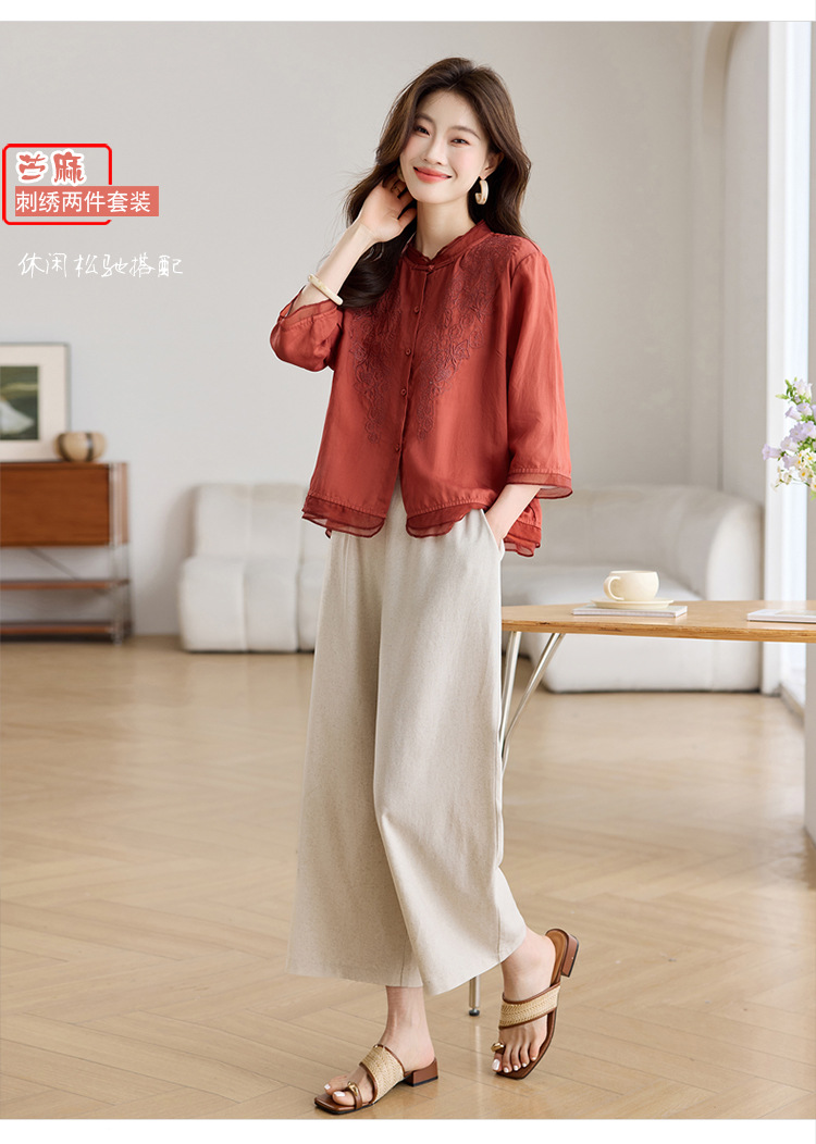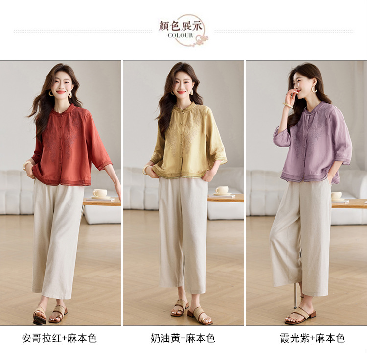 苎麻棉新中式国风,刺绣复古文艺衬衫七分裤两件套HR-LYW8567