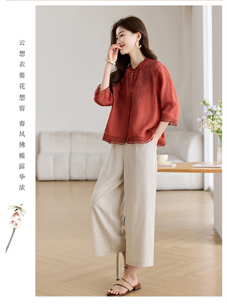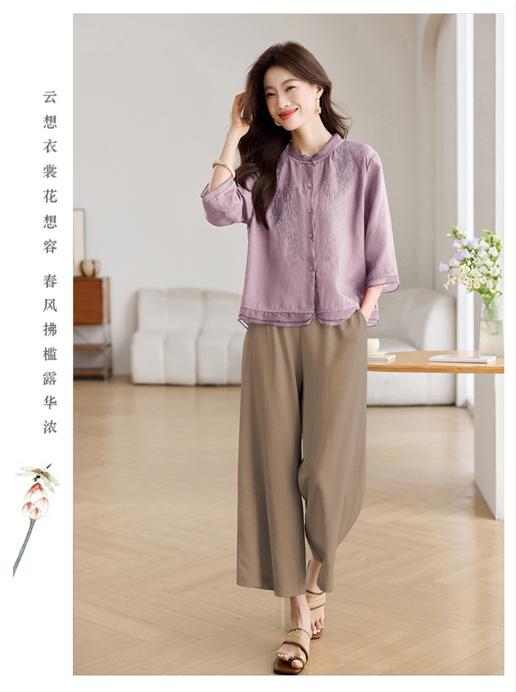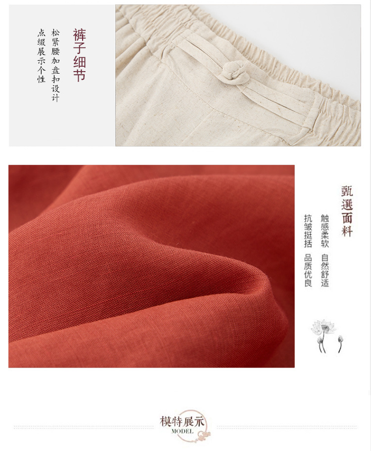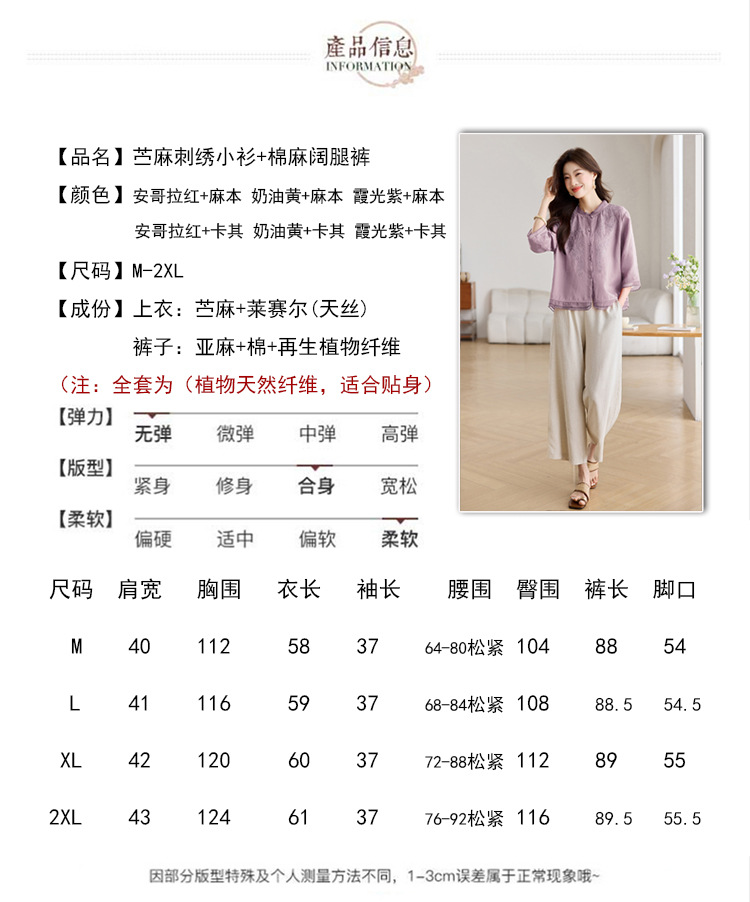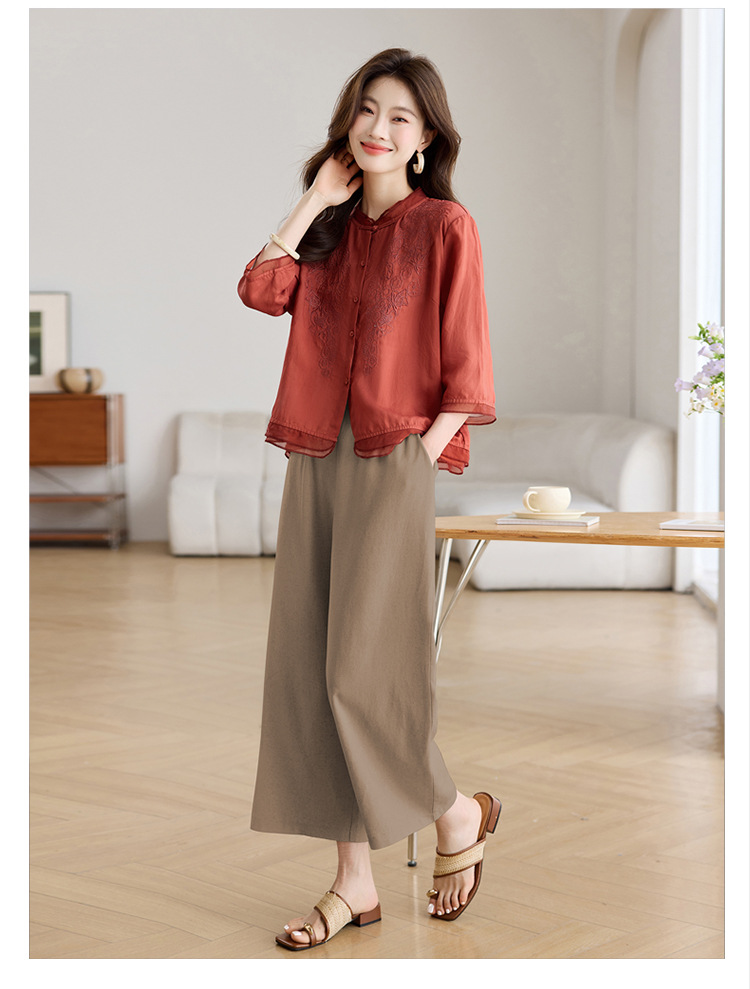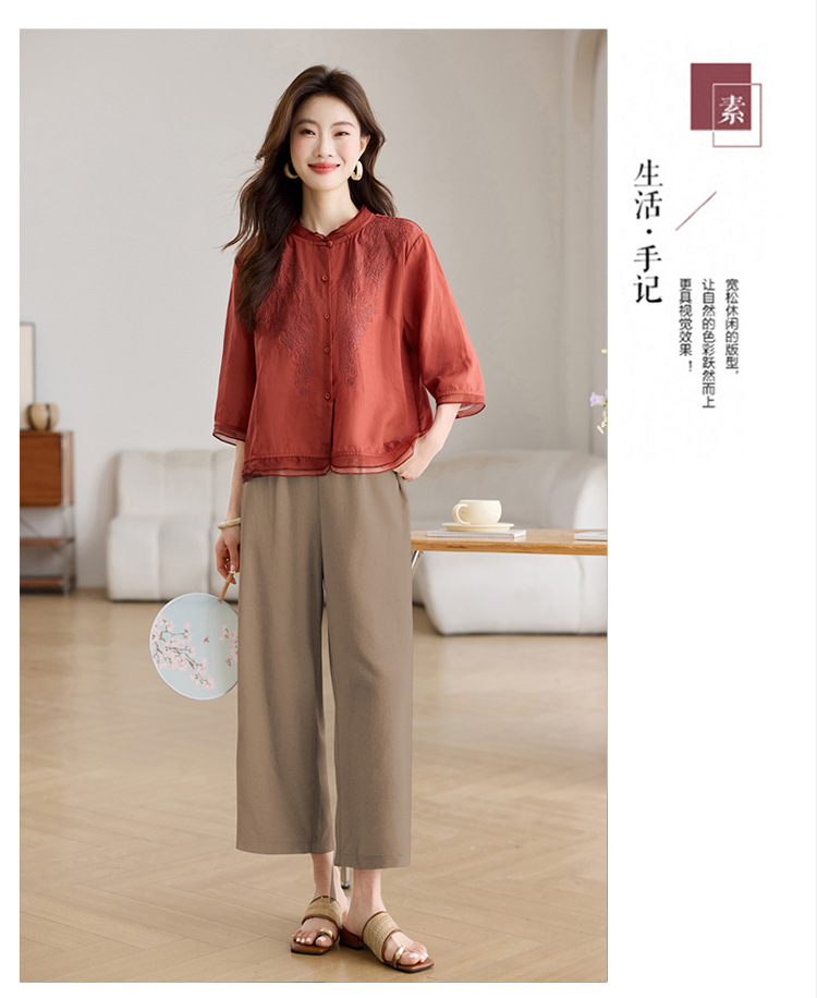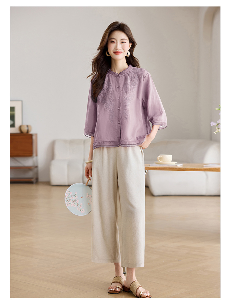 苎麻棉新中式国风,刺绣复古文艺衬衫七分裤两件套HR-LYW8567