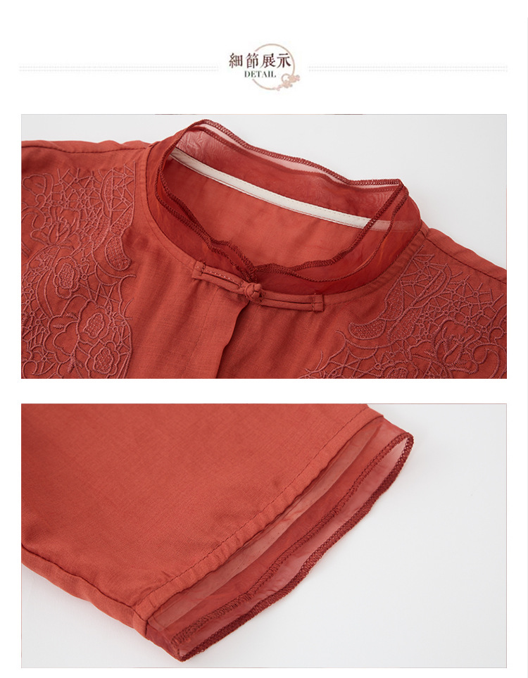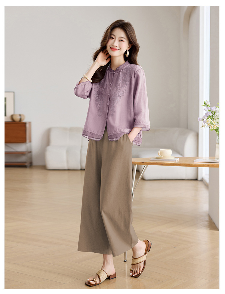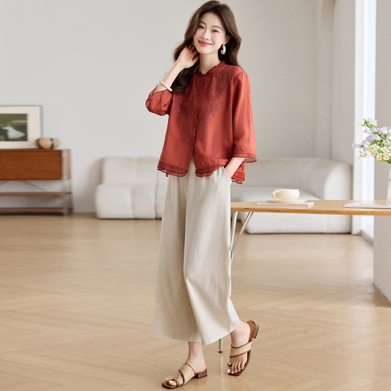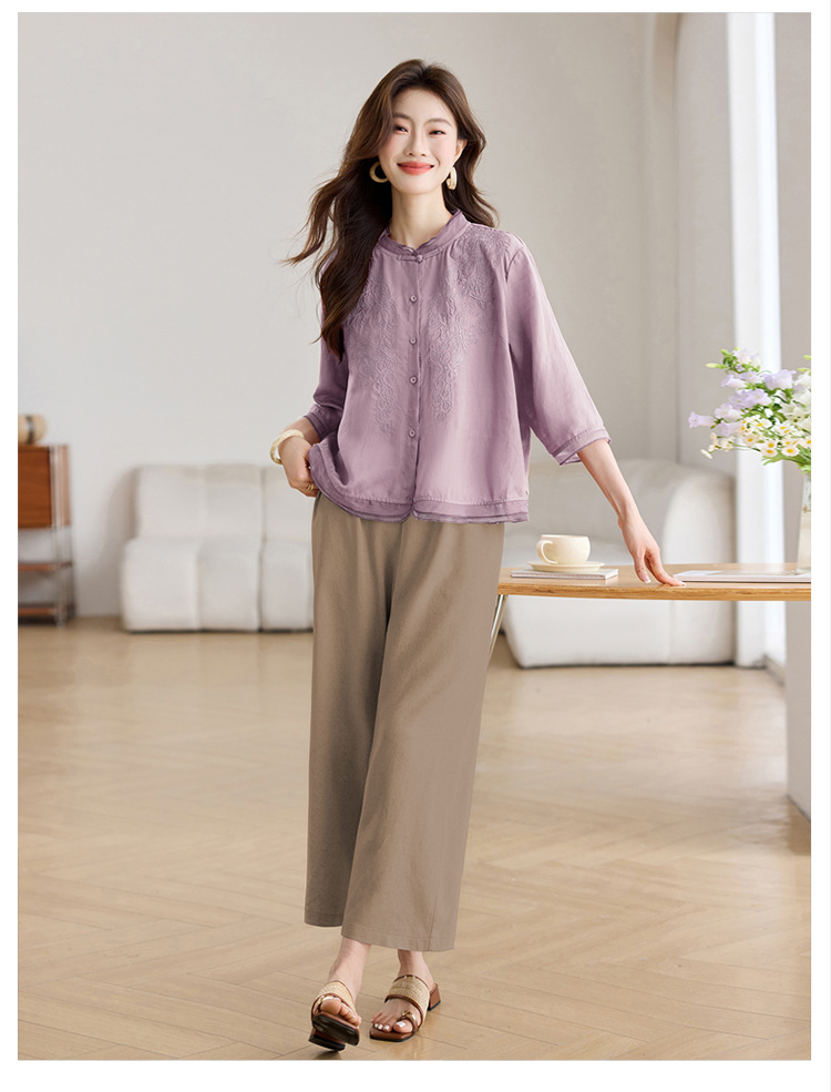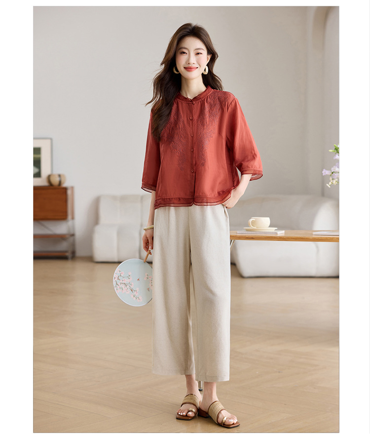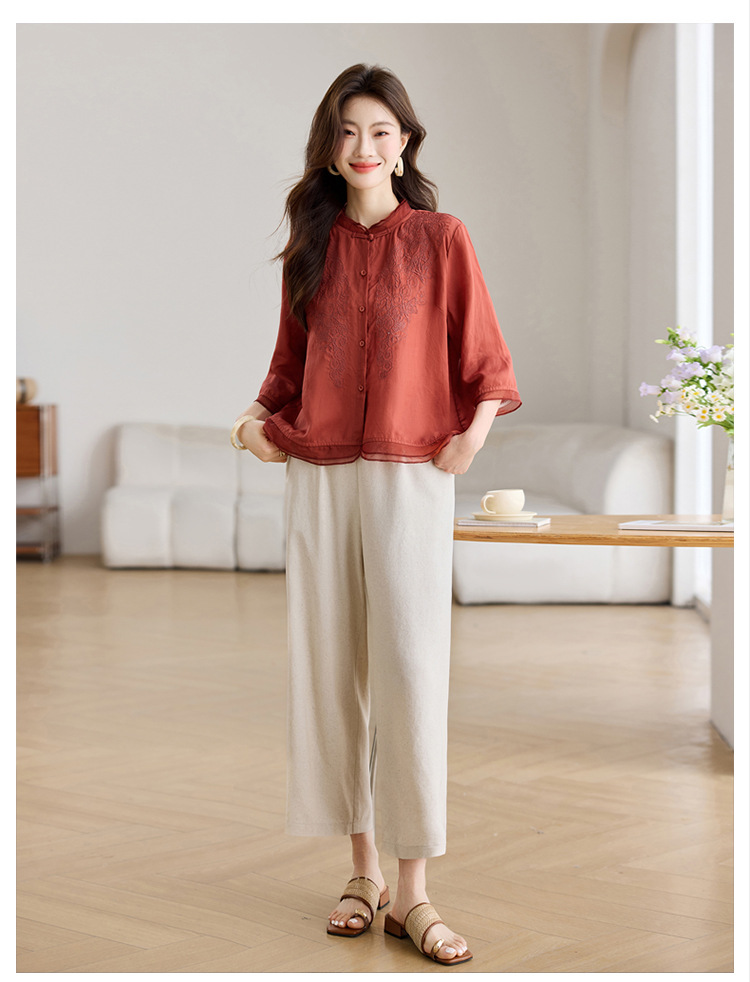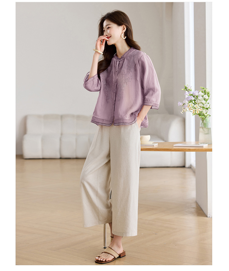 苎麻棉新中式国风,刺绣复古文艺衬衫七分裤两件套HR-LYW8567