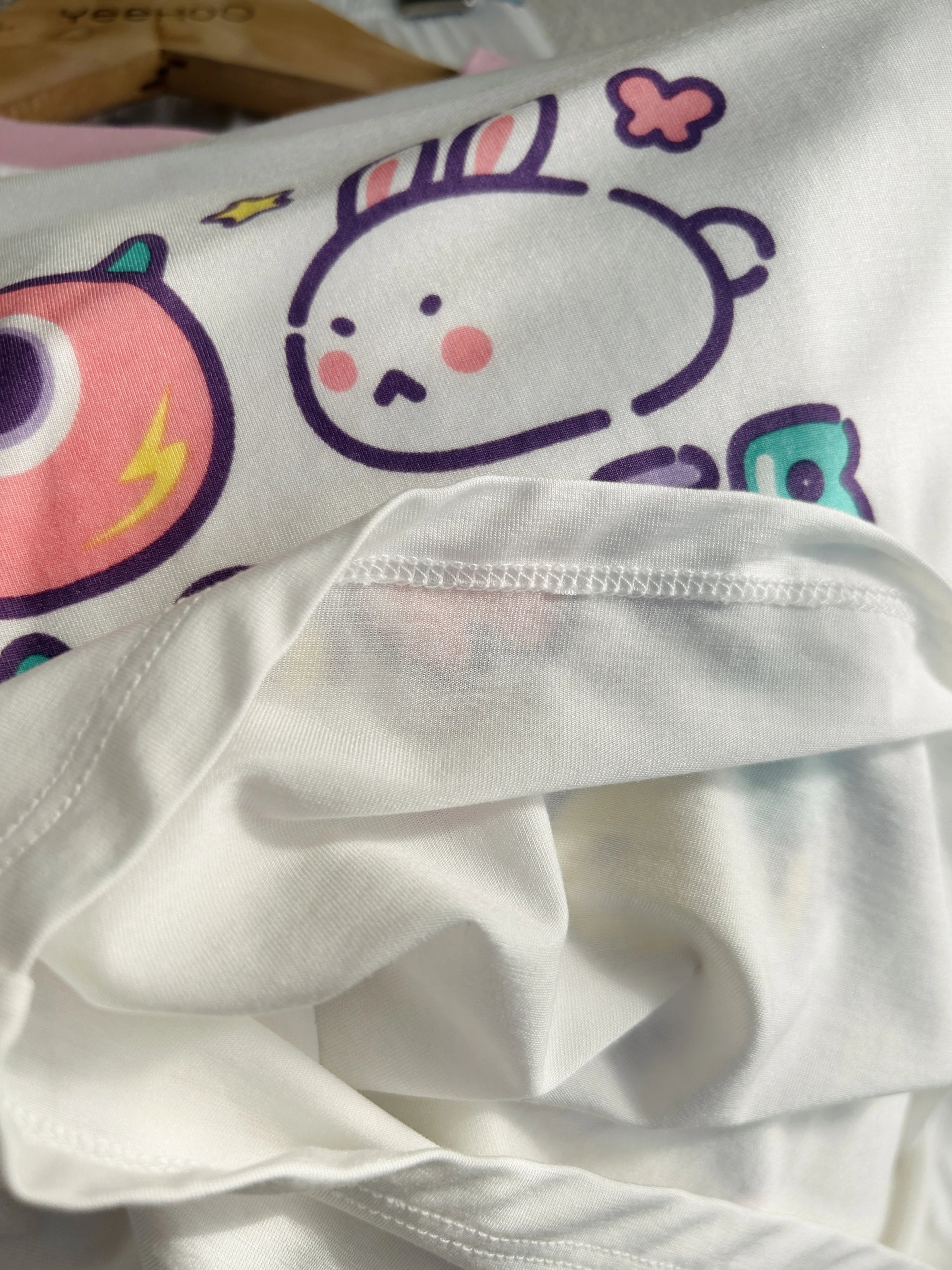 细节满分做工:圆领包边不勒脖子,没有多余线头,翻身不硌皮肤;宽松版型,怎么穿都超舒服!