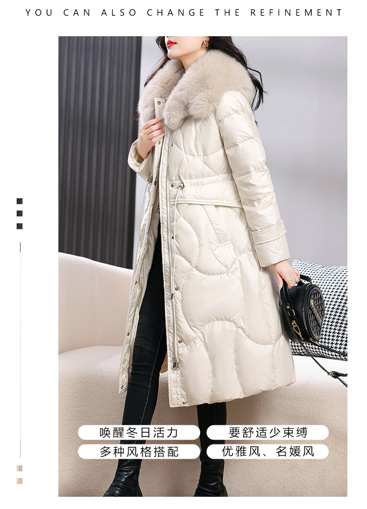 TC25440 卡其色白鸭绒羽绒服女中长款过膝2023冬时尚洋气狐狸毛领外套收腰 商品图0
