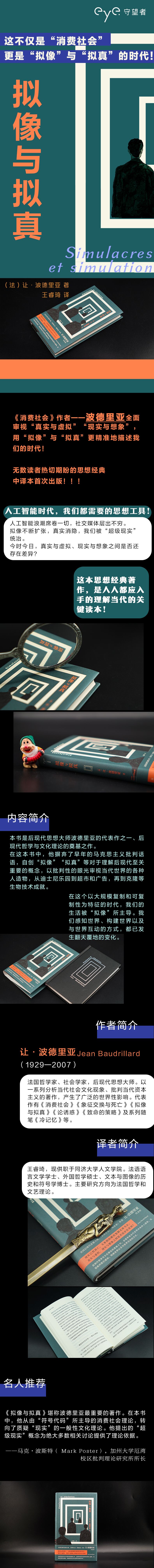 《拟像与拟真》堪称波德里亚最重要的著作。在本书中,他从由“符号代码”所主导的消费社会理论,转向了质疑“现实”的一般性文化理论。他提出的“超级现实”概念为绝大多数相关讨论提供了理论依据。