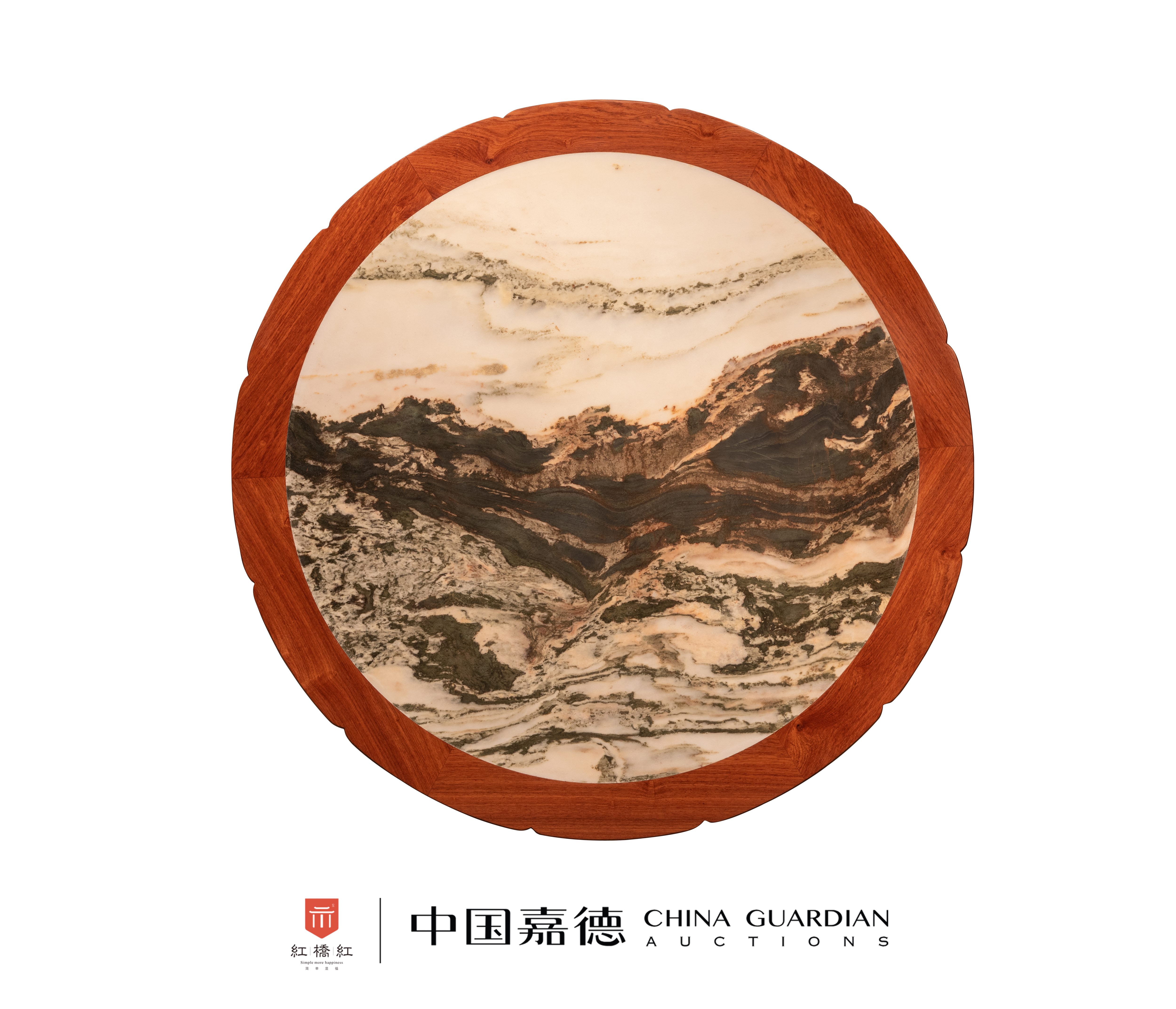 此桌借鉴了清代宫廷圆桌样式,以缅甸花梨木制,圆形桌面镶嵌大理石,水墨纹自然美观,边抹锼为花朵状,边抹下面的挂檐以镂雕技法雕刻西番莲、石榴等,为多子多福、瓜瓞绵延、益寿延年的吉祥寓意。底座与面之间以瓶形柱联结,又安角牙,既美观,又起到固定的作用。底座亦为花瓣状,与桌面上下呼应,底部锼出壸门形,沿边起线。整器雕工精细,榫卯严谨,以花梨木结合大理石,相得益彰。