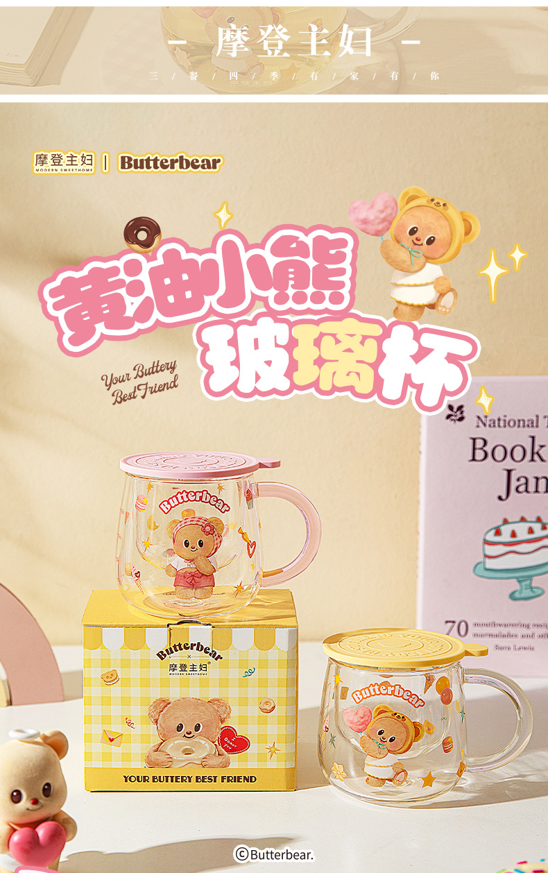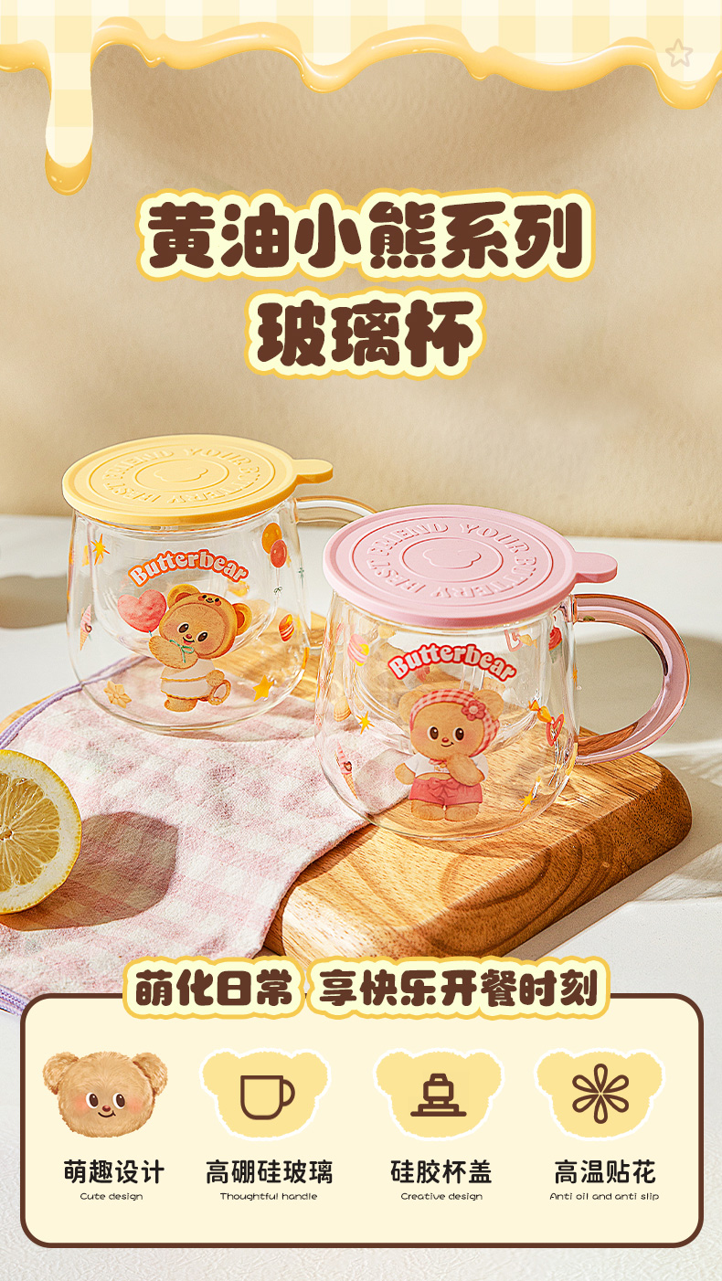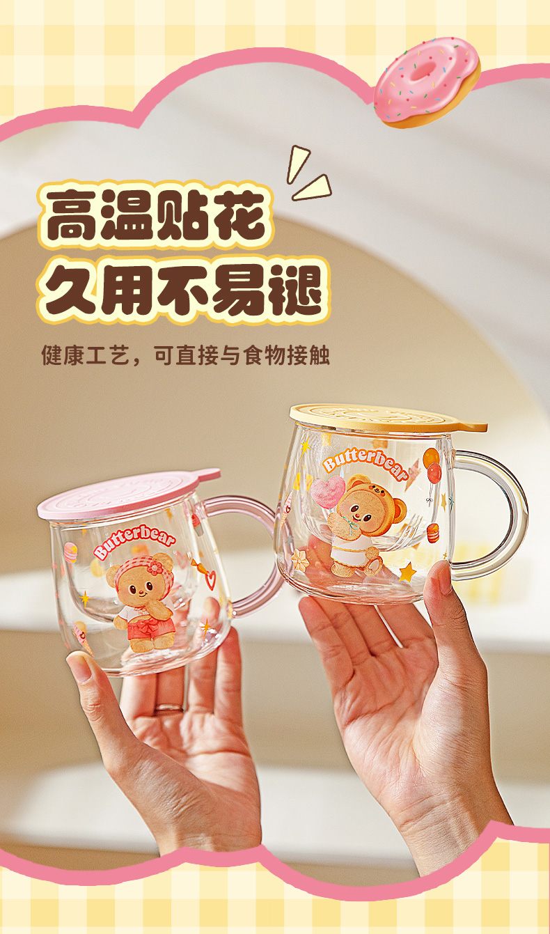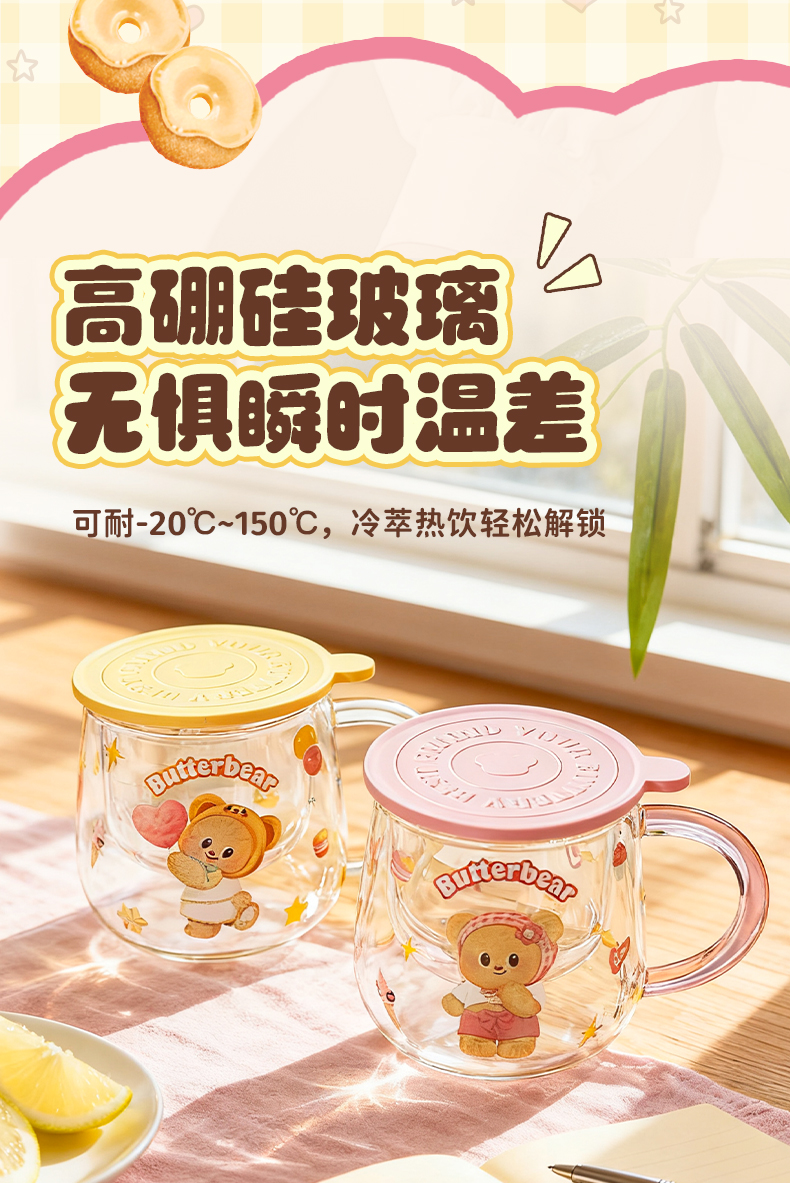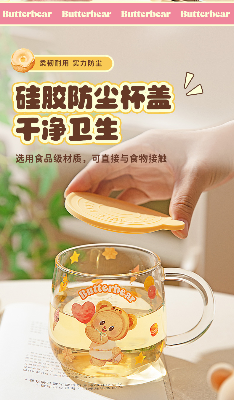 【摩登主妇&黄油小熊】高硼硅玻璃杯带盖水杯家用牛奶杯饮料杯子