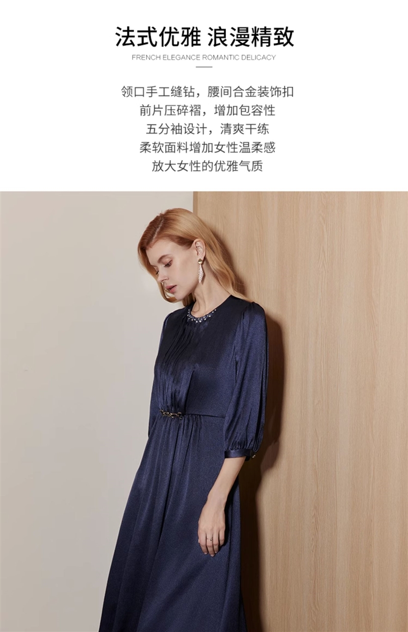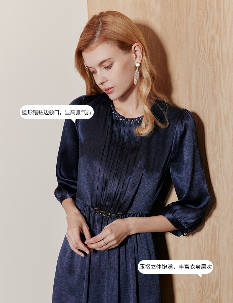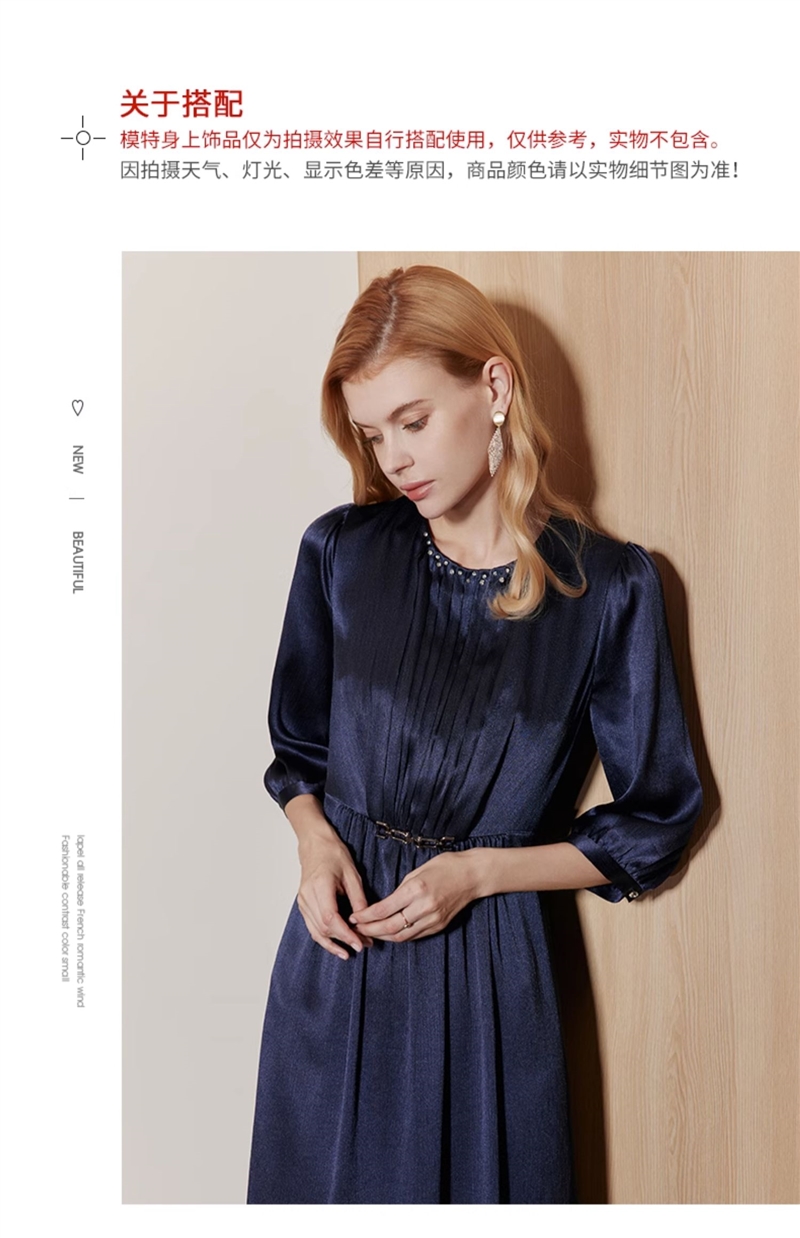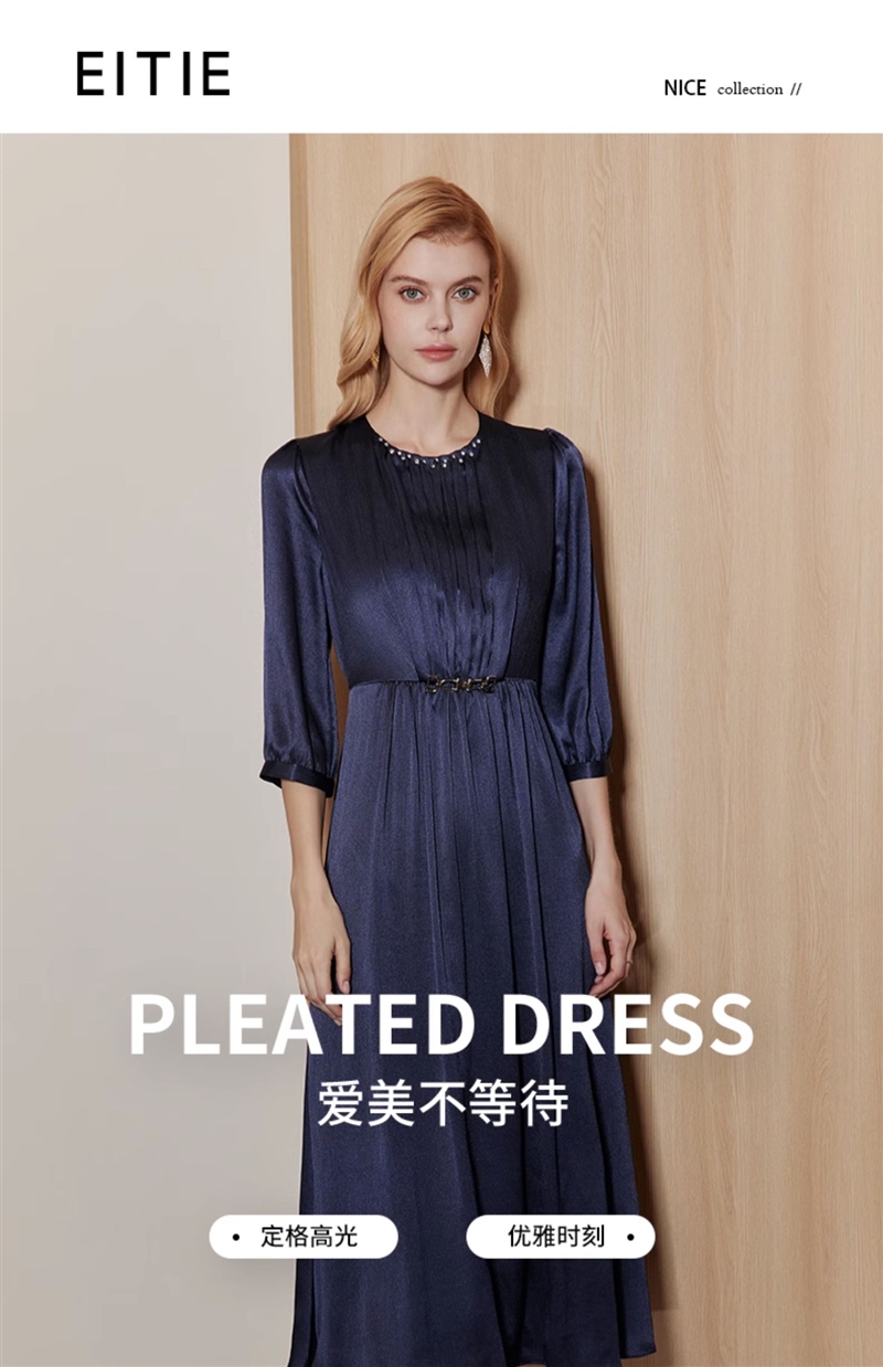 EITIE爱特爱精致钉珠优雅缎面垂坠收腰压褶显瘦连衣裙秋季新款A07119