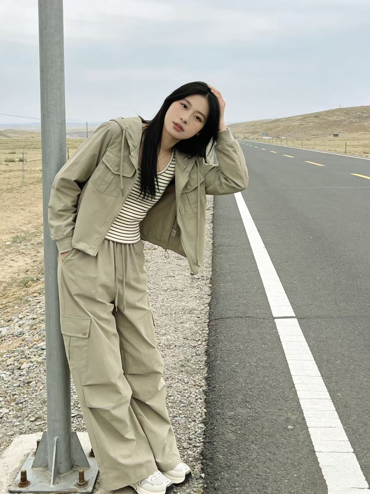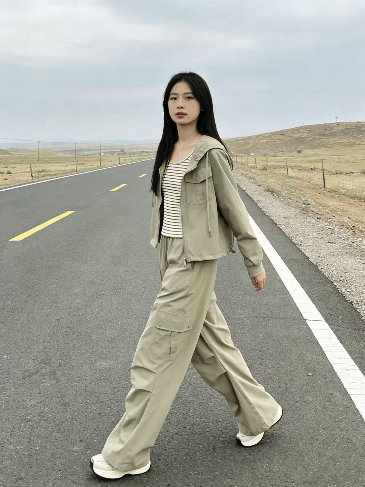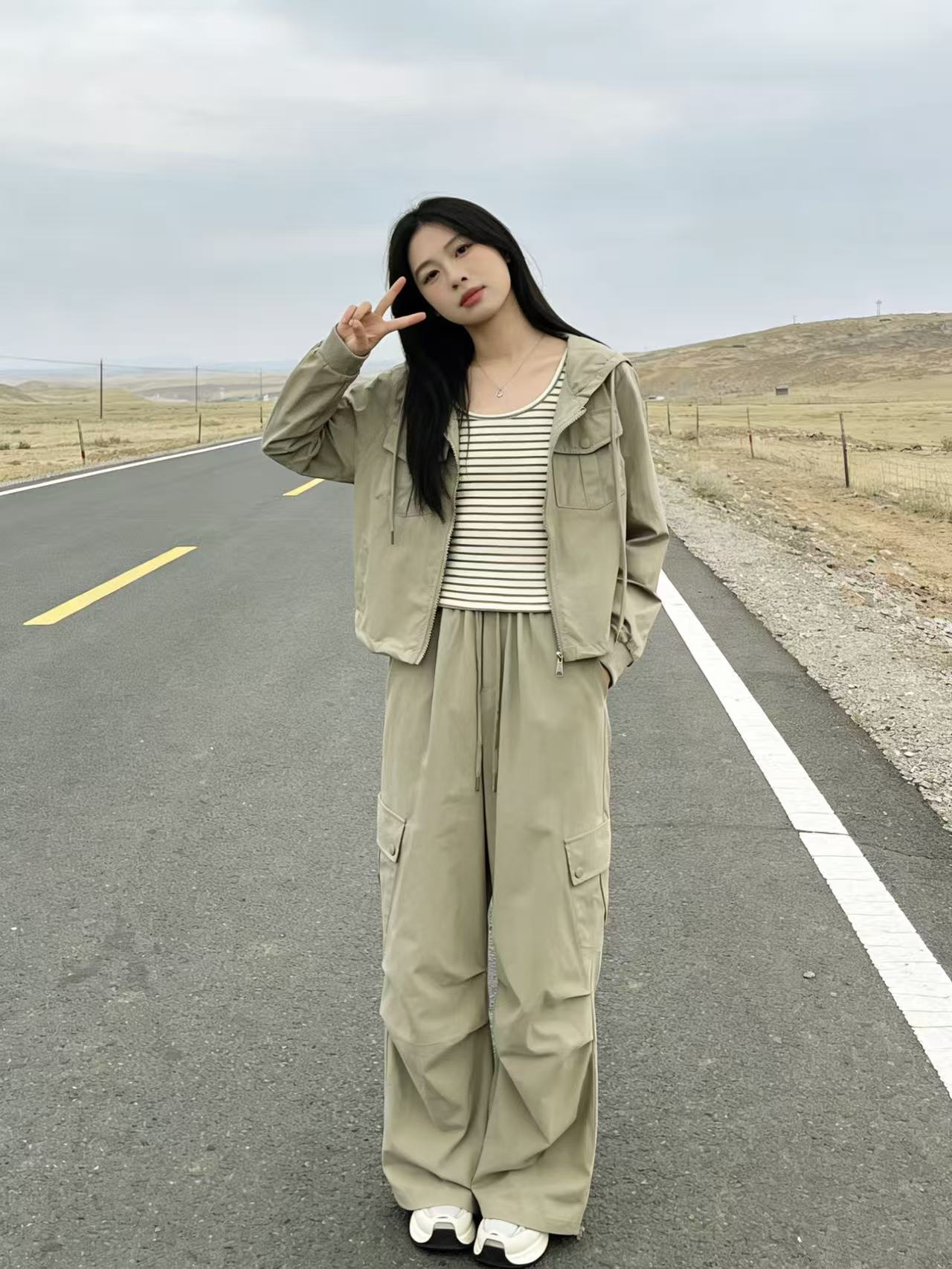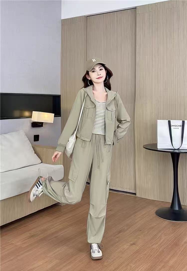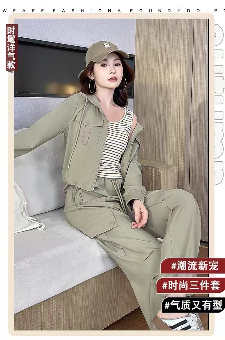 活动爆款【自营】衣周期~(三件套)A06休闲连帽外套➕条纹背心➕休闲工装裤-喜出