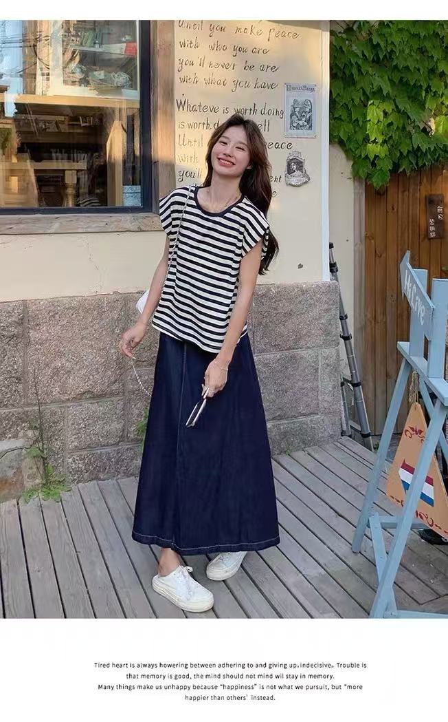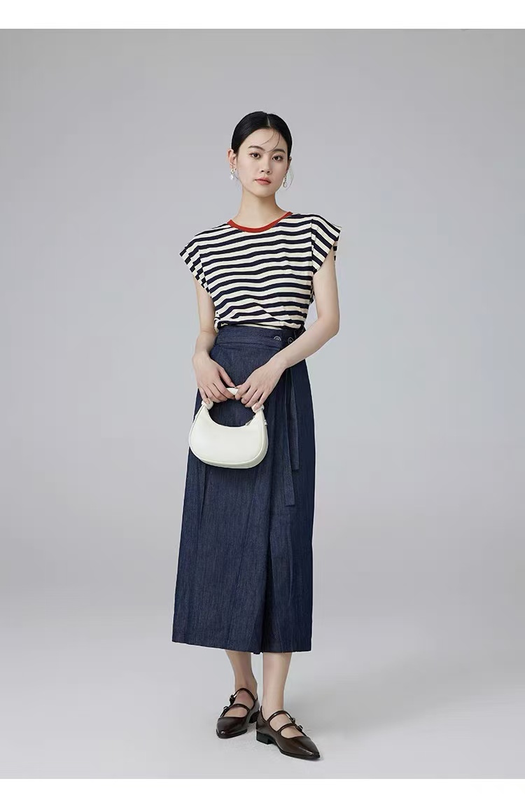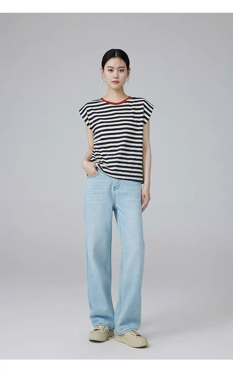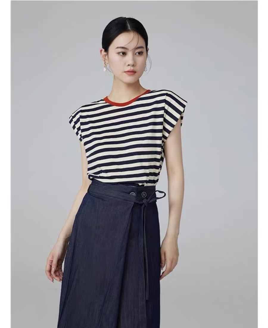 清仓价2025~55332条纹撞色领无袖薄款短袖T恤-喜出