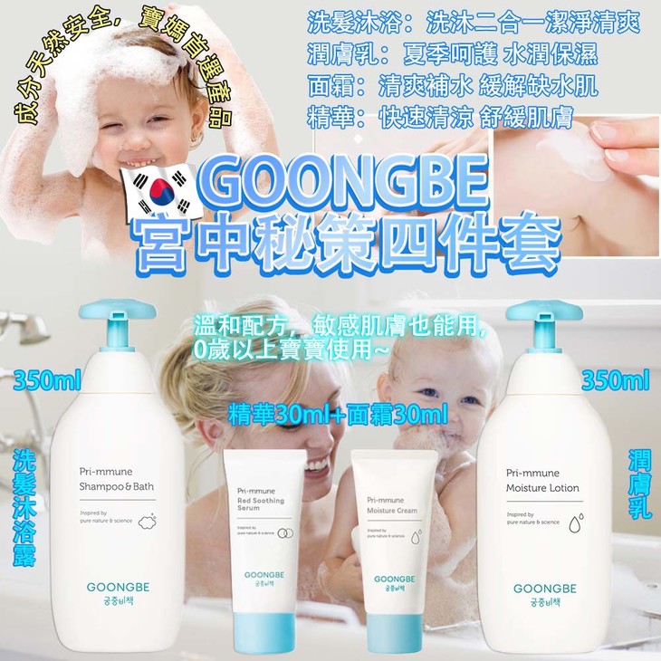 👑GOONGBE 宫中秘策四件套 👍成分天然安全,宝妈首选产品 💗柔和无刺激、低刺激性的沐浴套装 ✨洗发沐浴:无残留,快速洗净的泡沫、舒缓干燥肌肤 💓润肤乳:帮助宝宝肌肤补水保湿,改善婴儿肌肤屏障, 🔥面霜:强力保湿肌肤屏障,打造细腻的婴儿肌肤 💎精华:婴儿体温易升高,可快速清凉舒缓减温宝宝肌肤 💍一套从头到脚,都安排上。保湿滋润,呵护婴儿脆弱肌 ✅温和配方,敏感肌肤也能用,0岁以上宝宝使用~ 【套盒包括】:洗发沐浴露350ml+润肤乳350ml+面霜30ml+精华30ml