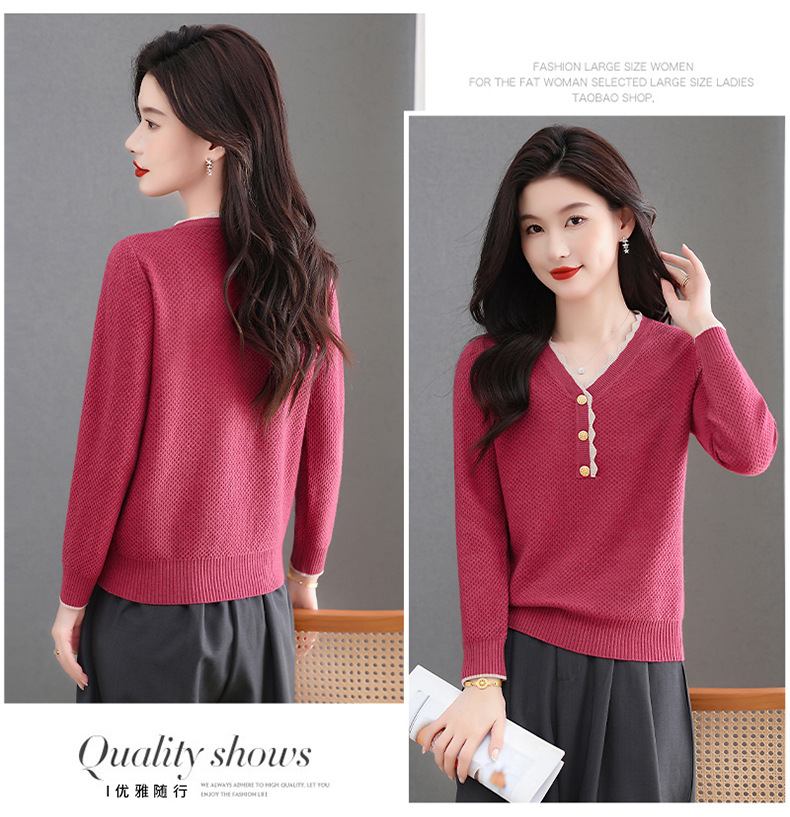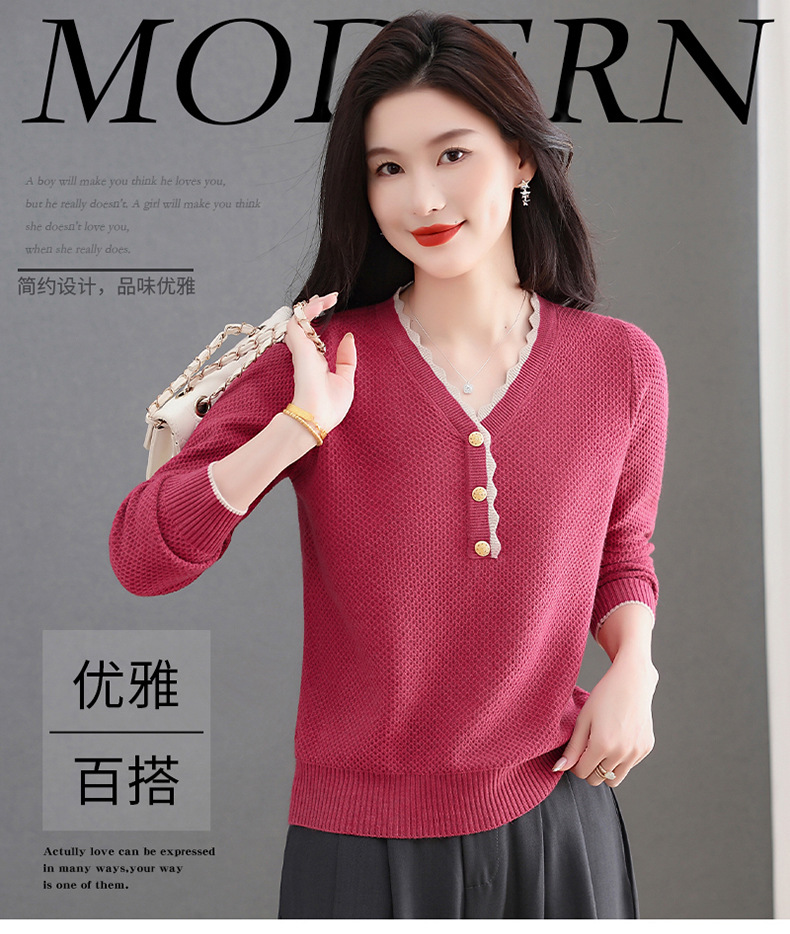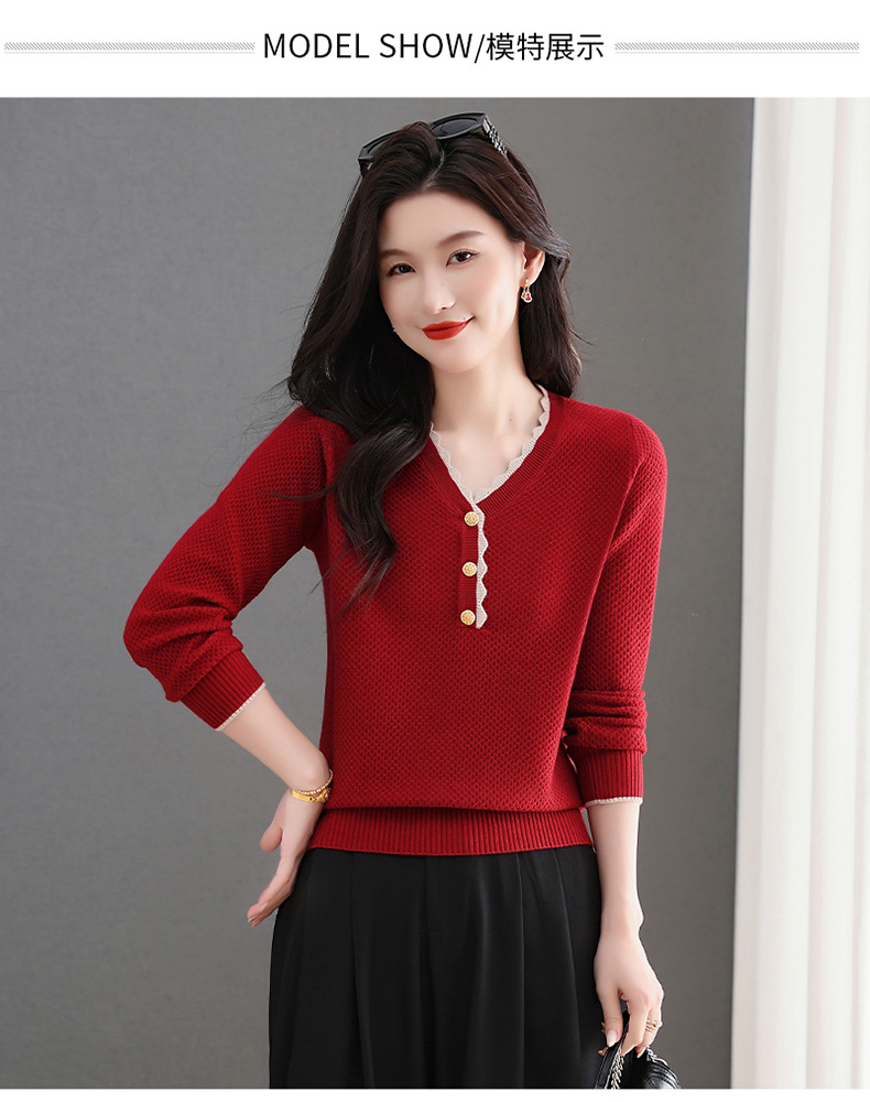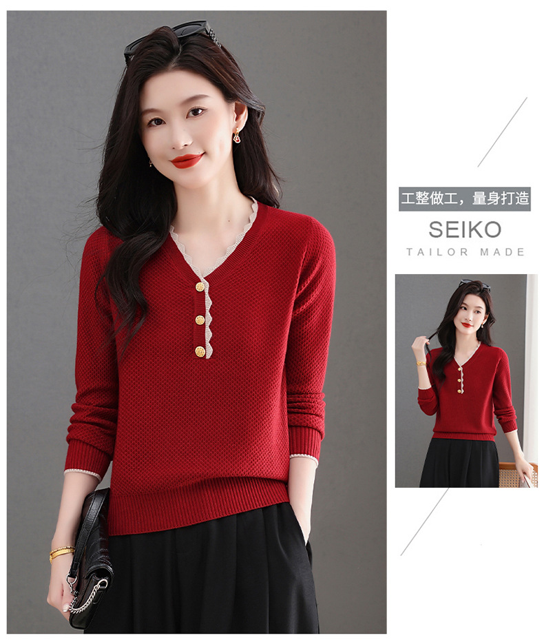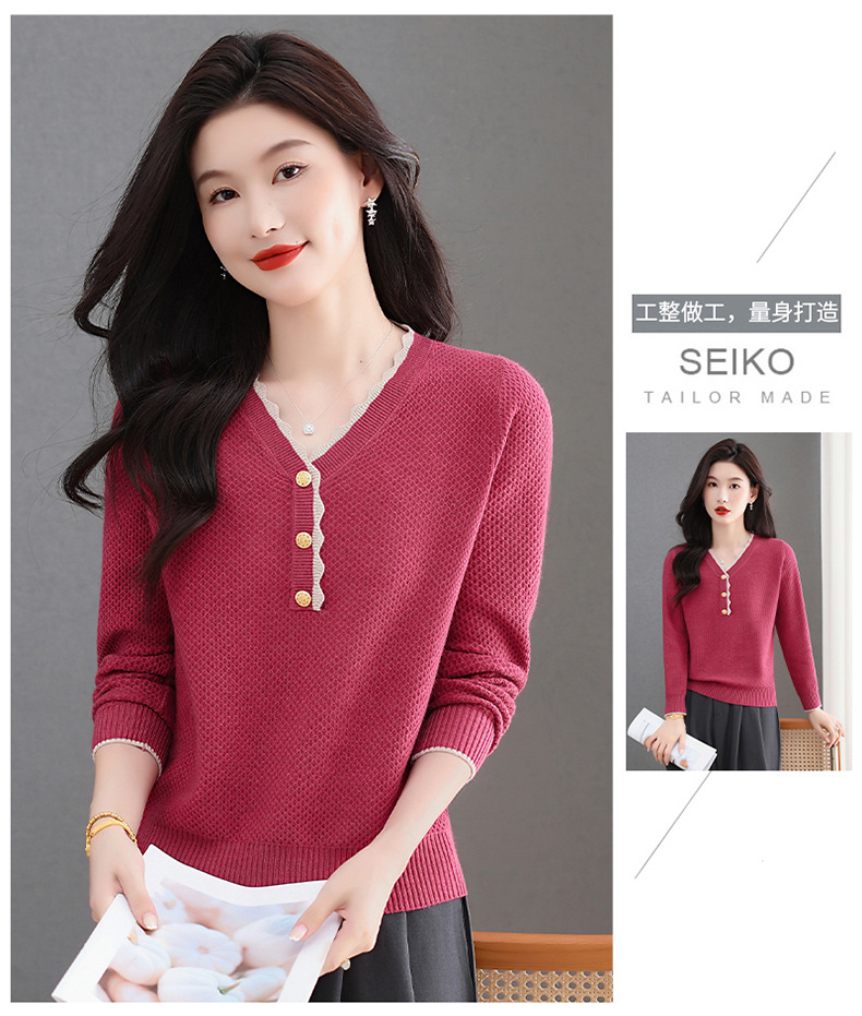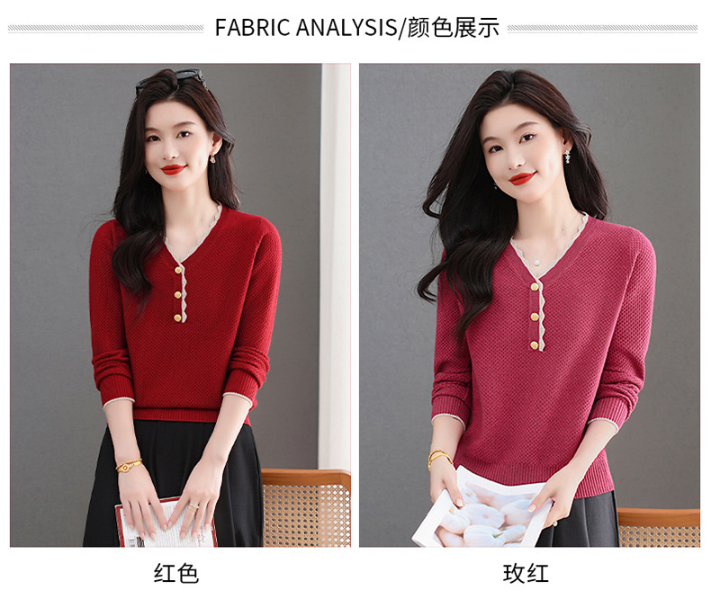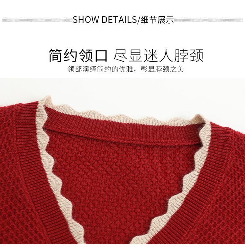CC女士早秋红色毛衣撞色领边针织衫长袖上衣秋装2025新款V领打底衫