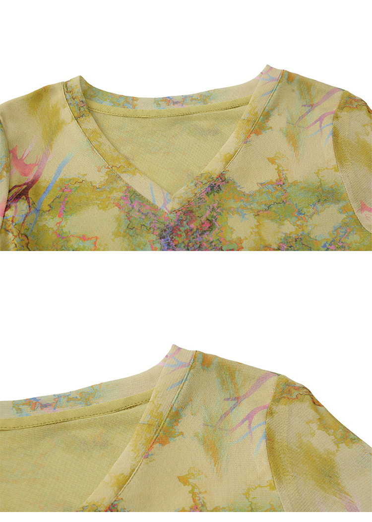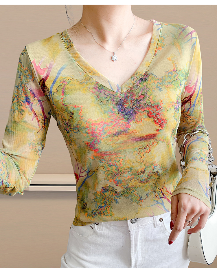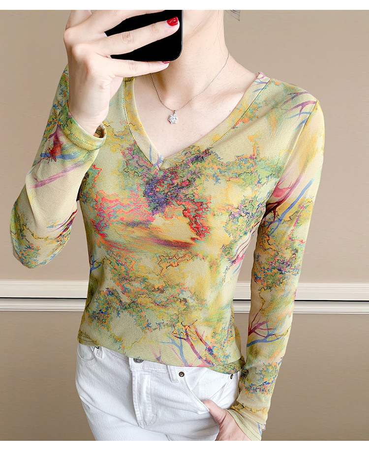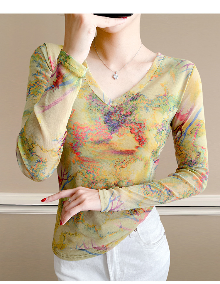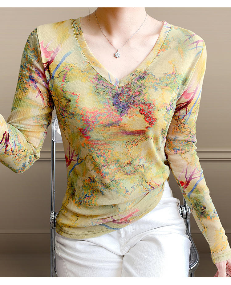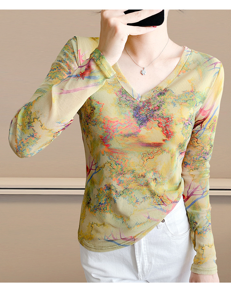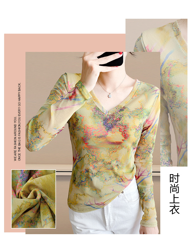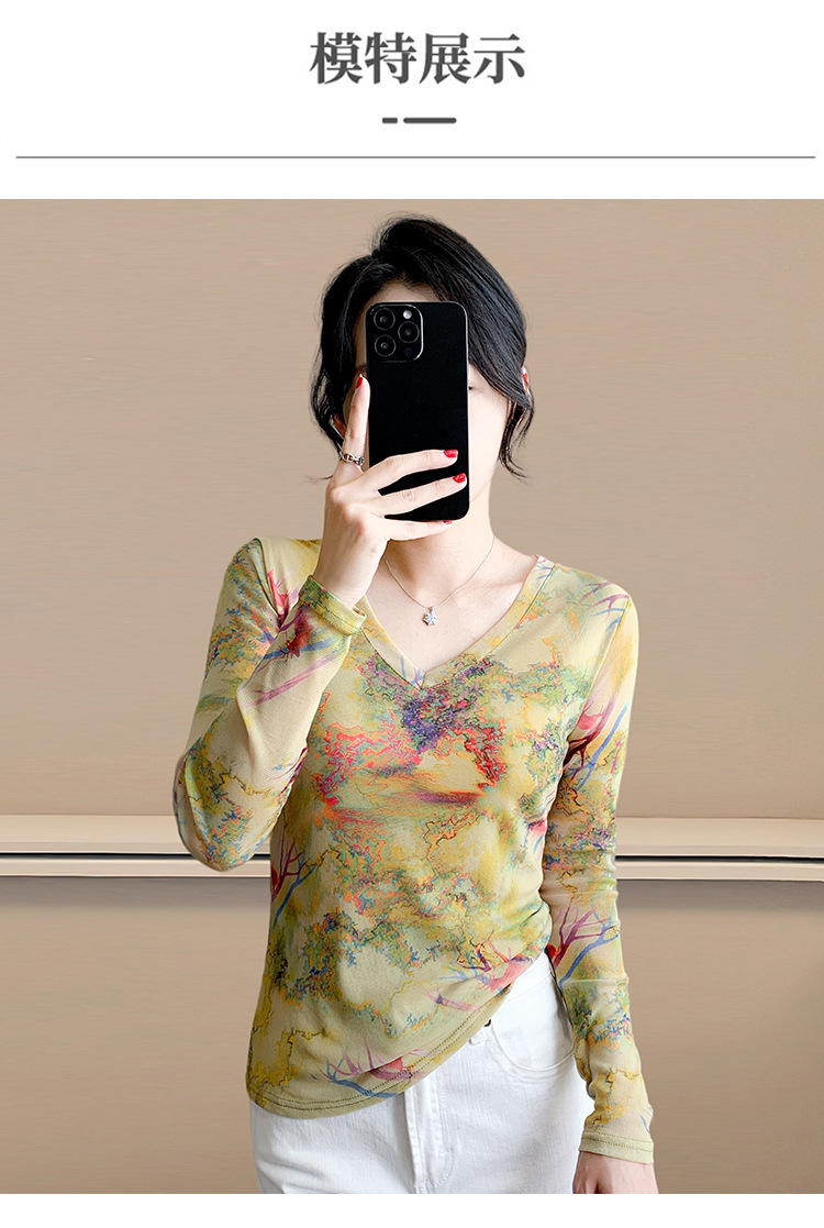 KQL欧货女装2025秋冬时尚洋气高弹网长袖印花V领T恤打底衫上衣批发