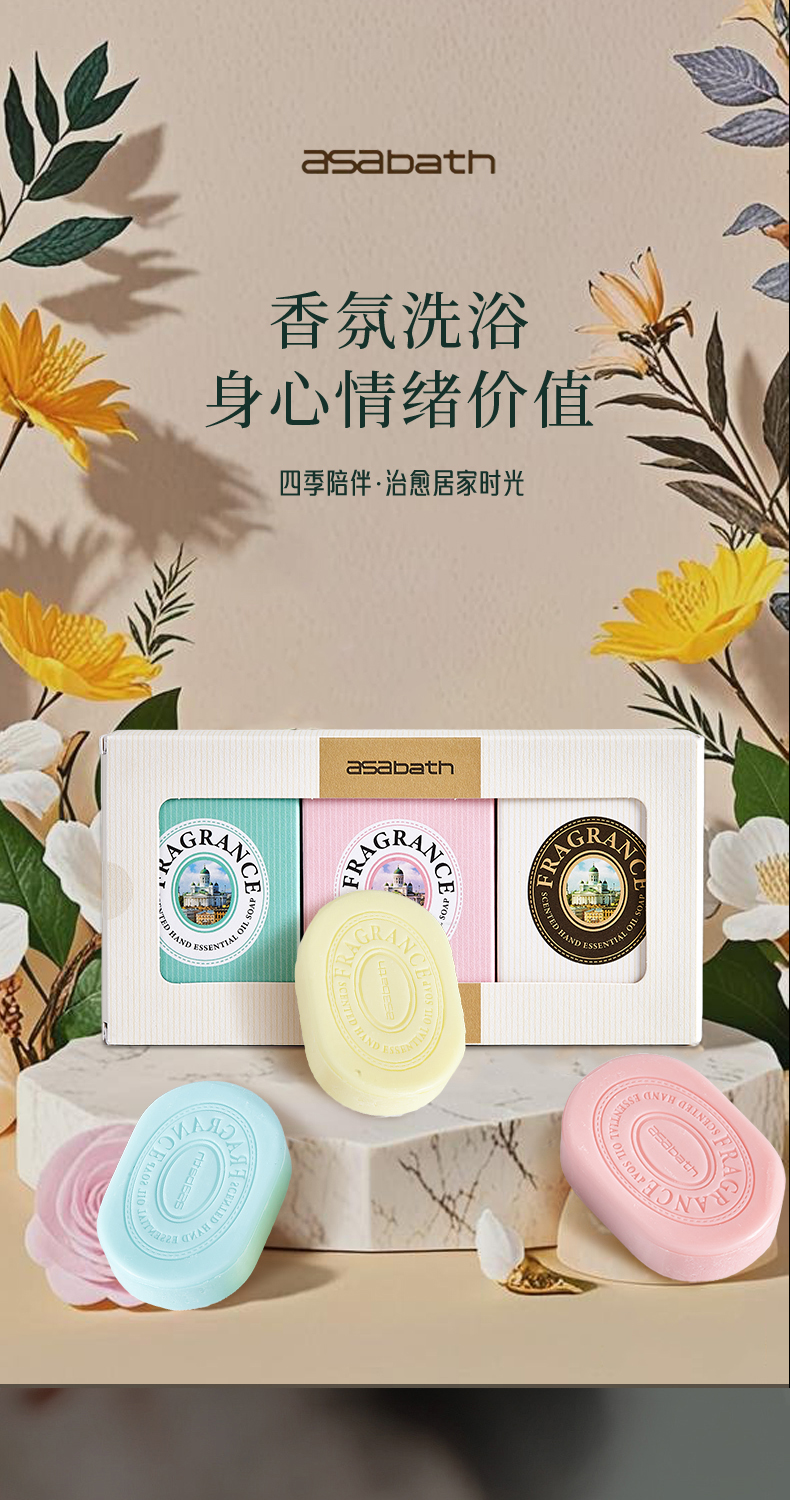 专属 asabath香氛精油皂 三种香型:花香冰洋、甜香晚樱、宁静纯幼 一块精油皂=香水+清洁 礼盒包装 送3个气泡网 128g*3/礼盒