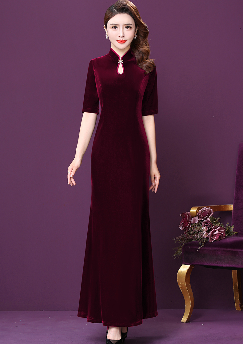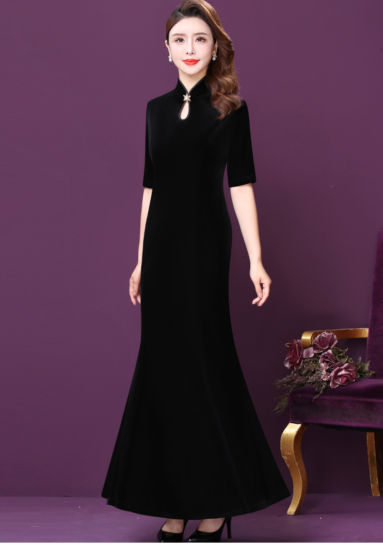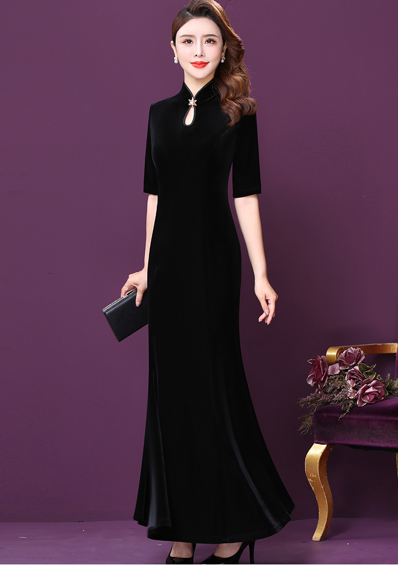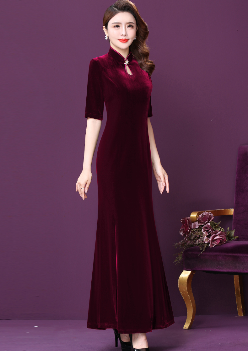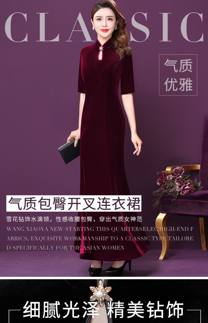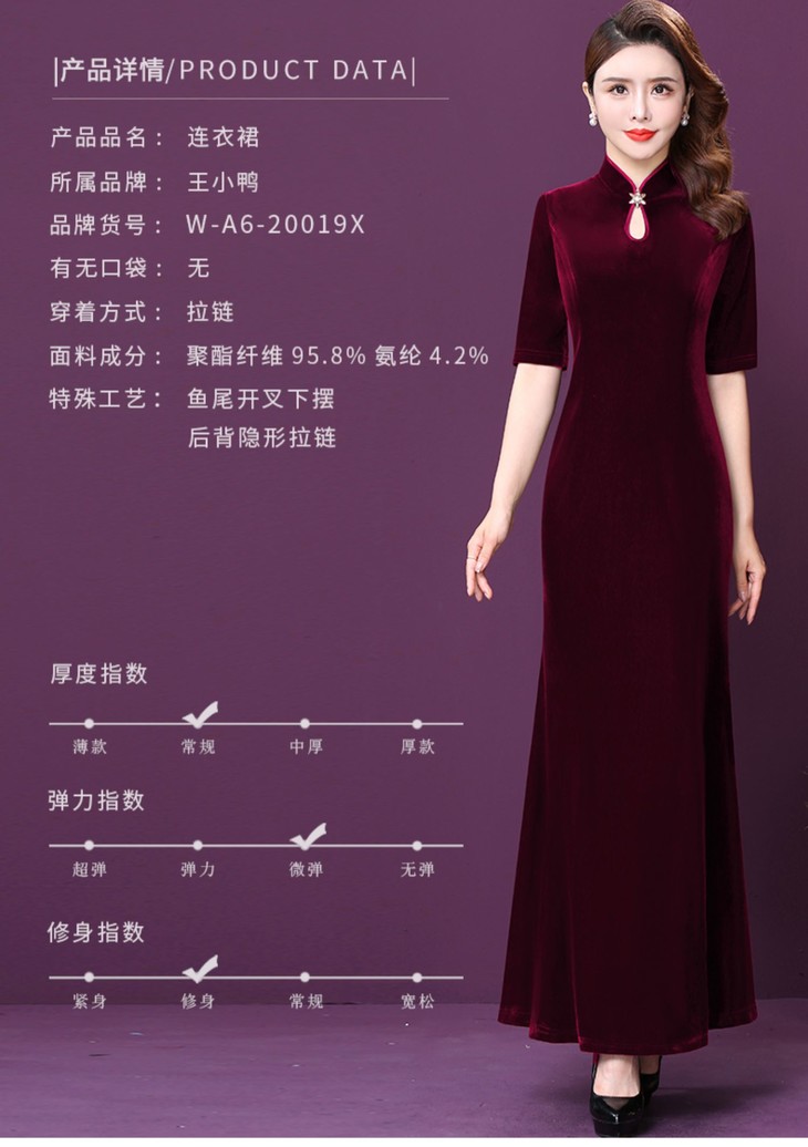 WXY-A6-20019X新款时尚优雅气质修身立领短袖长款金丝绒包臀礼服裙