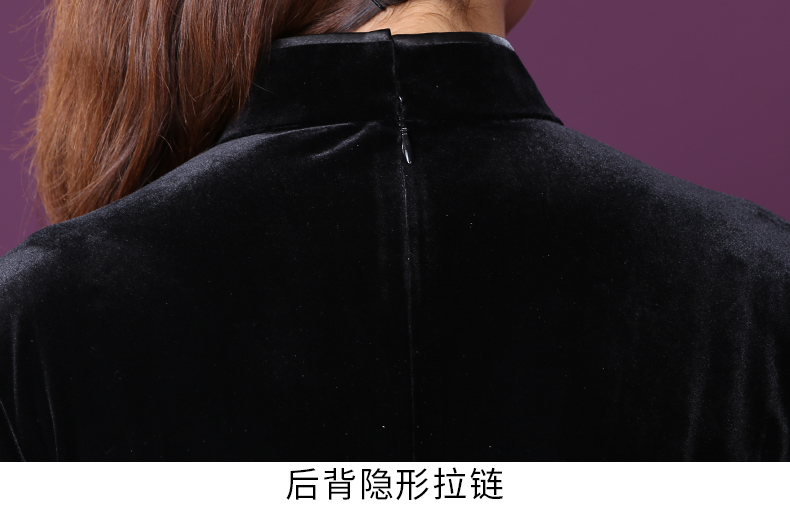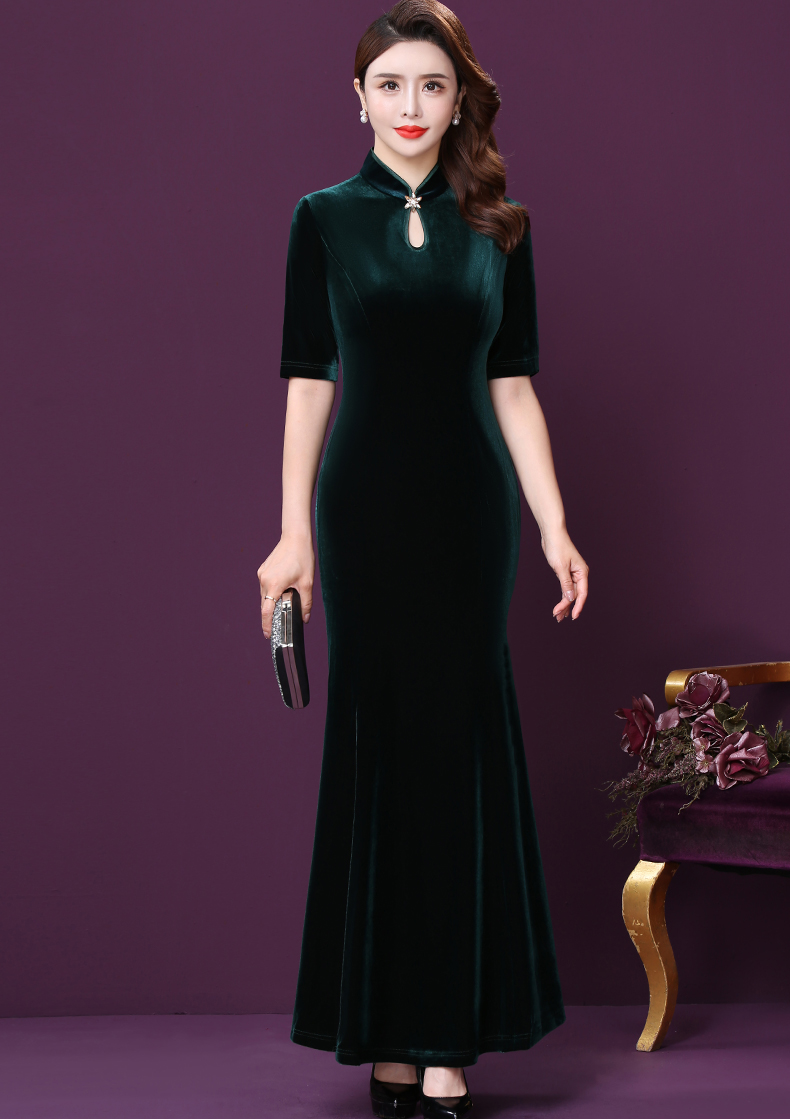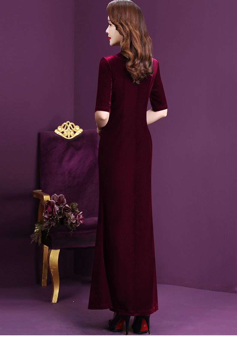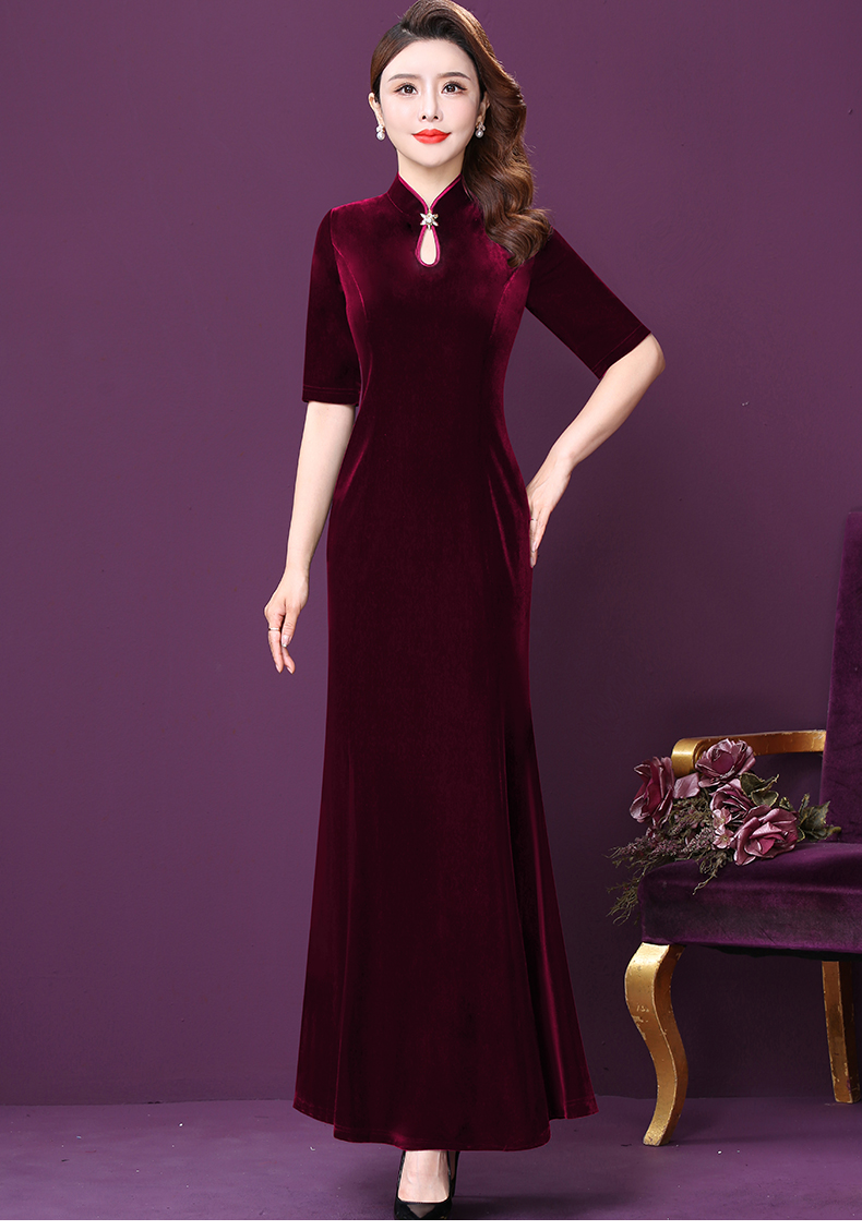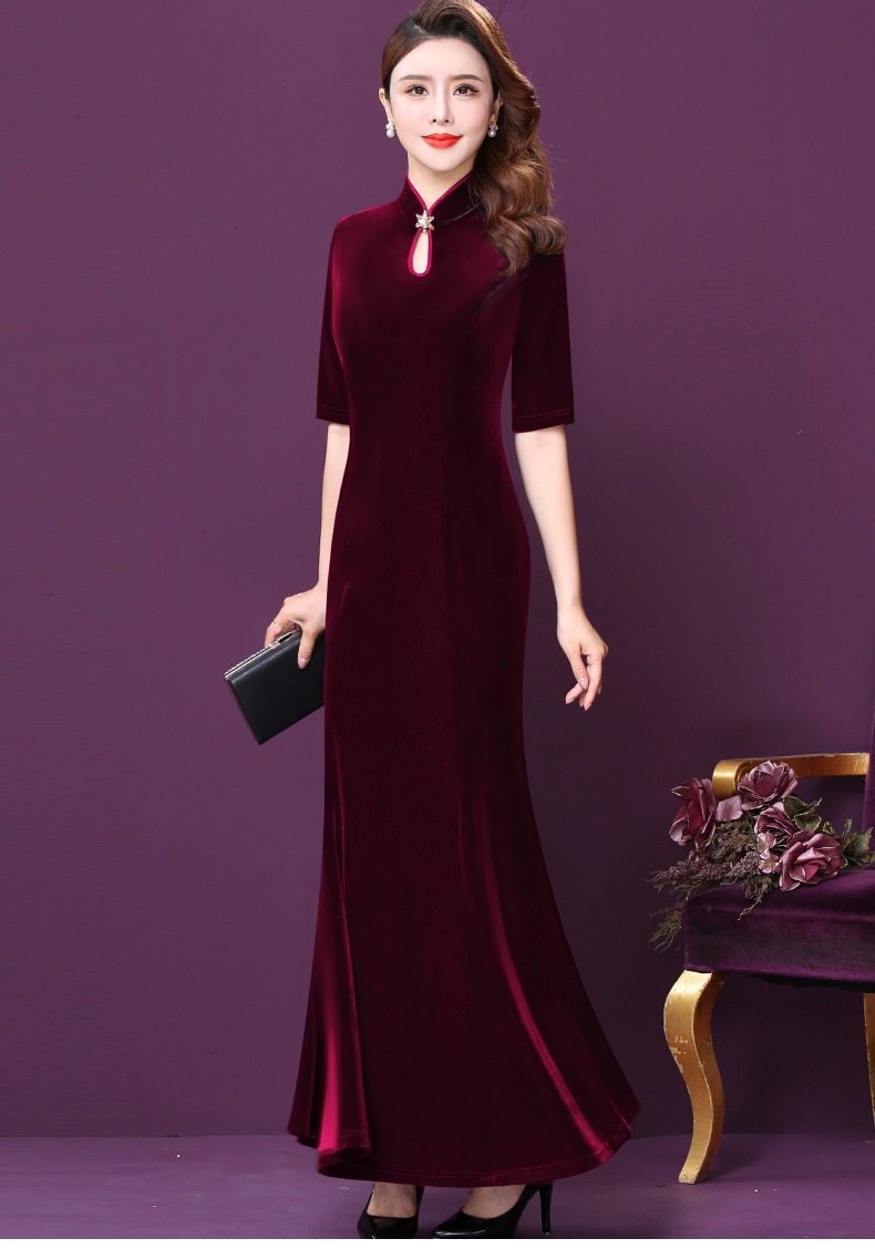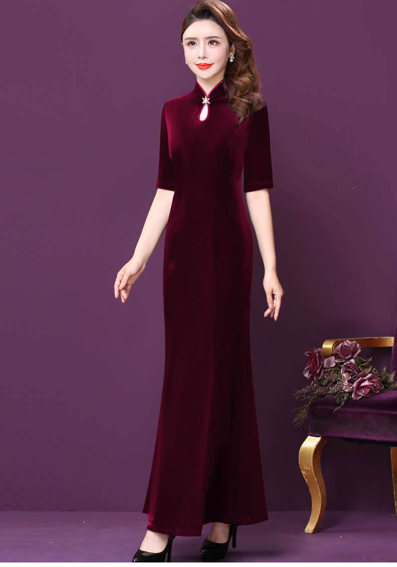 WXY-A6-20019X新款时尚优雅气质修身立领短袖长款金丝绒包臀礼服裙