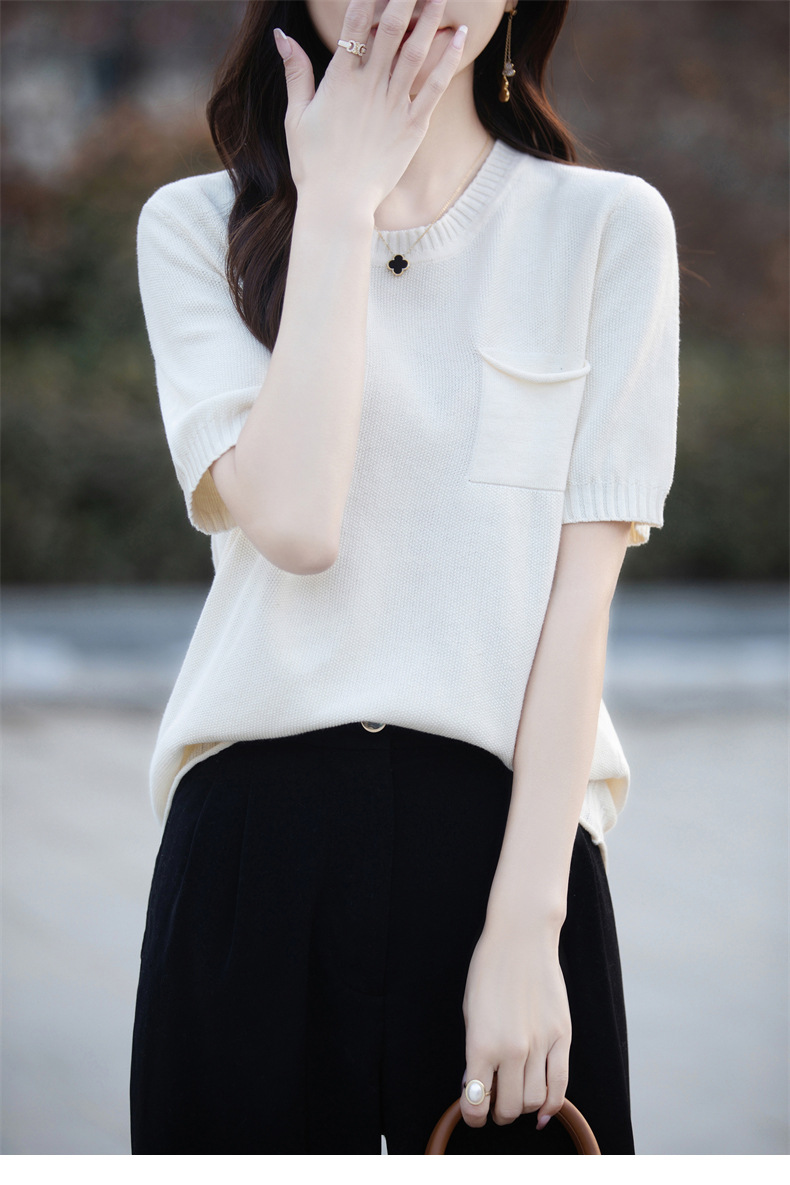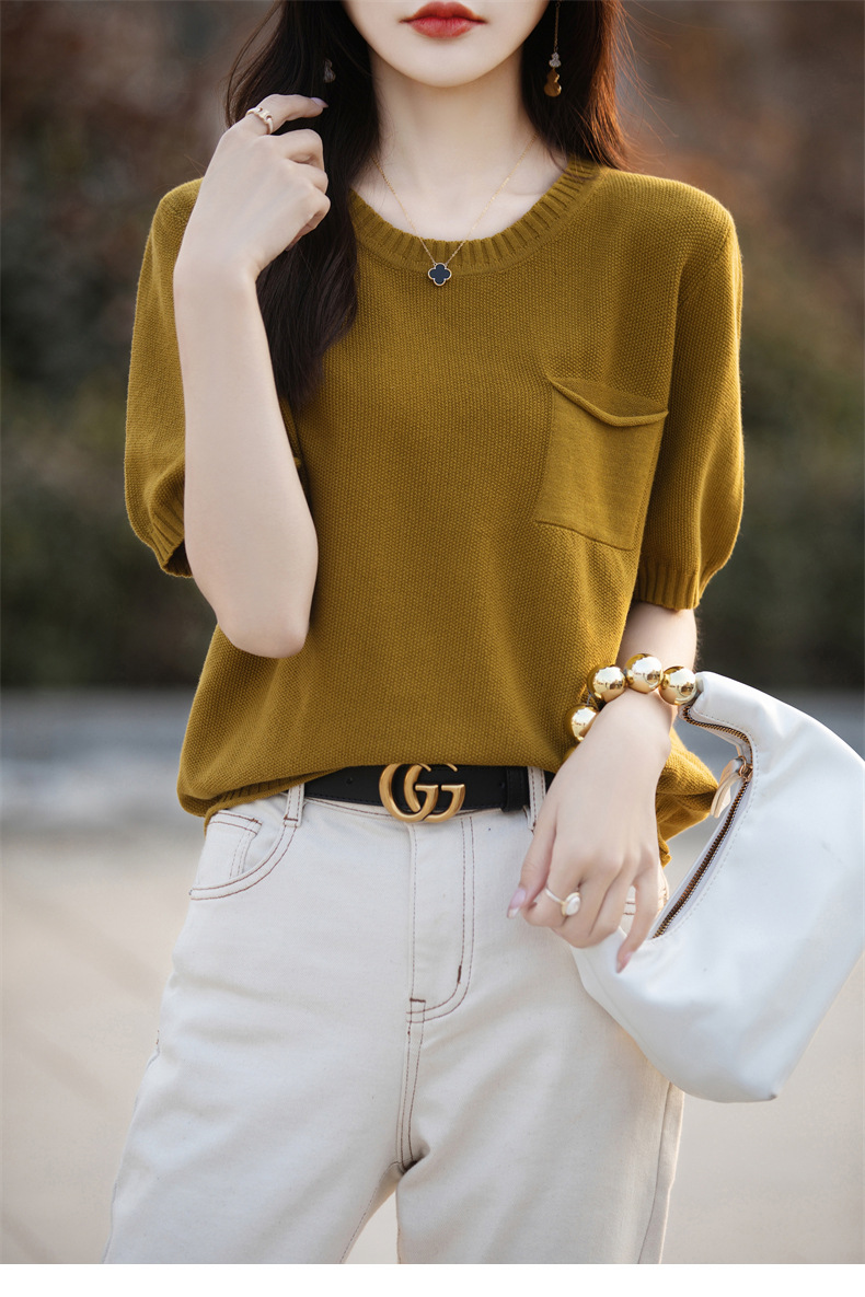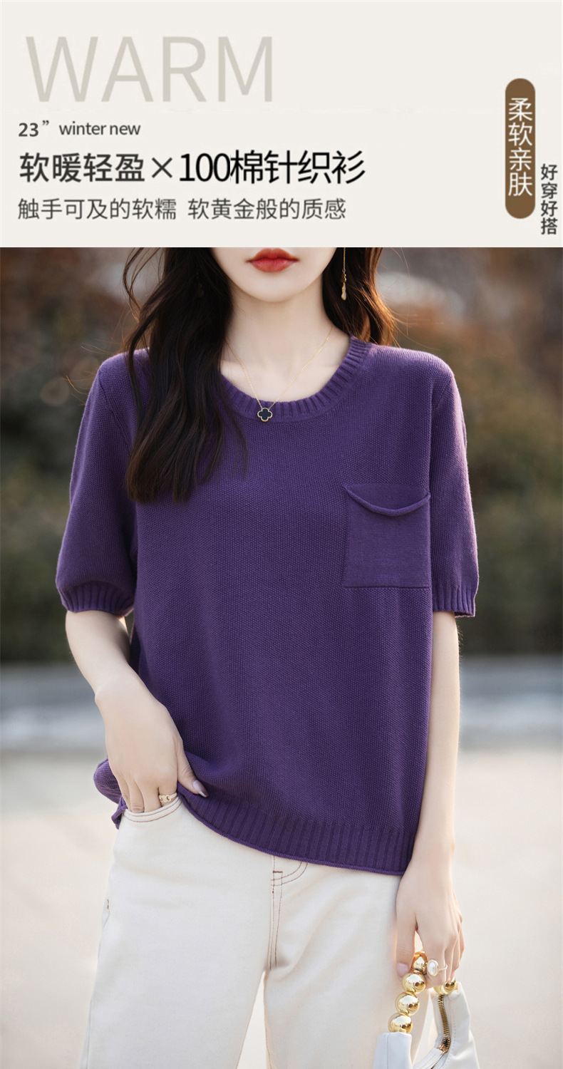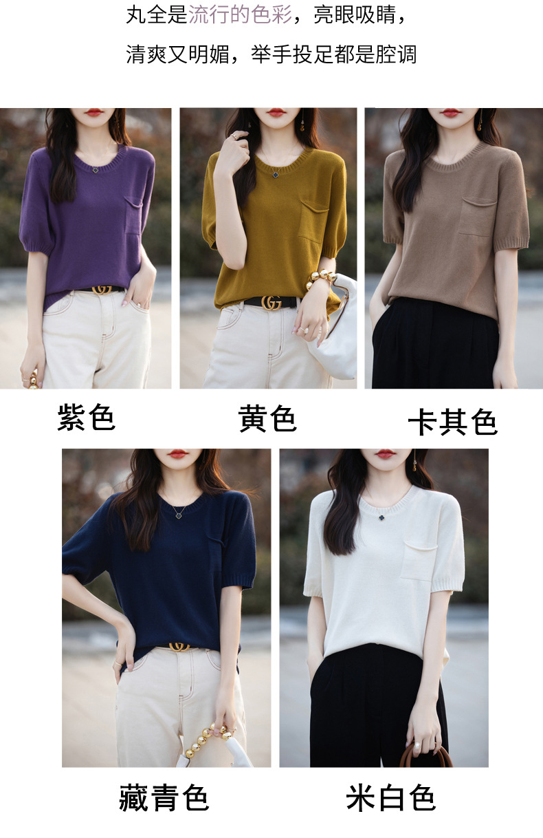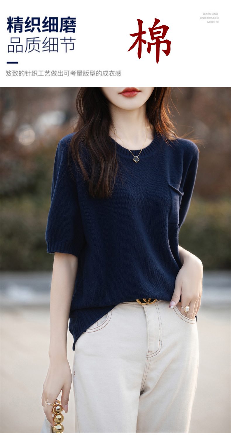 QHJY-83JY996夏季新款精纺100棉线针织短袖女圆领五分袖带兜t恤半袖打底衫