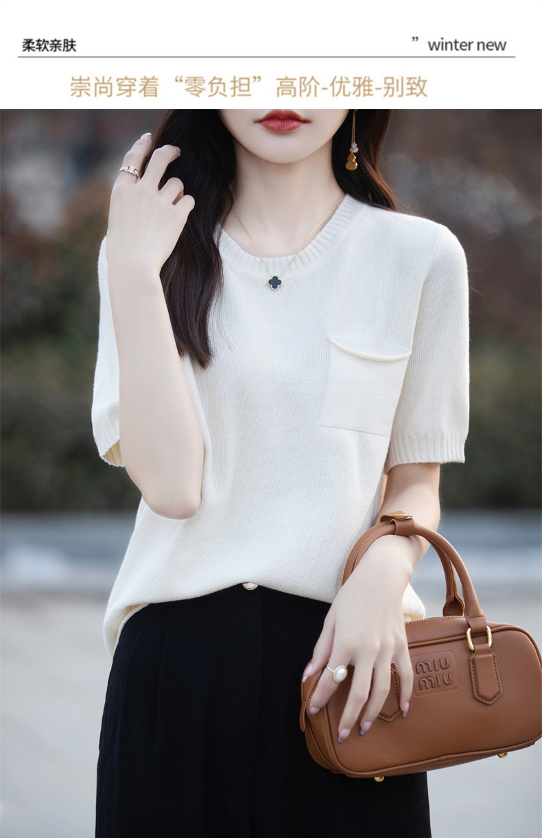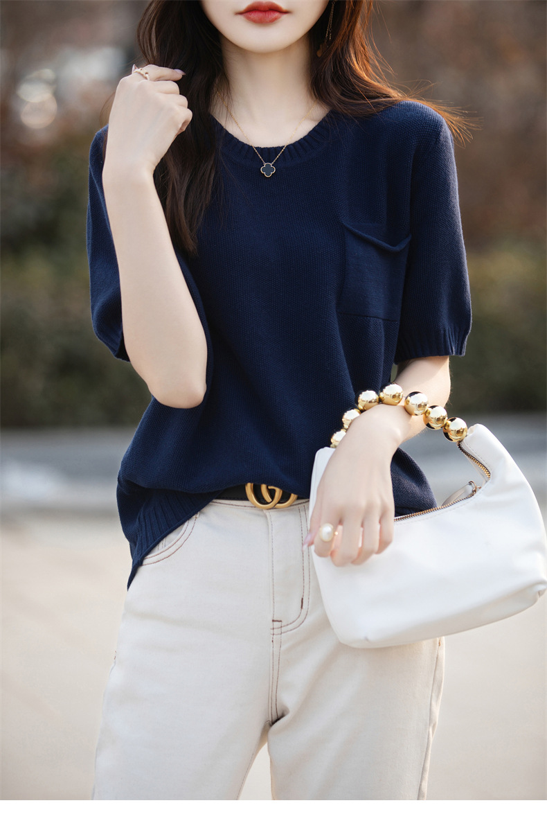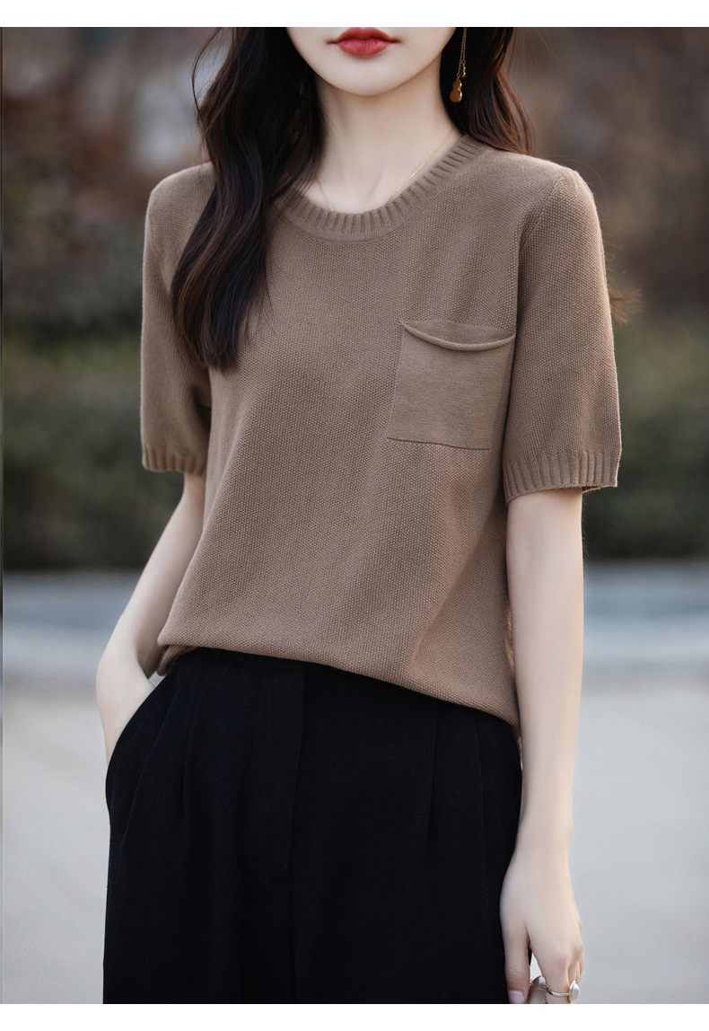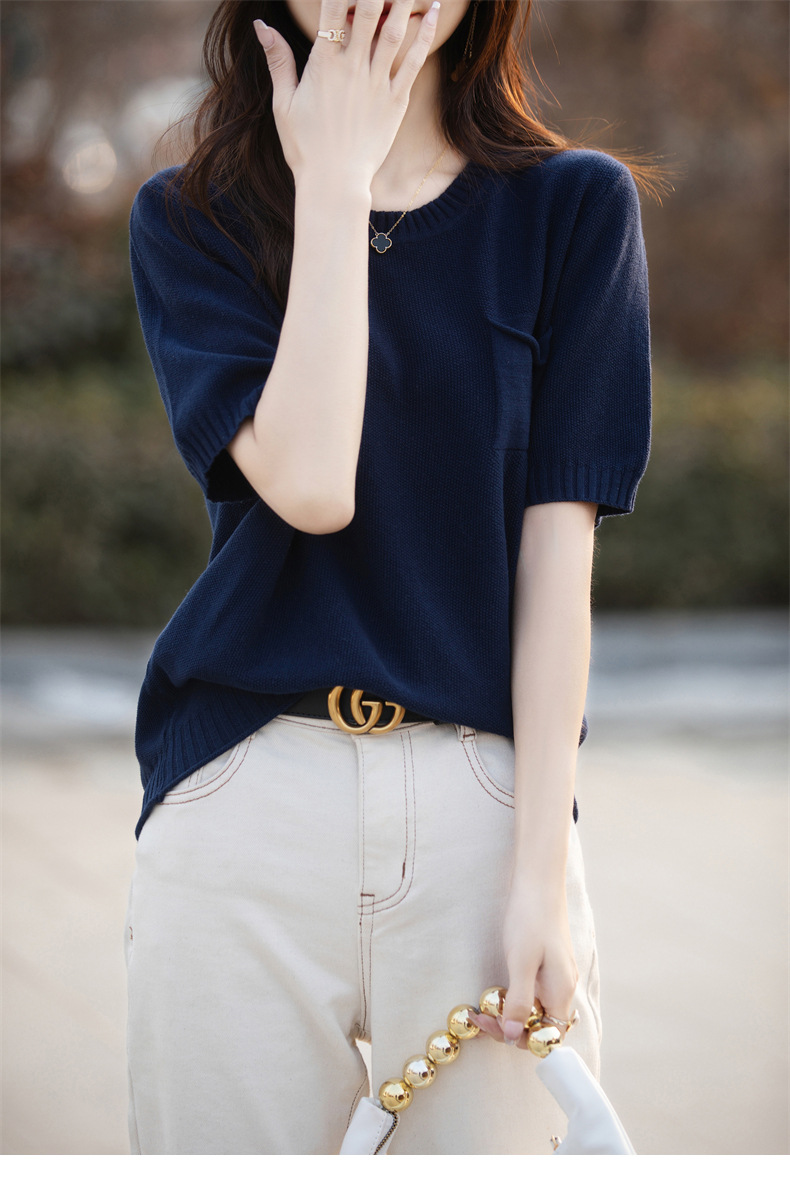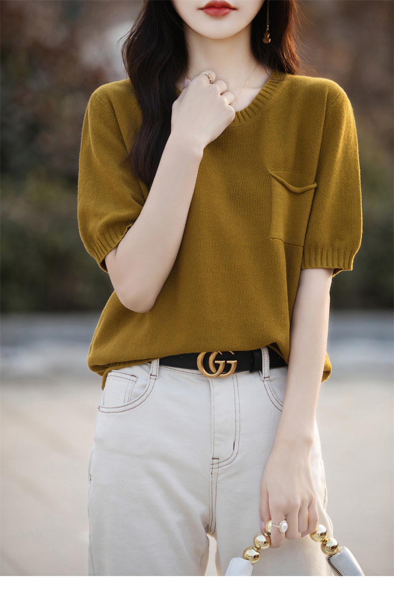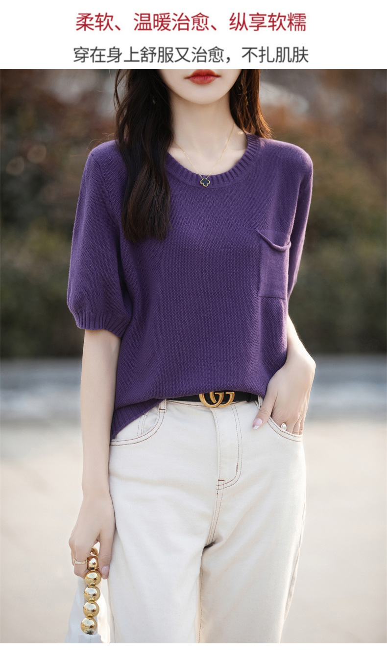 QHJY-83JY996夏季新款精纺100棉线针织短袖女圆领五分袖带兜t恤半袖打底衫
