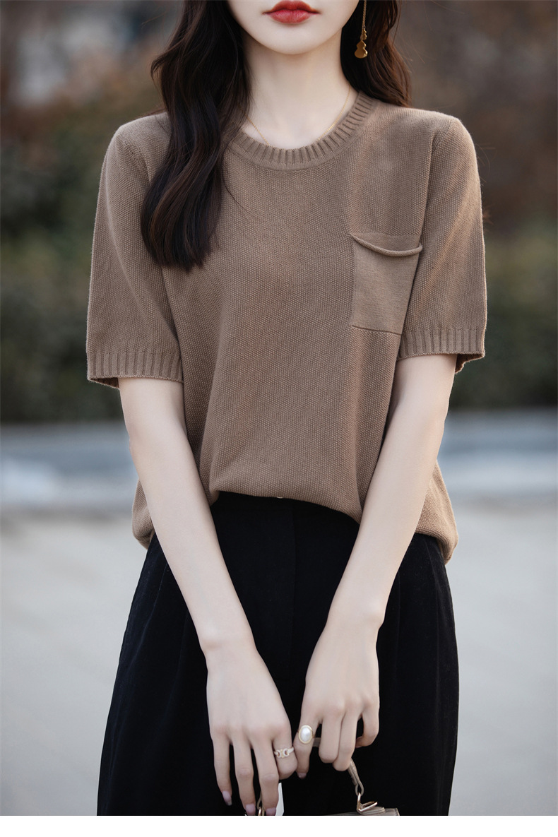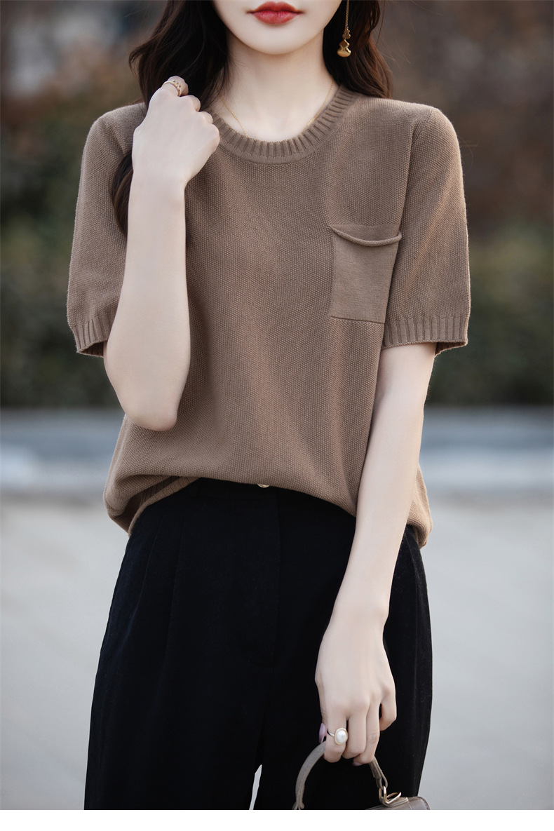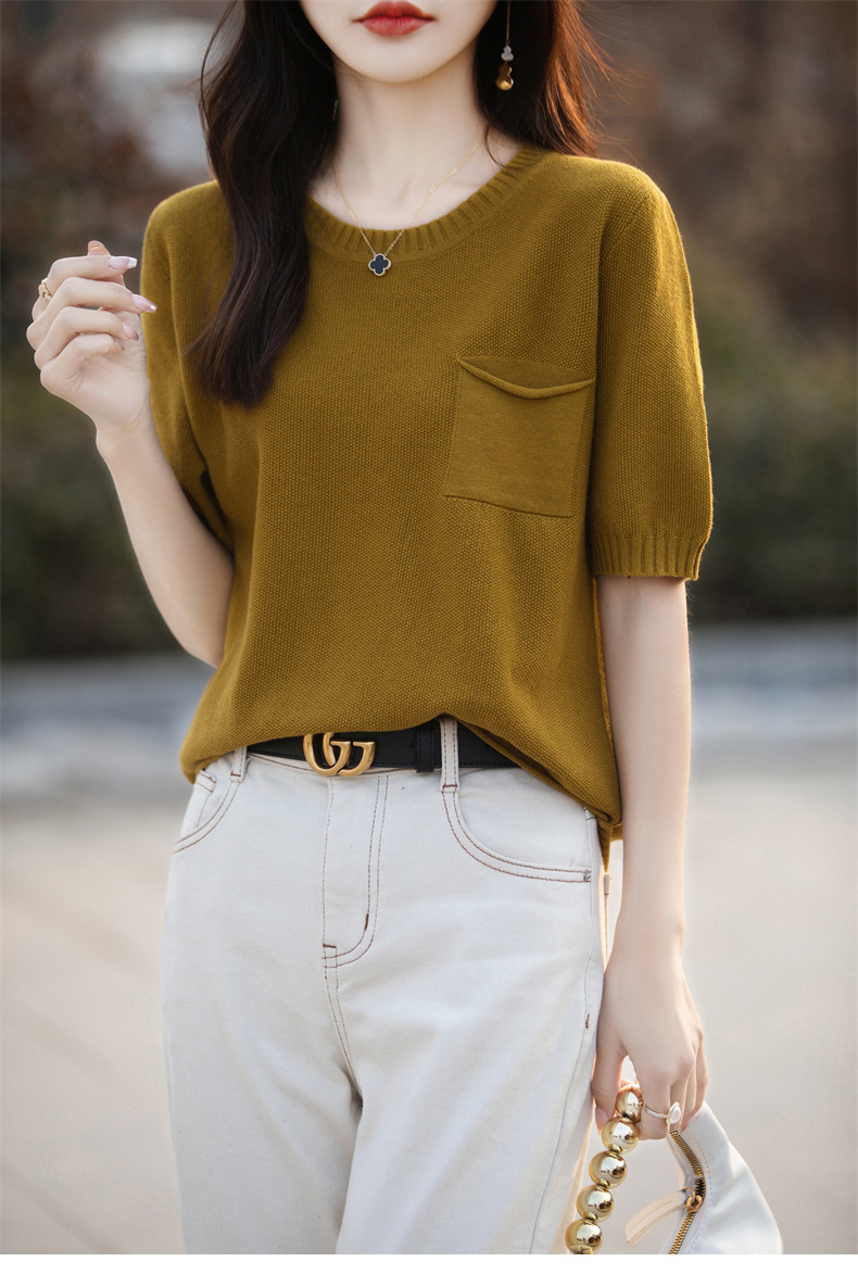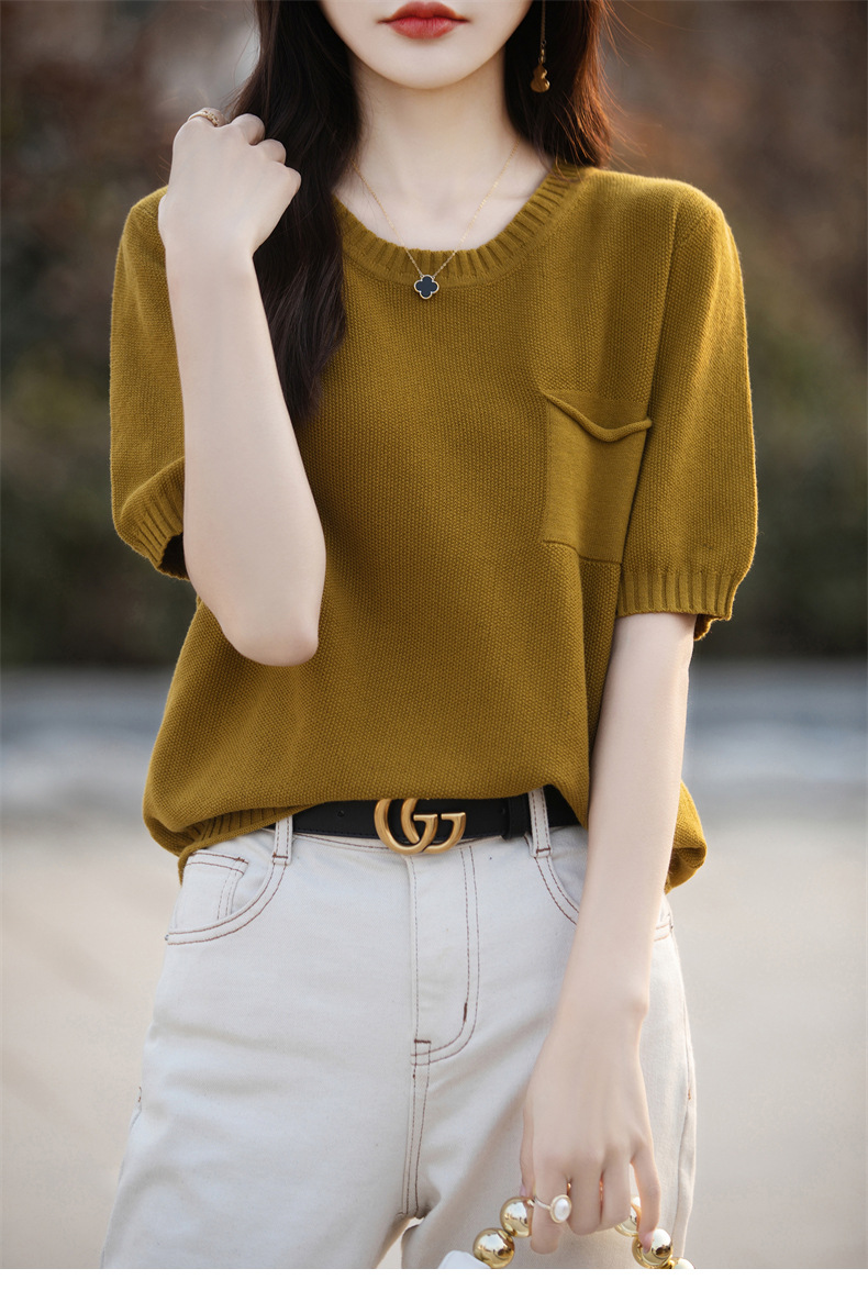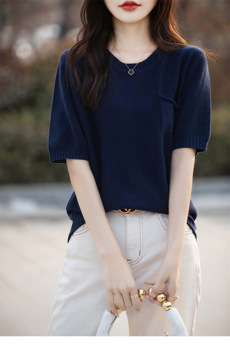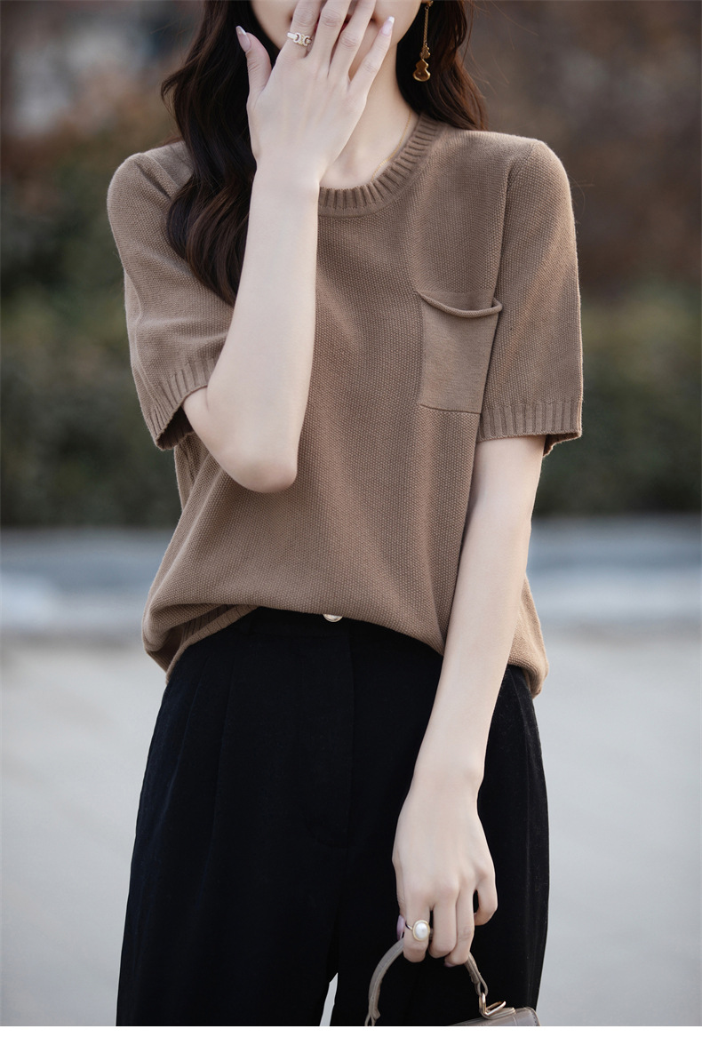 QHJY-83JY996夏季新款精纺100棉线针织短袖女圆领五分袖带兜t恤半袖打底衫