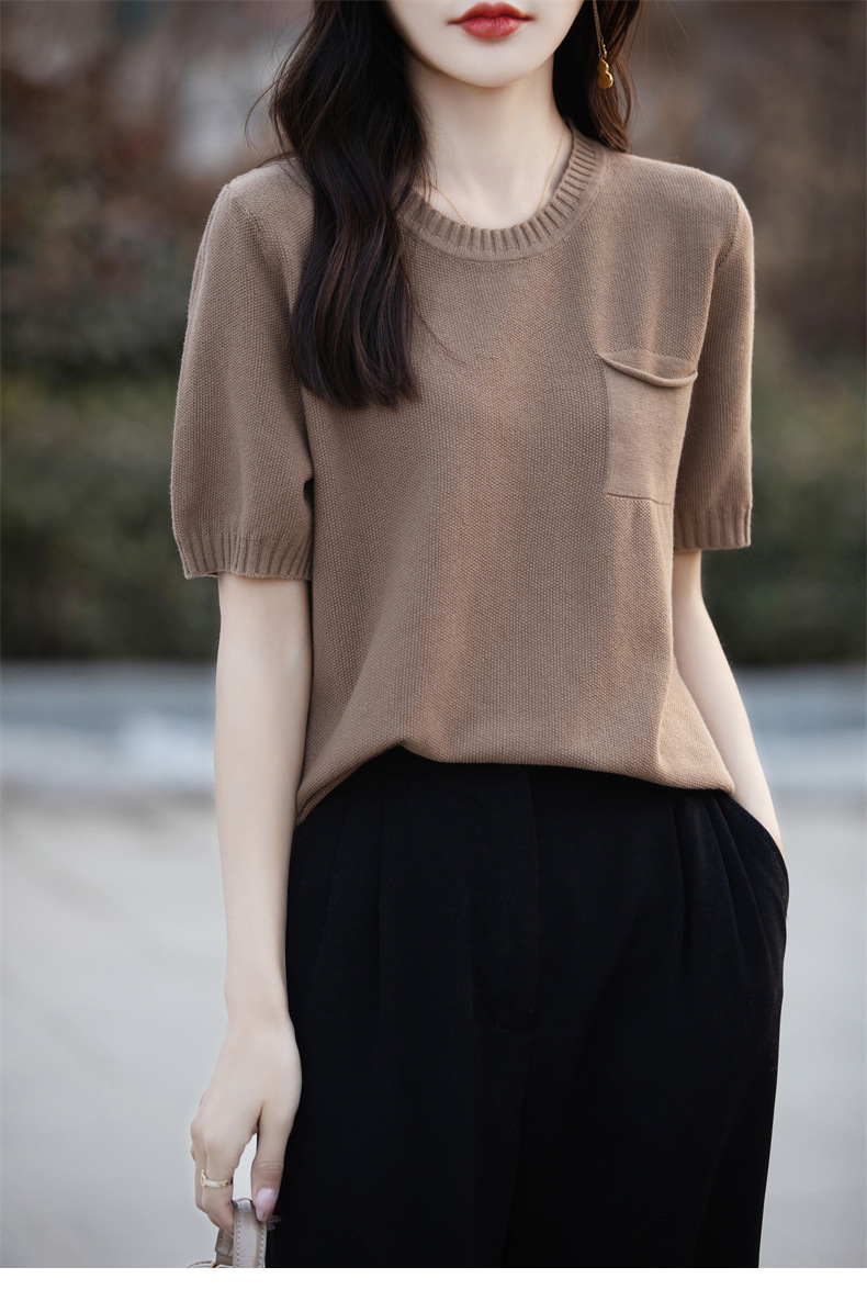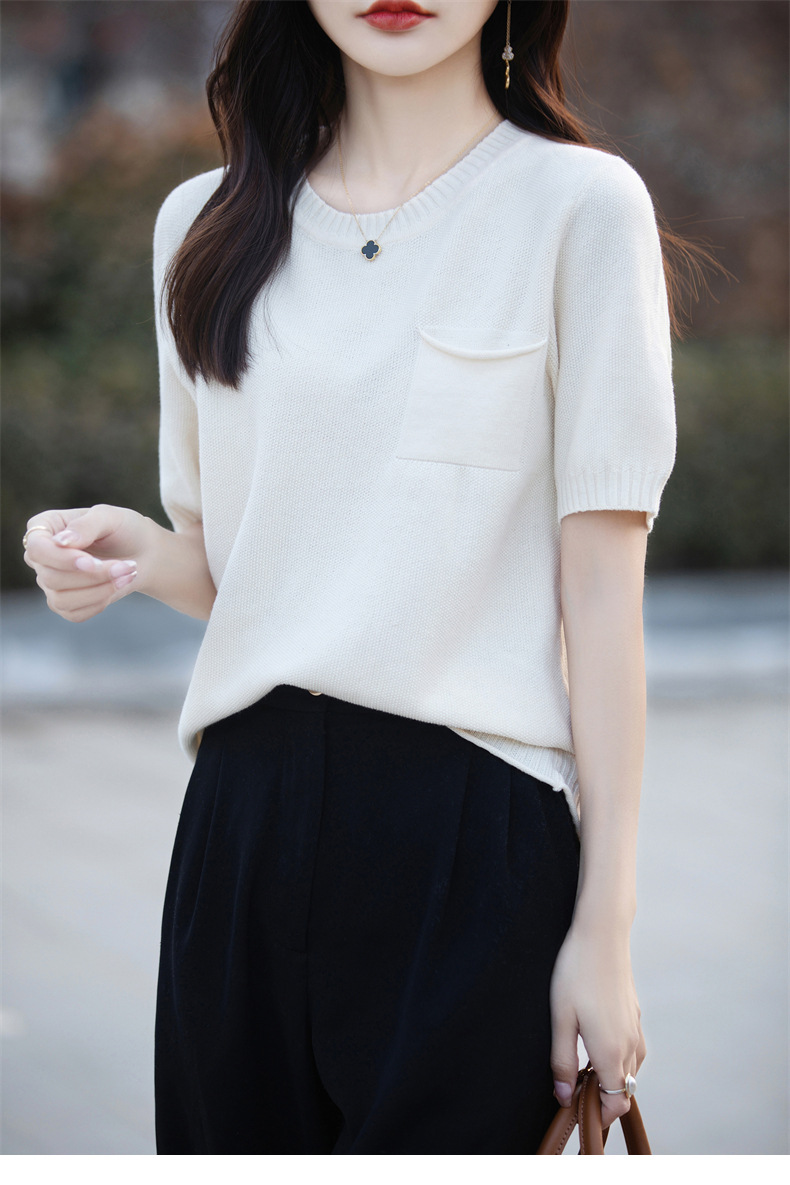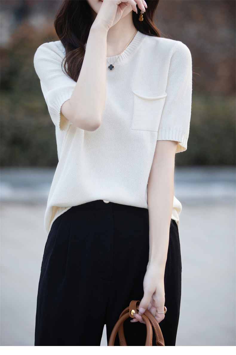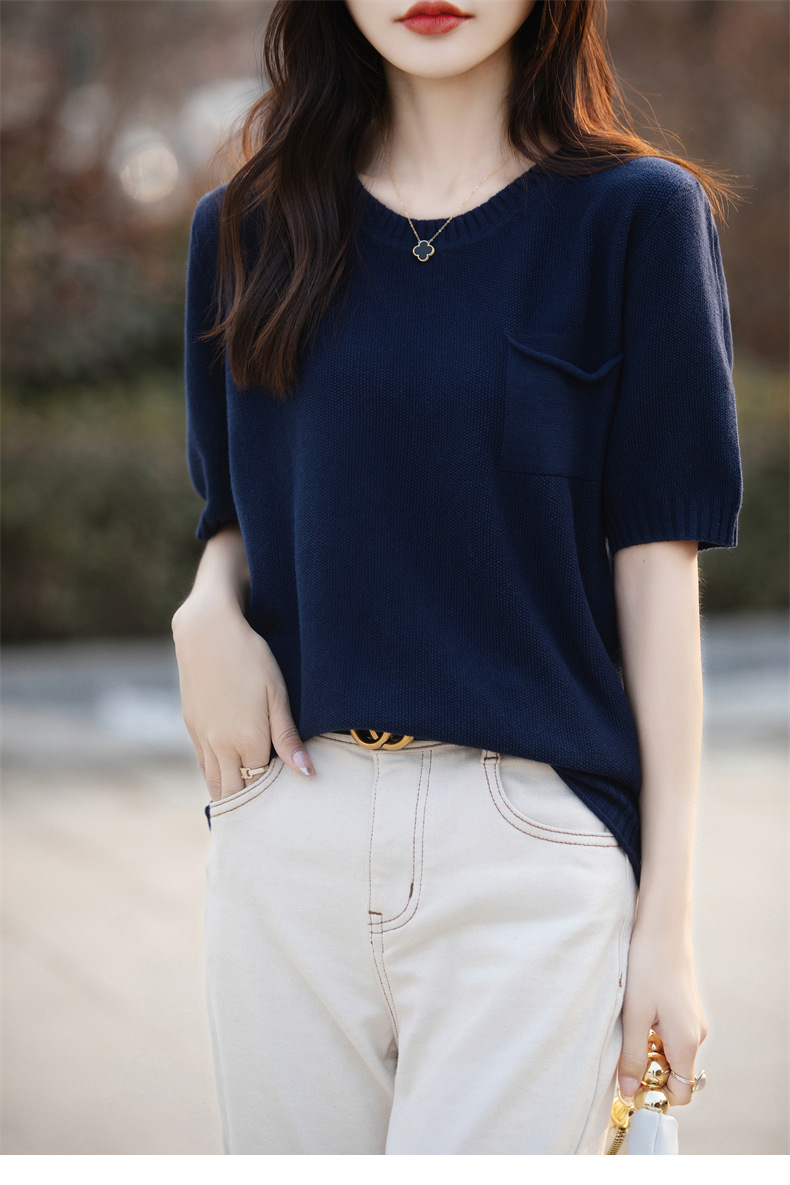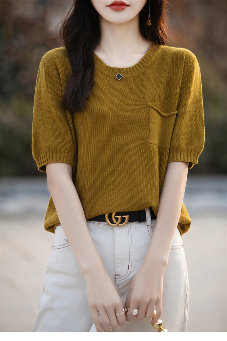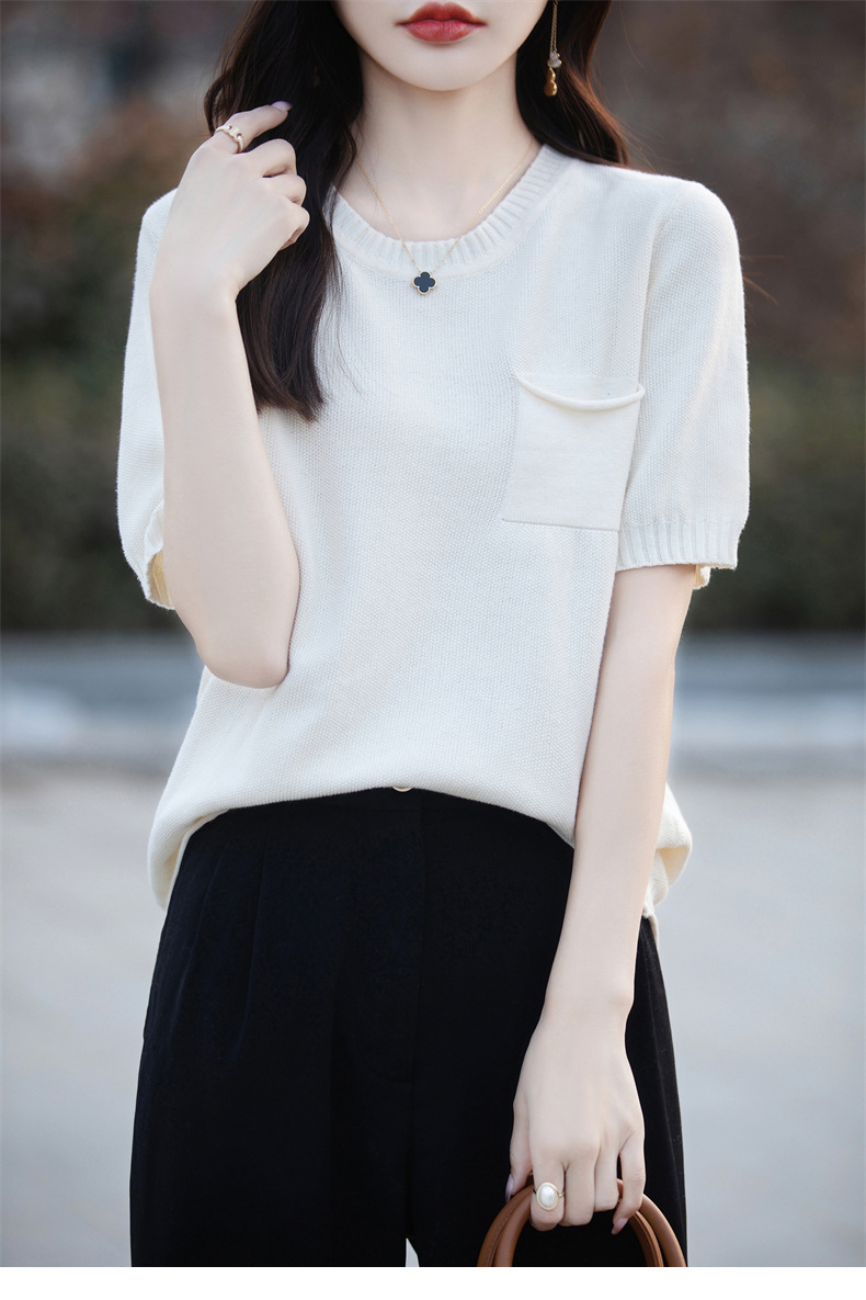 QHJY-83JY996夏季新款精纺100棉线针织短袖女圆领五分袖带兜t恤半袖打底衫
