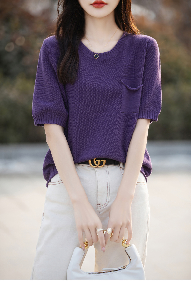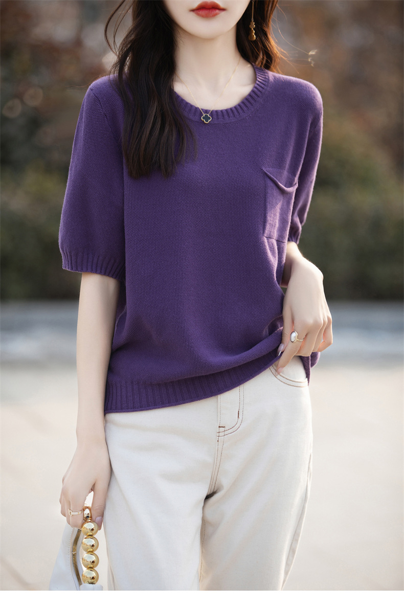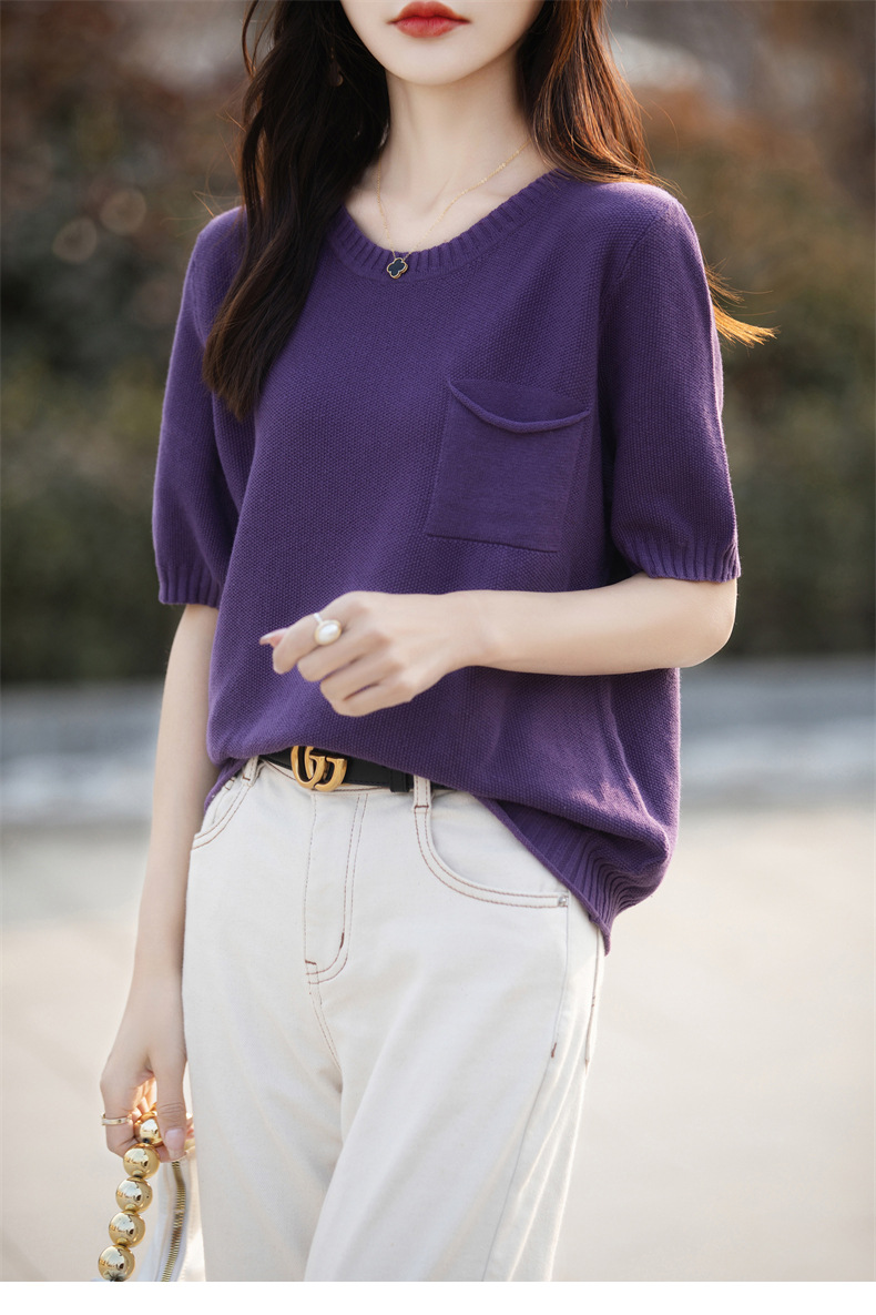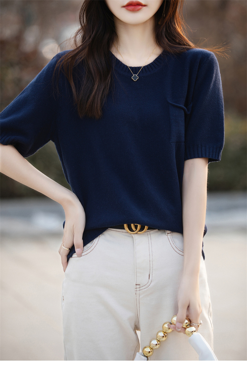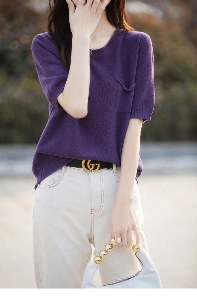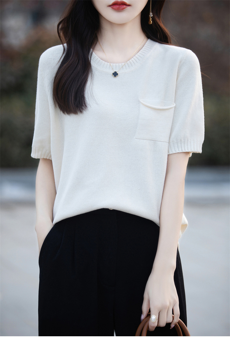 QHJY-83JY996夏季新款精纺100棉线针织短袖女圆领五分袖带兜t恤半袖打底衫