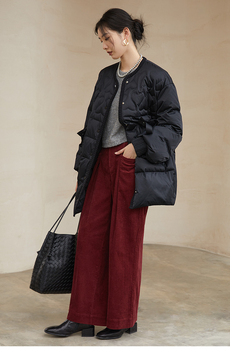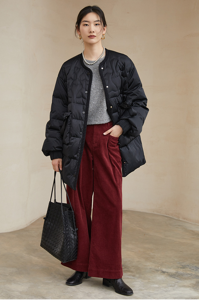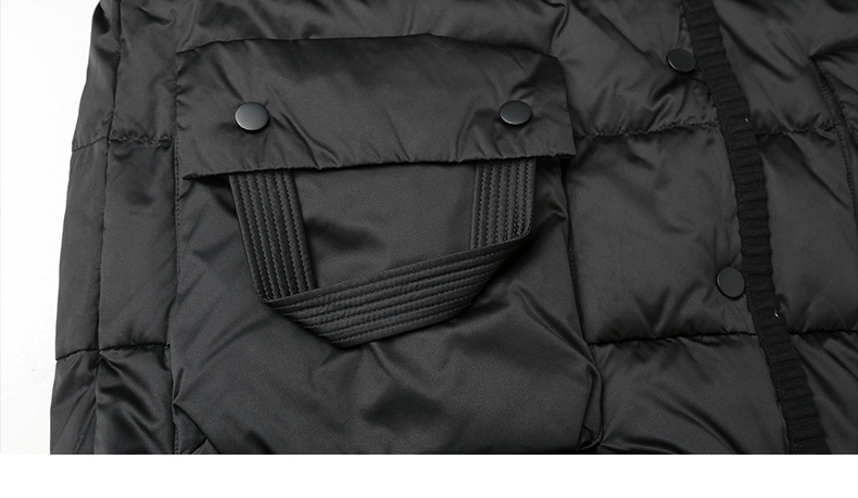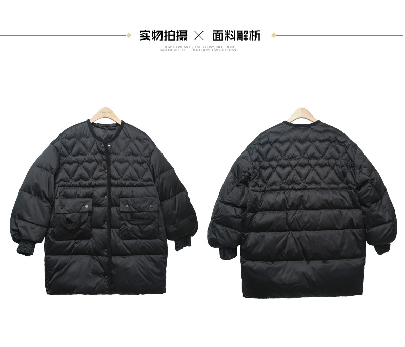 黑色爱心绗缝中长款羽绒服,多口袋设计 + 针织袖口 + 宽松版型,承包你深冬抗寒的时尚与保暖双在线穿搭