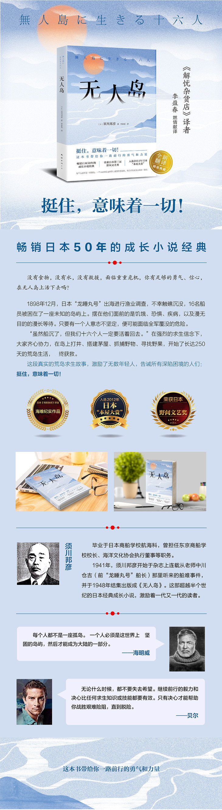 1941年,须川邦彦开始于杂志上连载从老师中川仓吉(前“龙睡丸号”船长)那里听来的船难事件,并于1948年结集出版成《无人岛》。这部***半个世纪的日本经典成长小说,激励着一代又一代的读者。