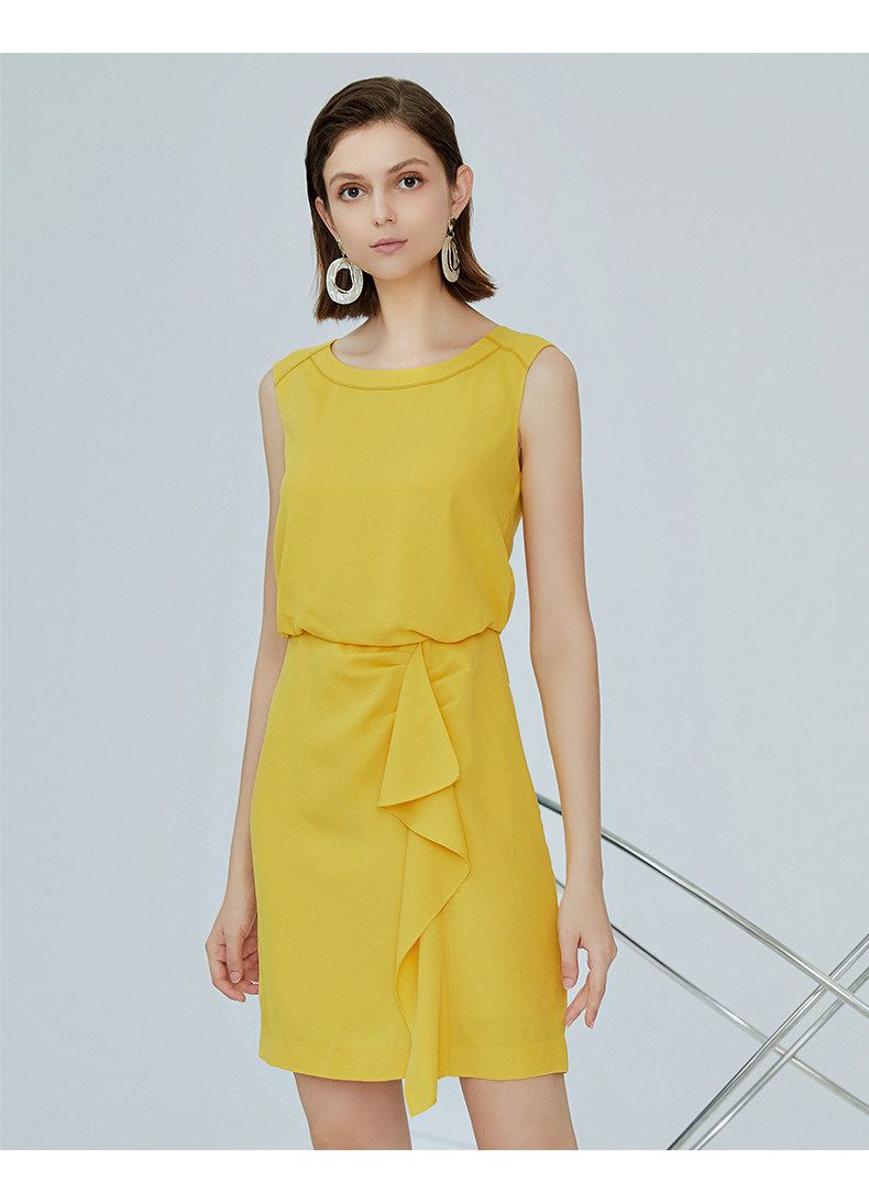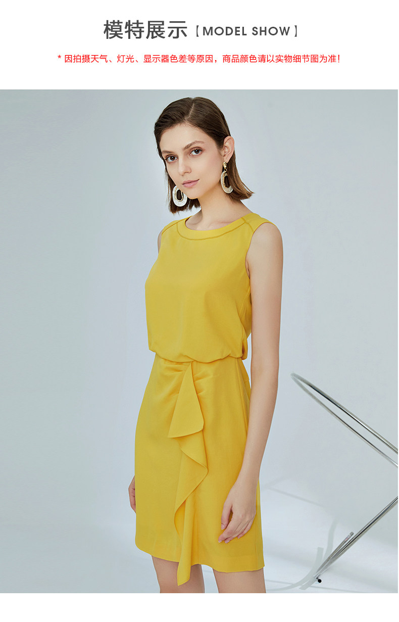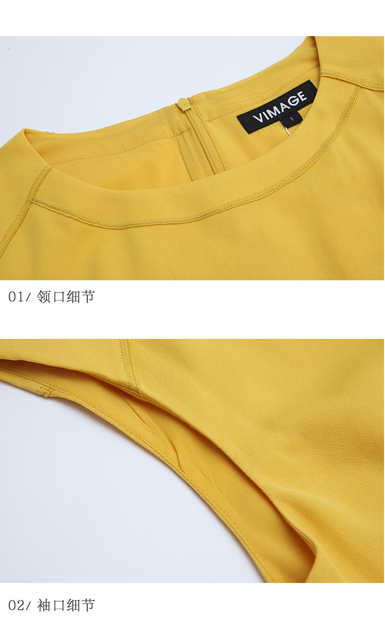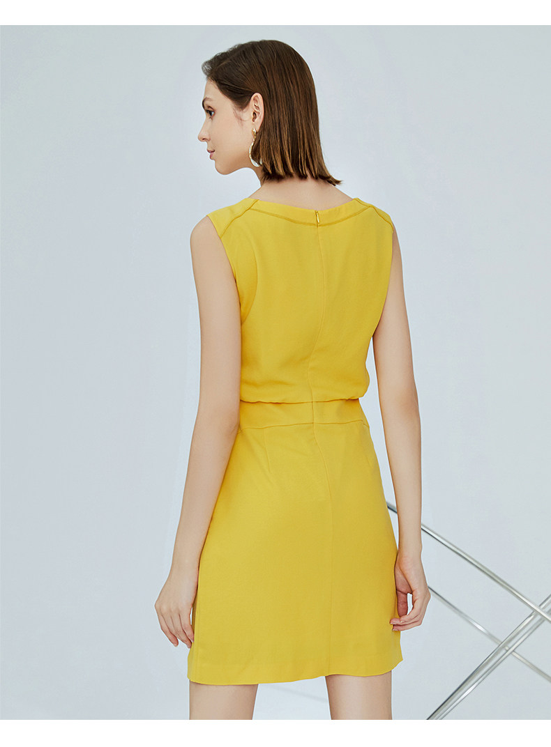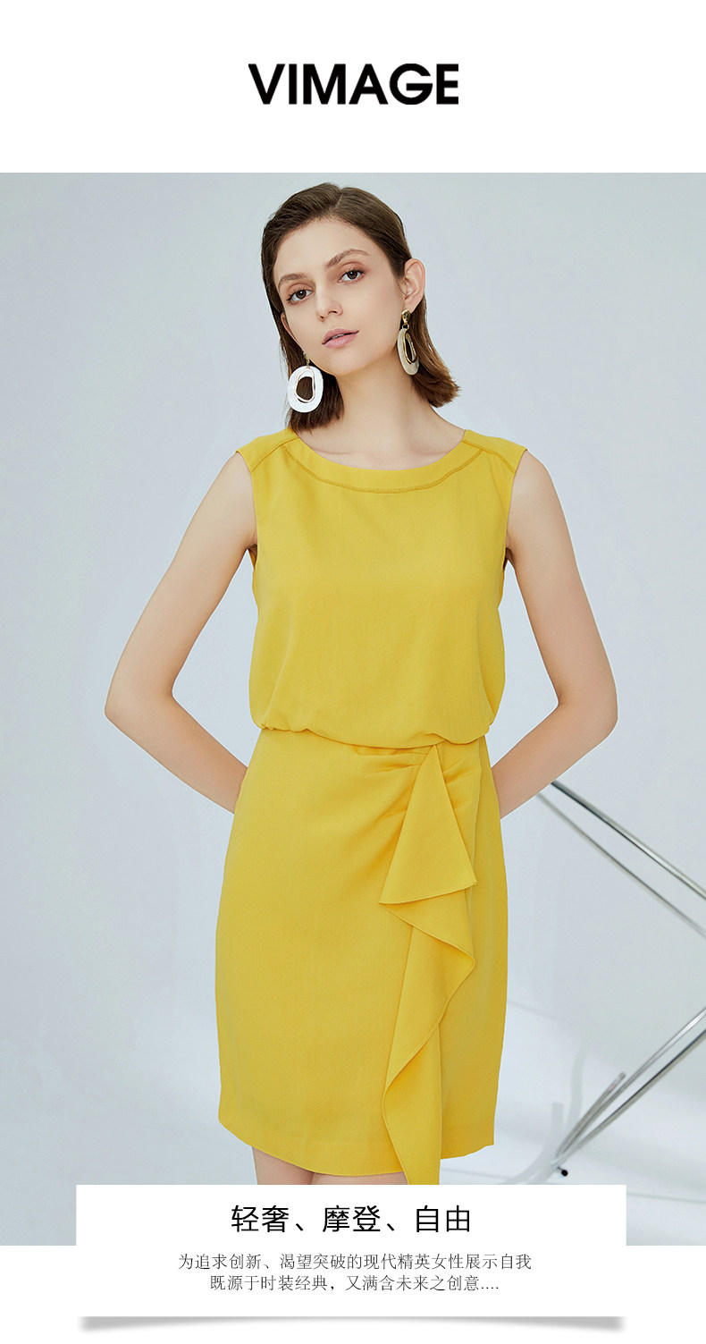 vimage纬漫纪夏季新款时尚高冷御姐风无袖圆领连衣裙黄色气质裙子V1107747