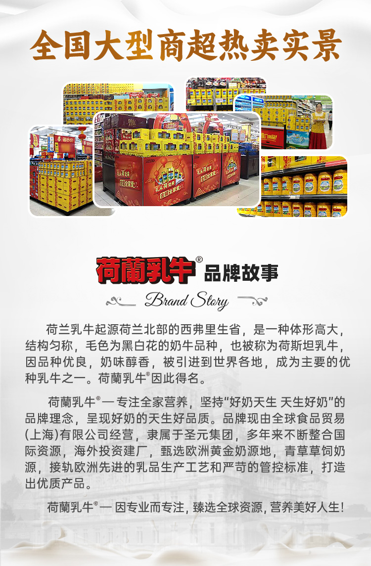 - 荷兰乳牛品牌于1990年进入中国,相伴31年始终致力于为更多家庭奉上优种荷兰乳牛带来的营养与美味。秉承“珍选至纯营养,传承经典醇香”的理念,打造一个覆盖全人群、多品类、高品质的国际化品牌。